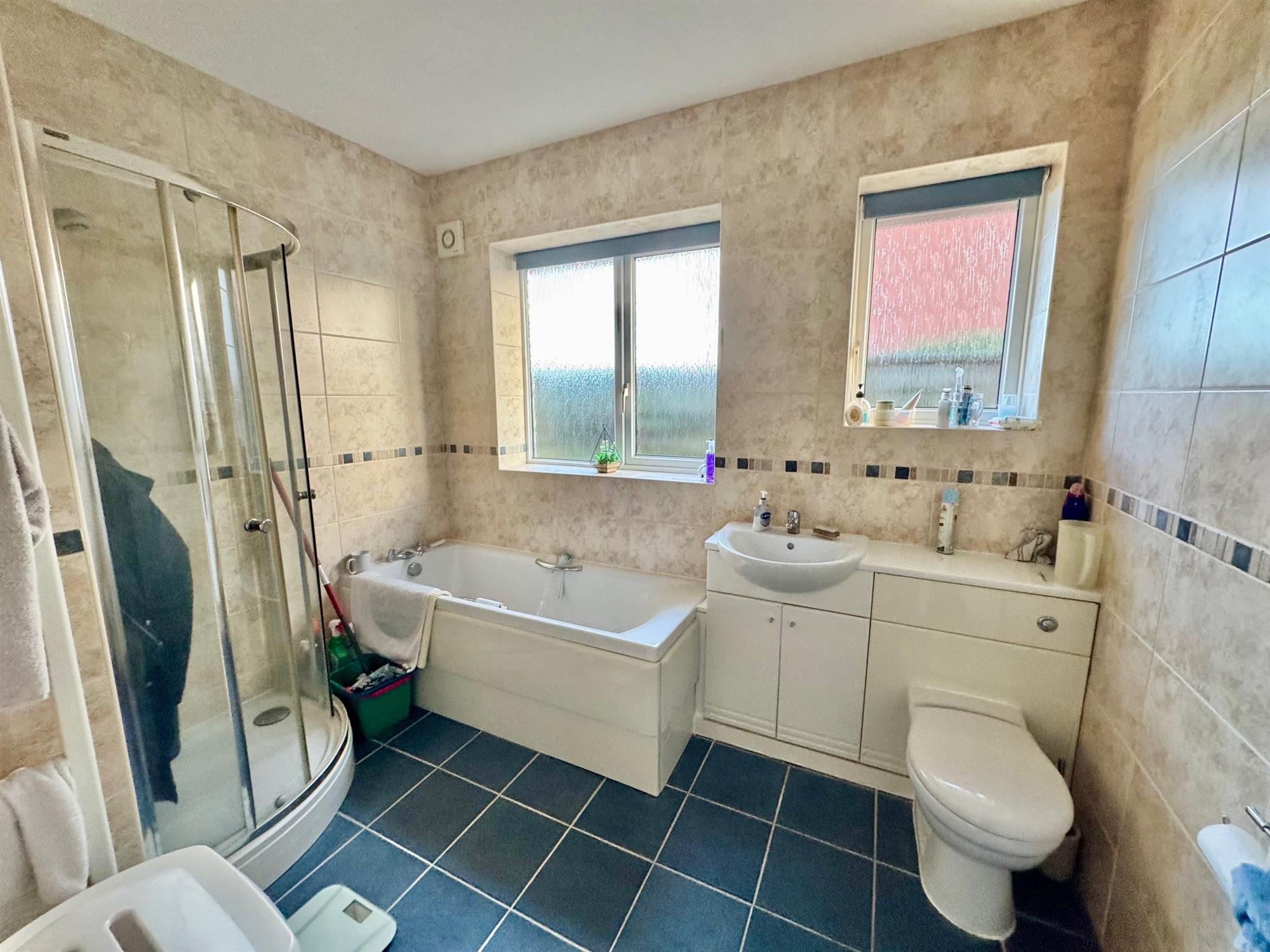 A large bathroom with two opaque double glazed windows to the side. Panelled bath with mixer tap. Corner shower cubicle with built-in shower. Wash hand basin with mixer tap. Low level enclosed flush WC. Walls in full tiled surround. Tiled floor. Two White runged radiators. Extractor fan. Light with shaver point.