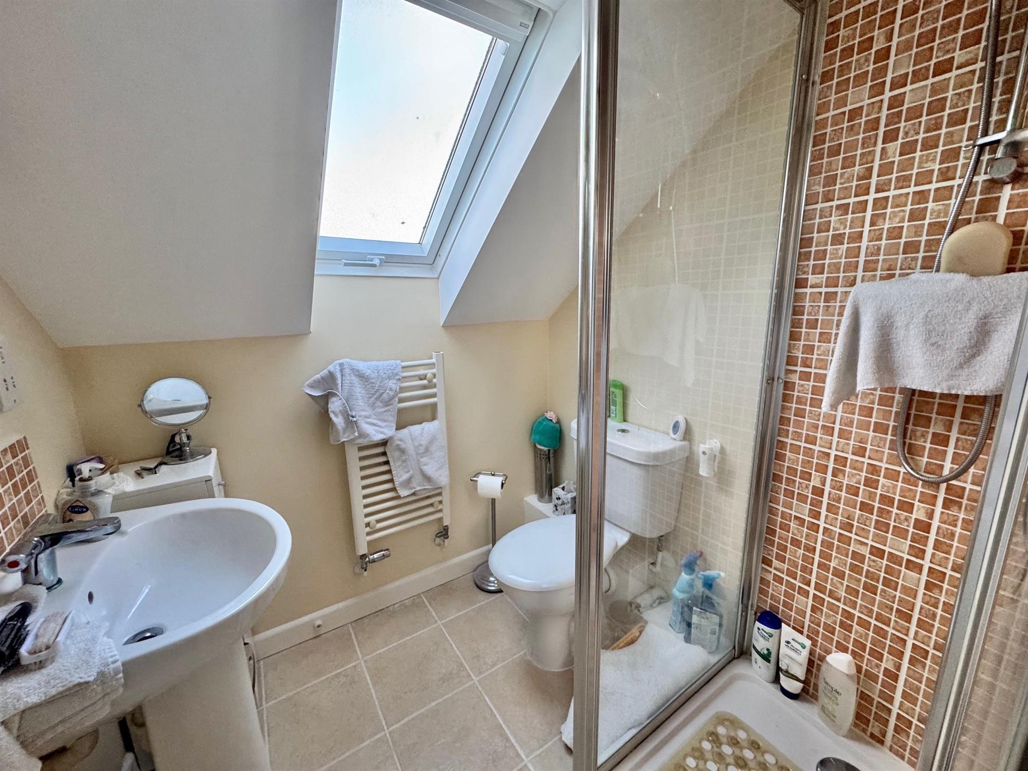 White suite comprising corner cubicle with a built-in shower with split-fold glass door. Low level WC. Pedastal wash hand basin with mixer tap. Shaver point. Opaque double glazed Velux window to the side. Tiled floor. White runged radiator.