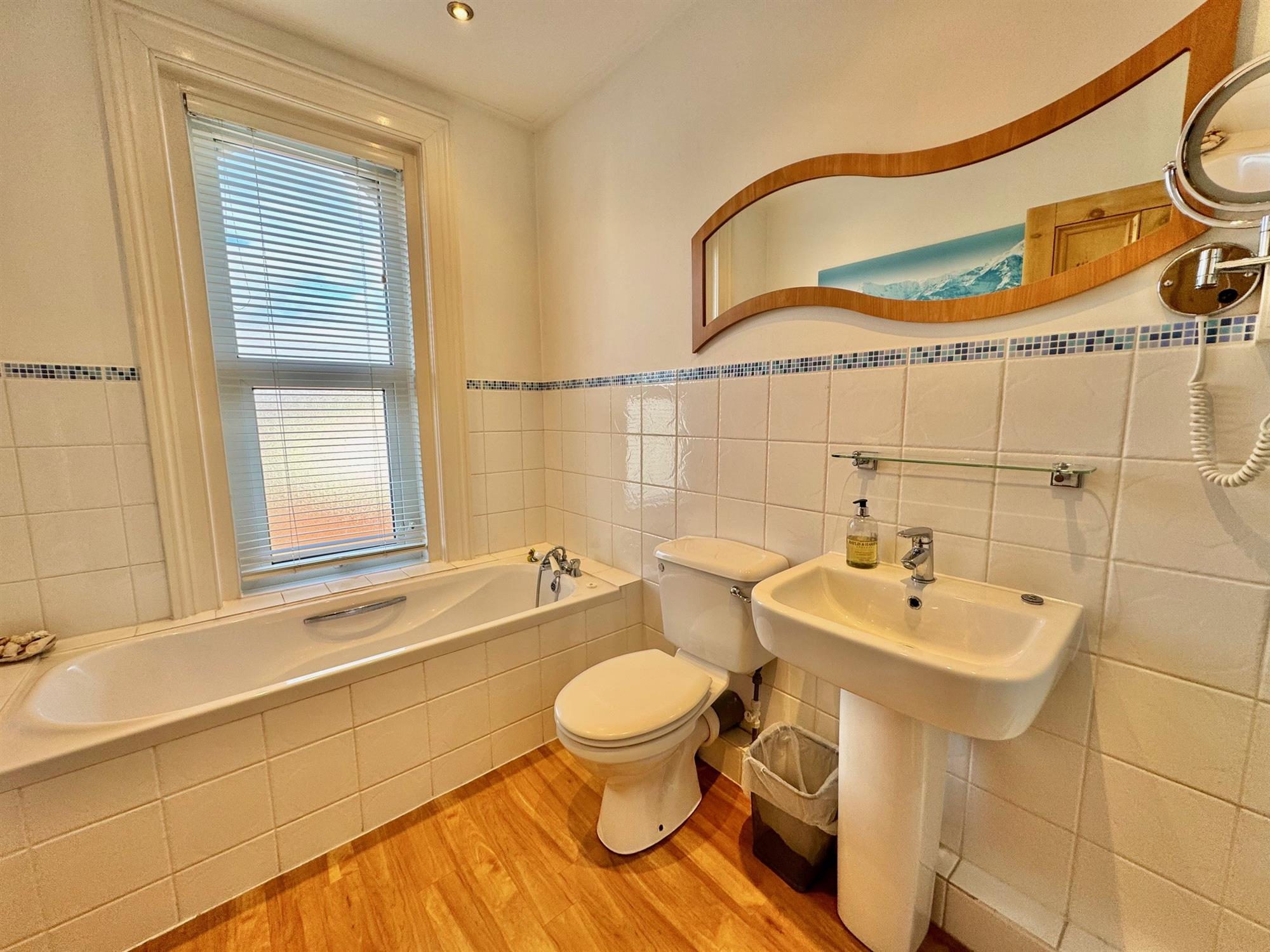 Tiled panelled bath with mixer shower tap in tiled surround. Low level WC. Pedestal wash hand basin with mixer tap. Fully tiled shower cubicle with electric shower. Downlighters. Chromed rung radiator. Wood effect flooring. Shaver point.