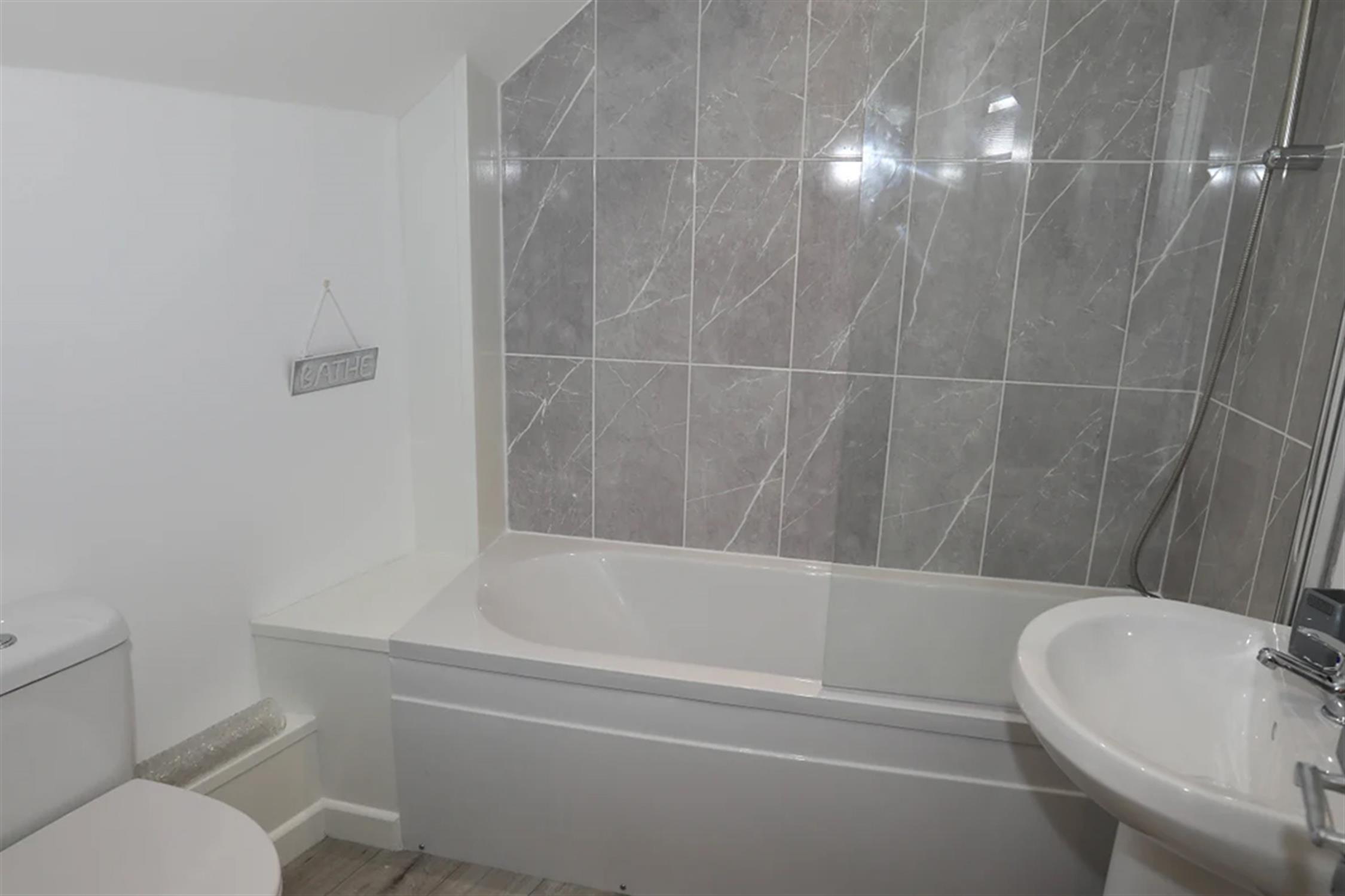BATHROOM/WC: 2.31m x 1.83m (7'7" x 6'0") White suite comprising bath with shower attachment, shower splash screen and tiling to splash prone areas. Pedestal wash hand basin with tiled splashback. Low level WC. Chrome heated towel rail. Recessed ceiling led spotlighting. Extractor fan.