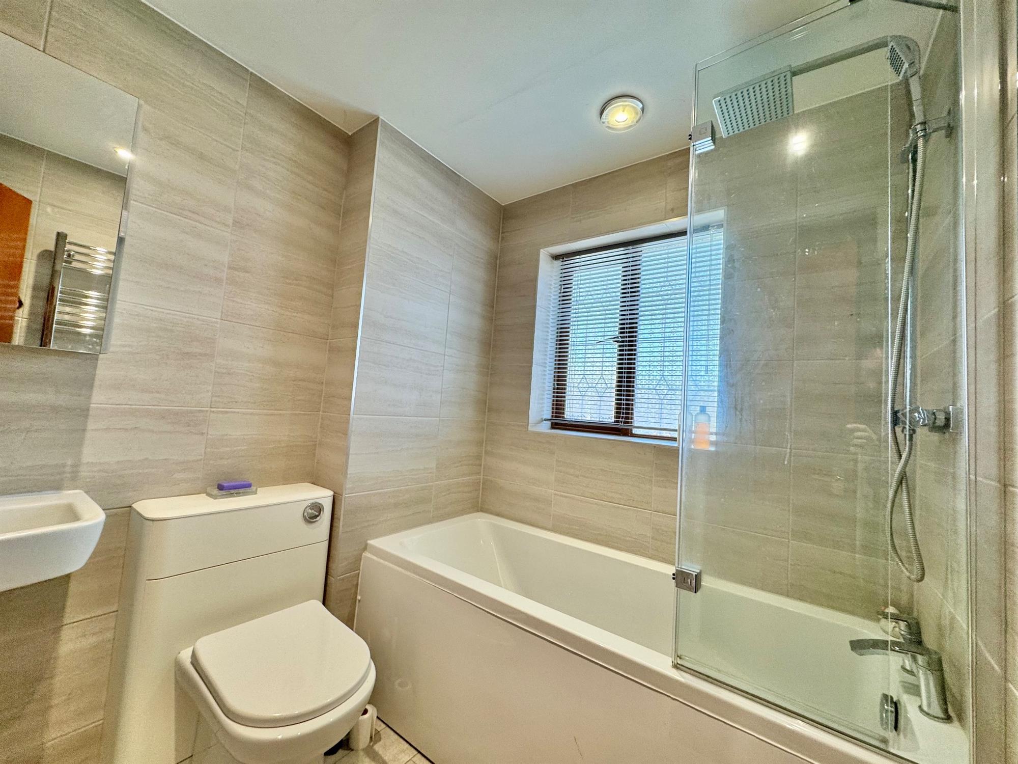 BATHROOM 6' 8" (2.03m) x 6' 2" (1.88m): Modern white suite comprising panelled bath with mixer bath tap and built-in twin headed shower above with split-fold glass screen in full tiled surround. Low level WC. Wash hand basin with mixer tap. Walls in full tiled surround. Mirrored medicine cabinet which is back-lit. Leaded double glazed window to front. Laminate tiled floor. Chrome runged radiator. Downlighters. Built-in over the stairs cupboard housing shelving and an electric heater.