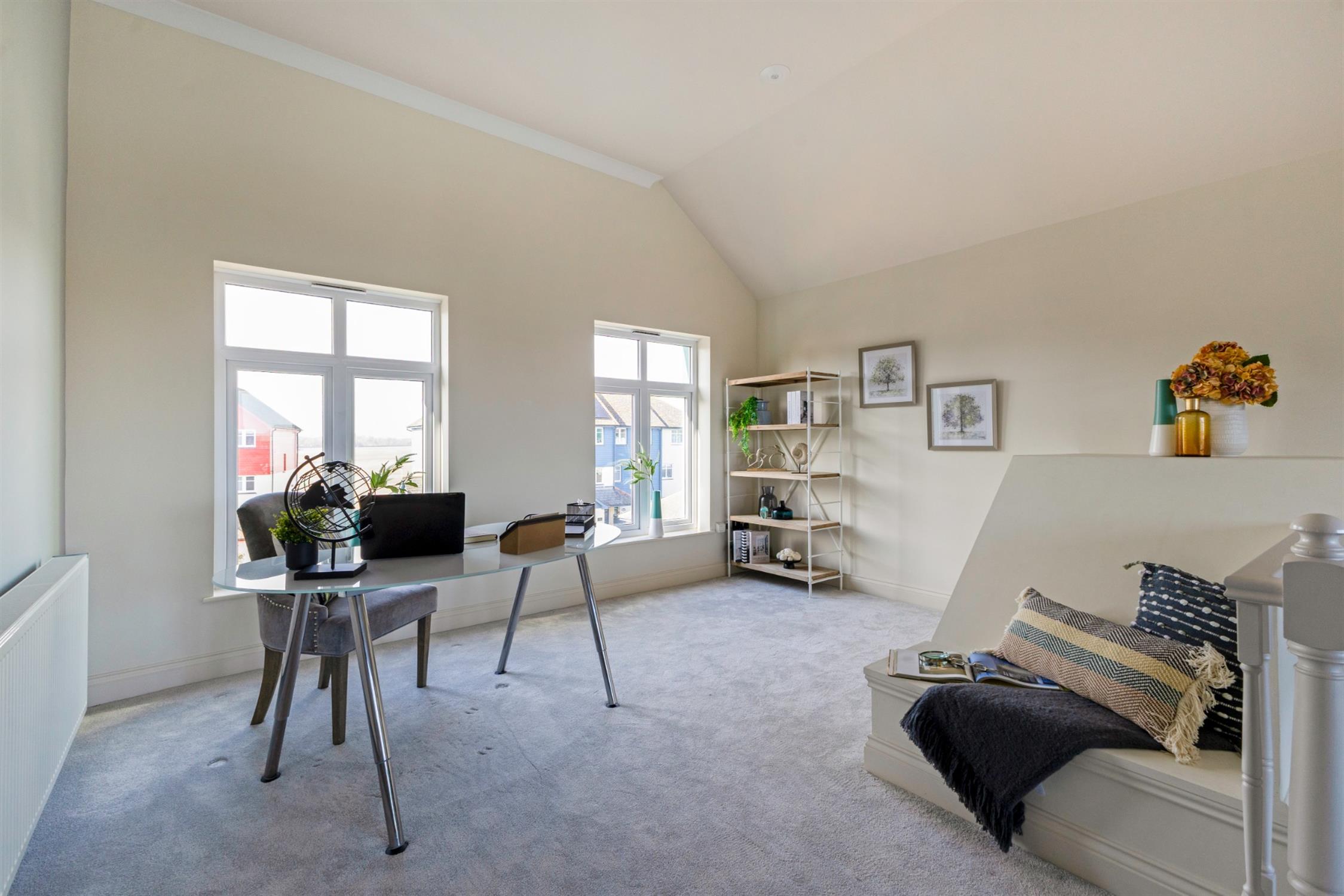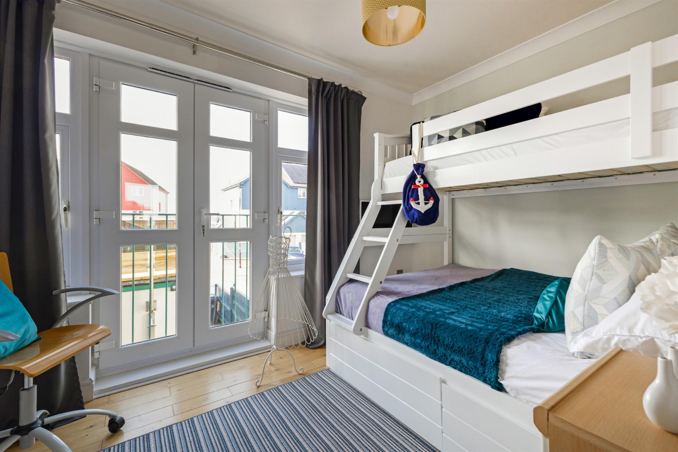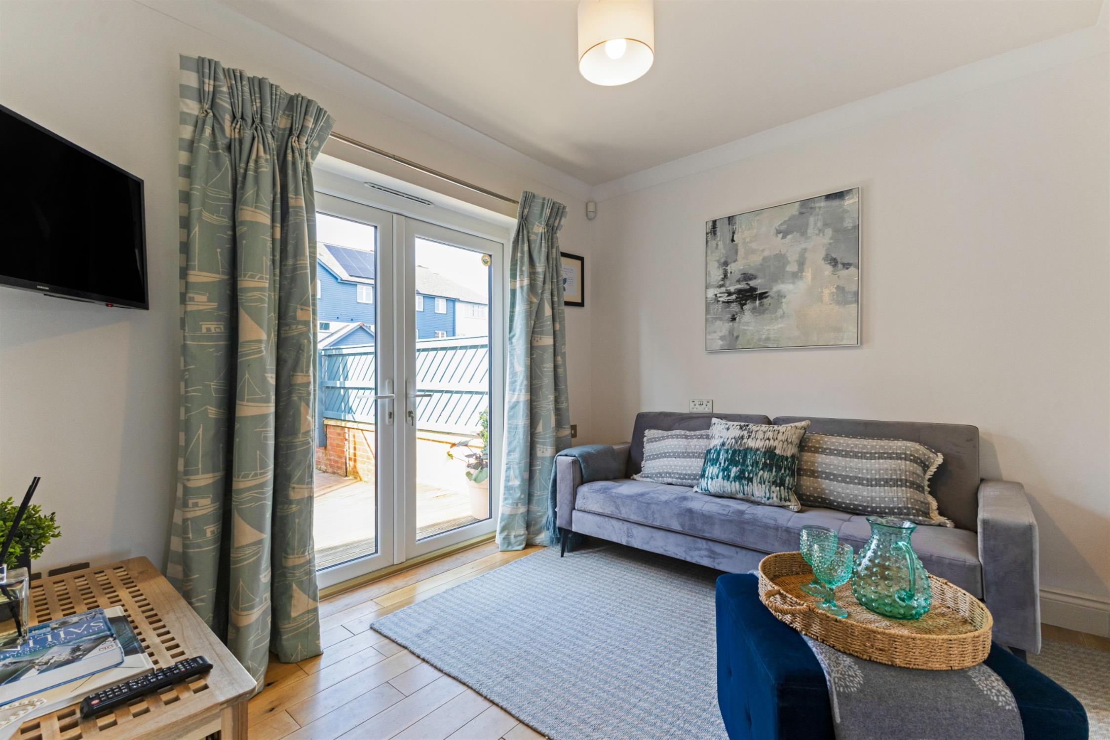 The ground floor offers a well-appointed kitchen/dining room with bi-fold doors opening onto the rear garden, a contemporary shower room, and a versatile fourth bedroom or study. The first floor hosts three bedrooms, including a generous principal suite with en-suite bathroom and marina views, alongside a further stylish shower room. The second floor is dedicated to the outstanding sitting room, creating a striking and light-filled living space.