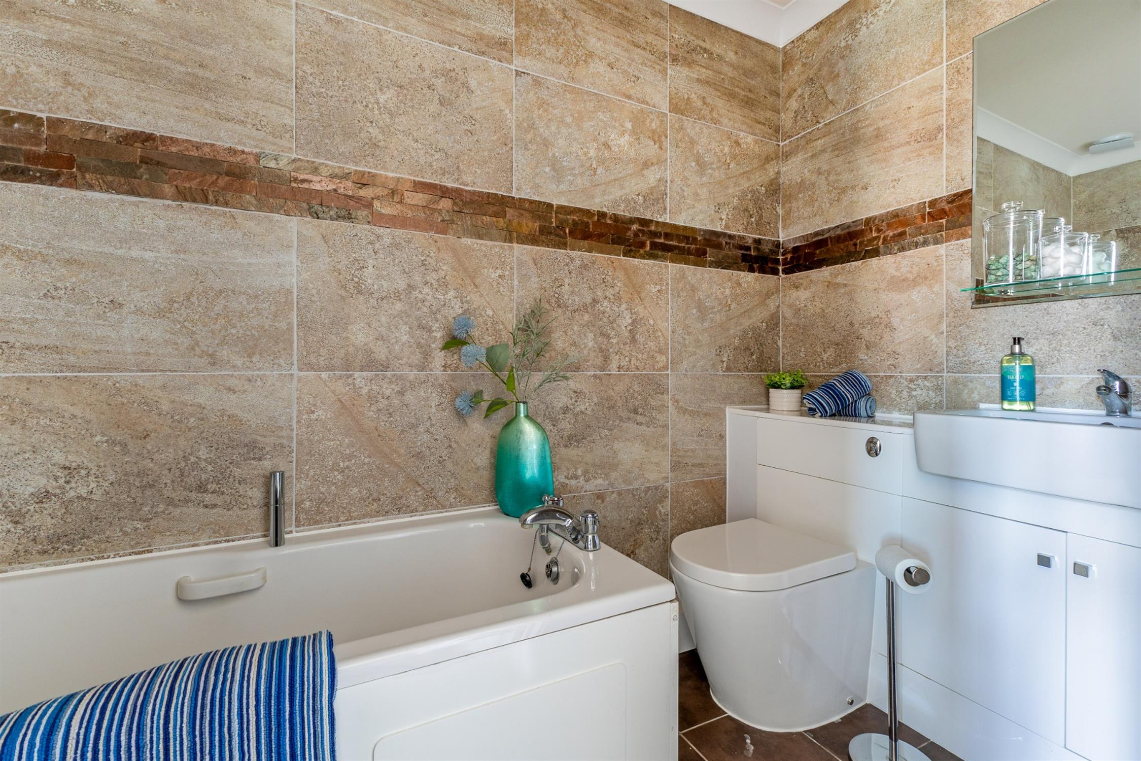 EN-SUITE9' 10" (3.00m) x 4' 6" (1.37m): White suite comprising panelled bath with mixer shower tap. Low level WC. Wash hand basin with mixer tap with cupboards under. Walls in full tiled surround. Tiled floor. Chrome runged radiator. Coved ceiling. Extractor fan. Downlighters. Vanity mirror.