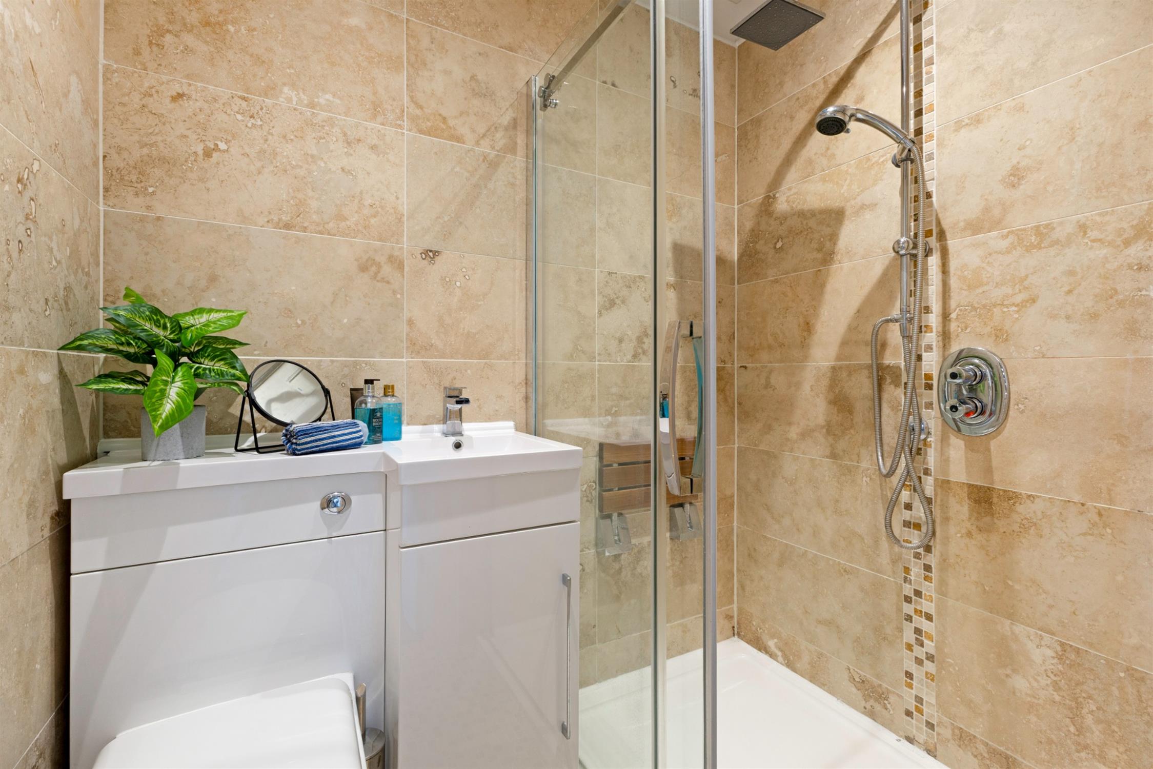 SHOWER ROOM5' 8" (1.73m) x 3' 5" (1.04m): White suite comprising low level WC, wash hand basin, oversized shower cubicle with built-in shower in full tiled surround. Continuing walls in full tiled surround. Coved ceiling. Extractor fan. Chrome runged radiator. Stone tiled floor.