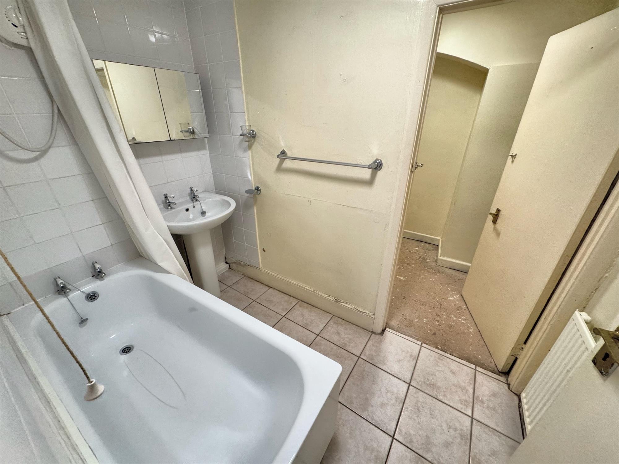 BATHROOM 8' (2.44m) x 4' 8" (1.42m): White bath in full tiled surround with electric shower. Pedestal wash hand basin in tiled splashback. Mirrored medicine cabinet. Tiled floor. Radiator. Door to