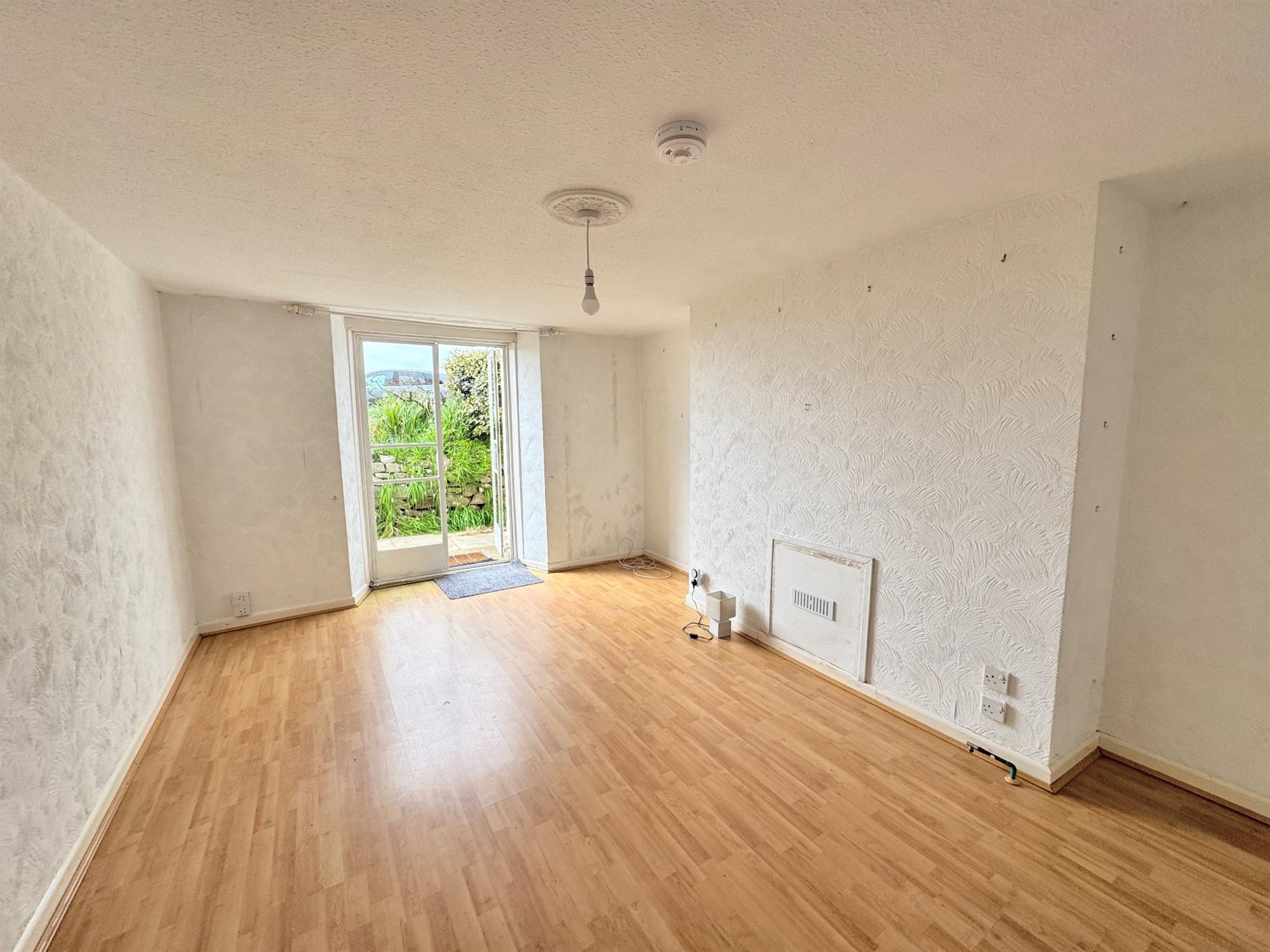 SITTING ROOM 16' 2" (4.93m) x 11' 7" (3.53m): The double doors from which the sea can be seen, open onto a patio area. Laminate wood flooring. Radiator. Opaque glazed door to...