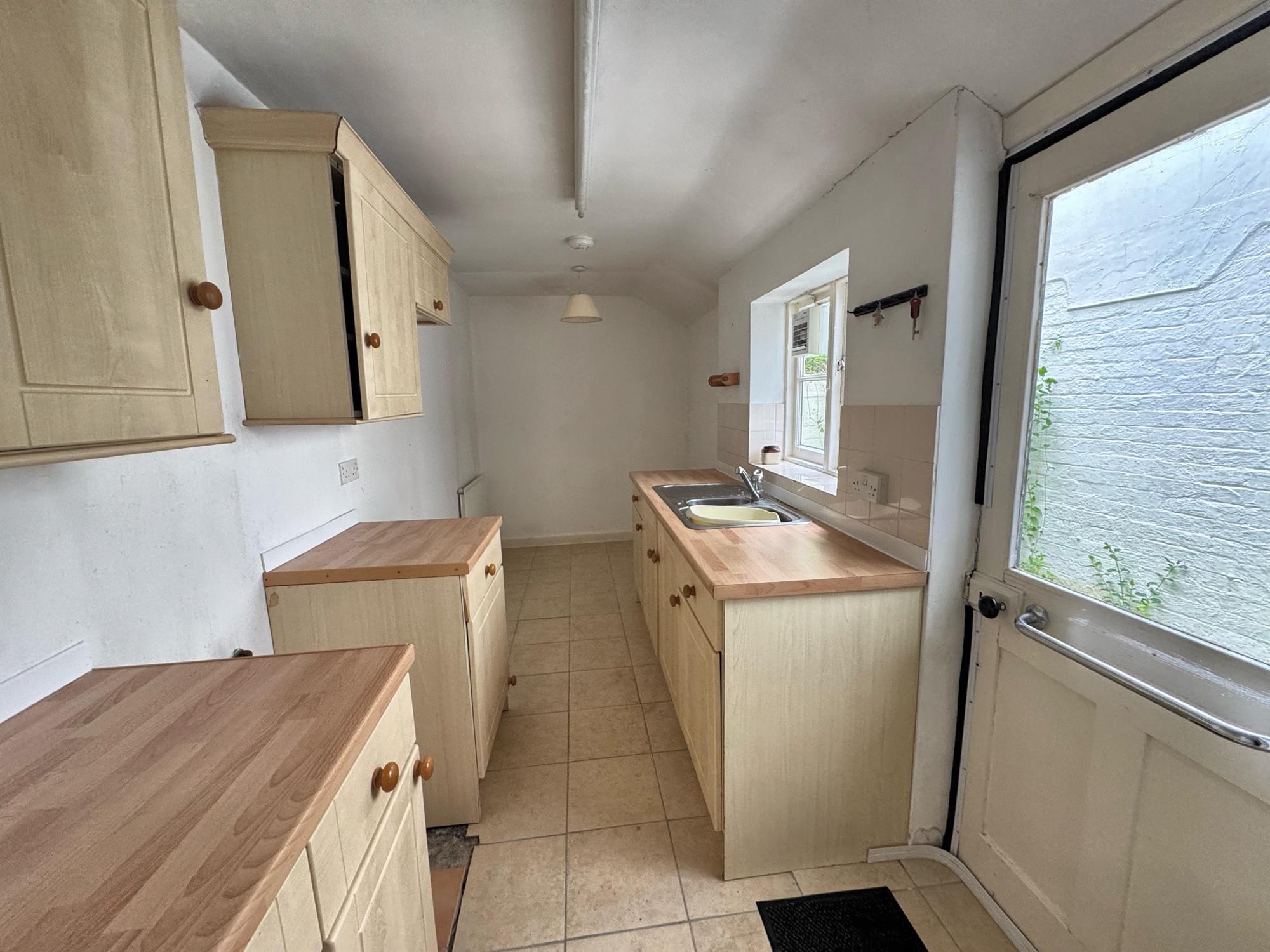 room. The kitchen has roll edge worktop surfaces in tiled splashback with one and half bowl stainless steel sink with drainer and mixer tap. Cupboards and drawers under. Space for cooker and further appliances. Matching wall mounted cupboards. Radiator. Tiled floor. Extractor fan.