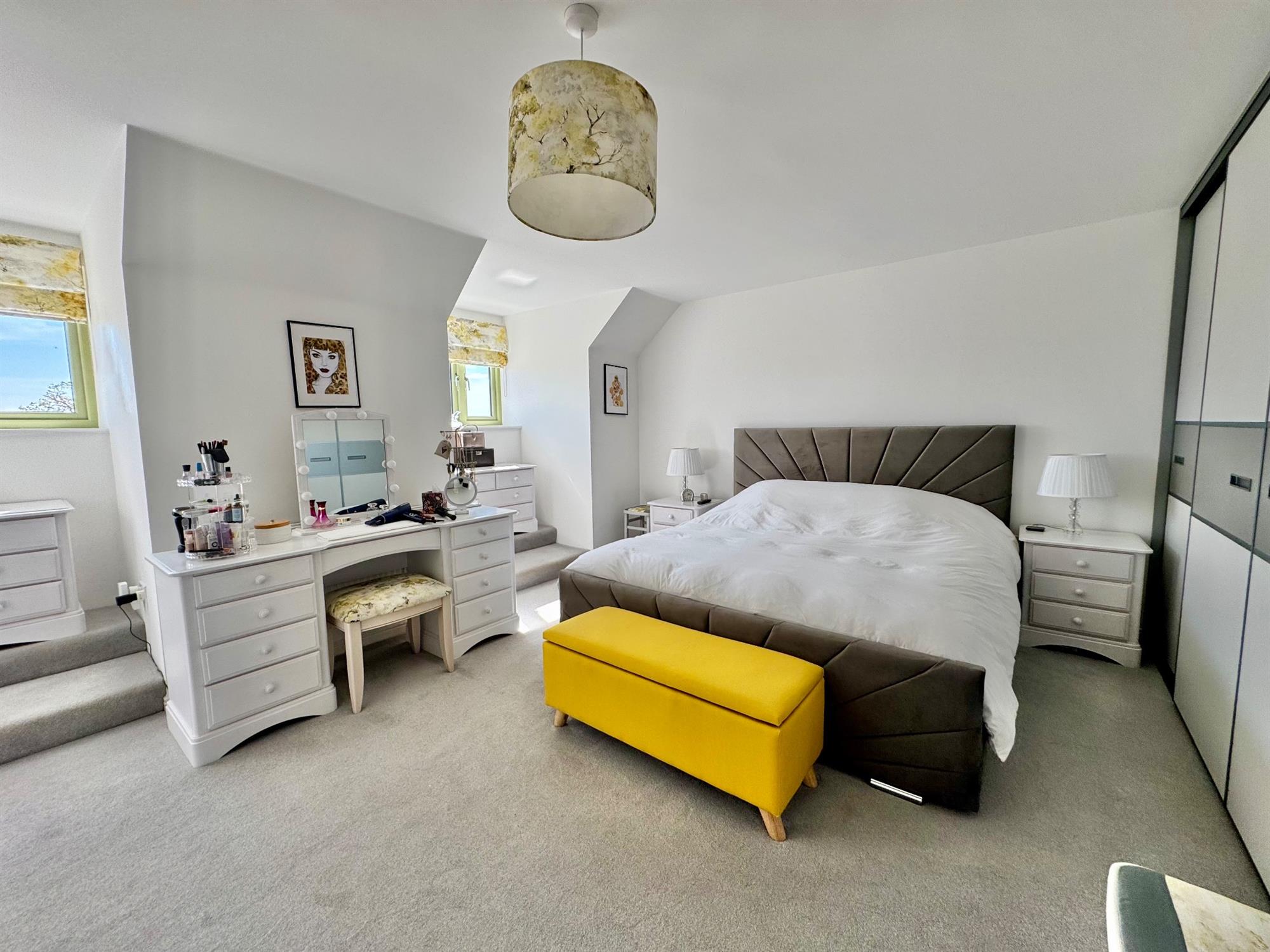Upstairs, the property continues to impress with four generously sized bedrooms. The principal bedroom suite is especially spacious, featuring a walk-in wardrobe, additional storage, and a stylish en-suite shower room, while enjoying elevated views towards the sea. Bedroom two also benefits from its own en-suite and direct access onto a private balcony, offering a wonderful spot to take in the surrounding views. Two further bedrooms are served by a modern family bathroom.