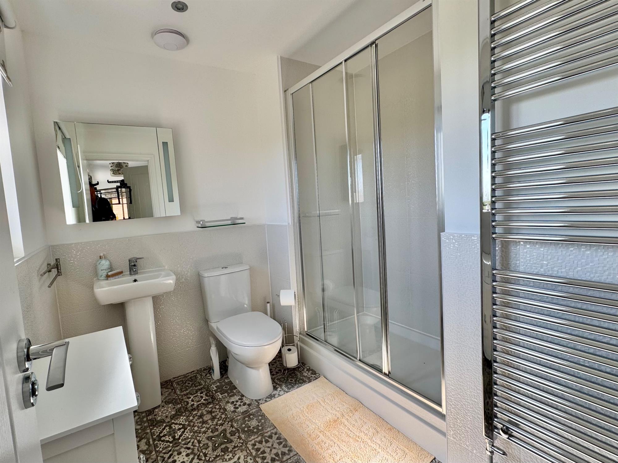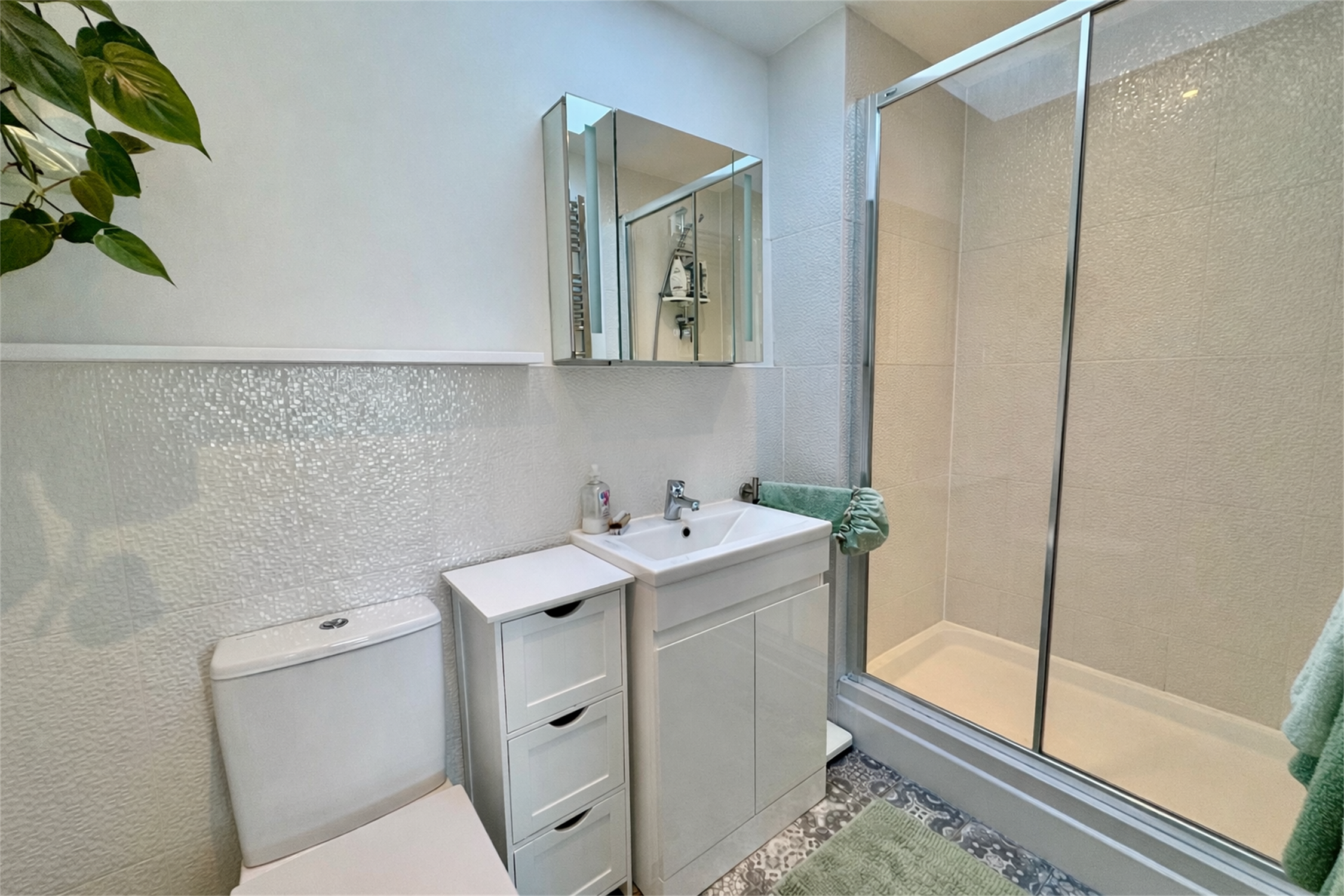 EN-SUITE 7' 8" (2.34m) x 7' 5" (2.26m): Oversized shower cubicle with built-in shower in full tiled surround with glass screen. Low level WC. Pedestal wash hand basin with mixer tap. Walls in half height tiled surround. Downlighters. Extractor fan. Opaque double glazed window to front. Chrome runged radiator.