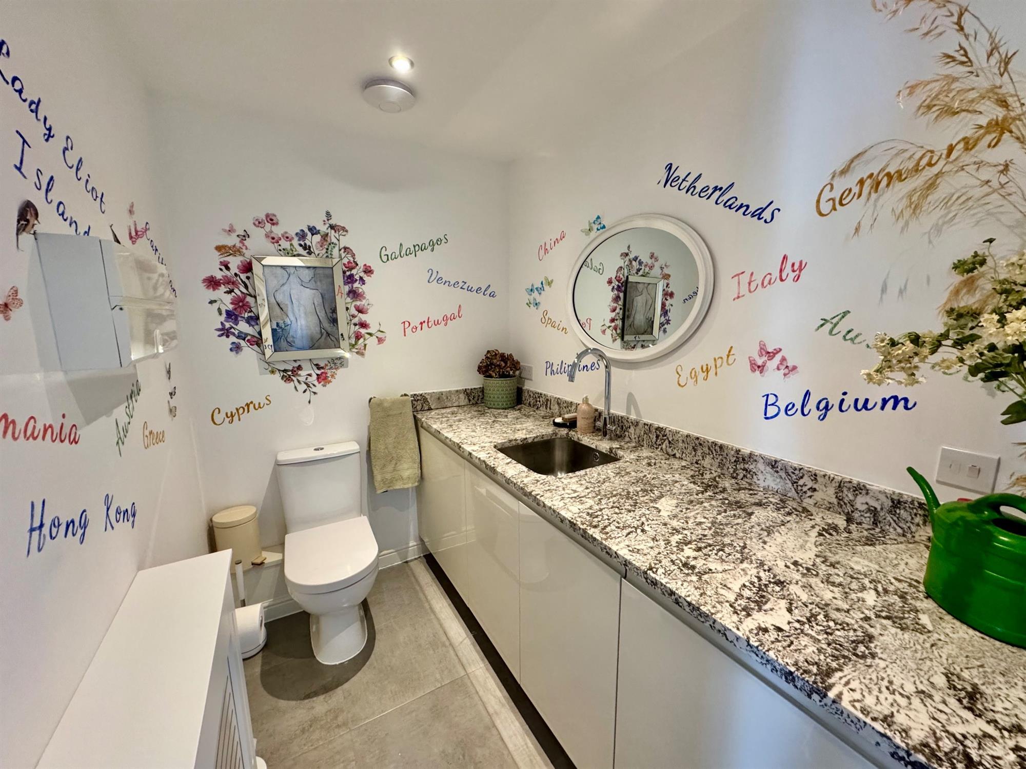UTILITY / CLOAKROOM 7' 7" (2.31m) x 5' 3" (1.60m): Low level WC. Radiator. Tiled floor. Granite worktop surfaces with matching upstands with an under-counter stainless steel sink with mixer tap and grooved granite drainer. Cupboards under, one housing the washing machine. Downlighters. Extractor fan. PIR lighting.