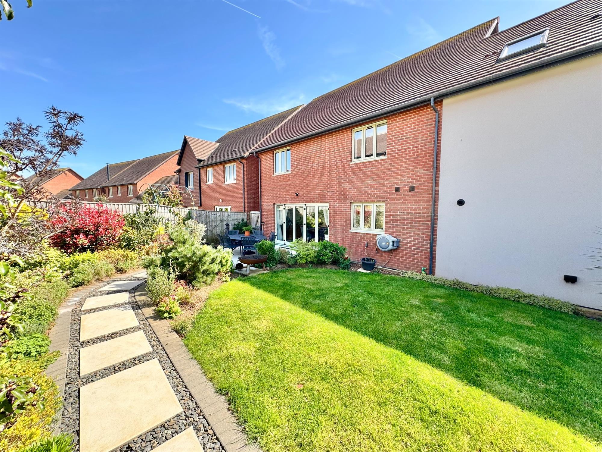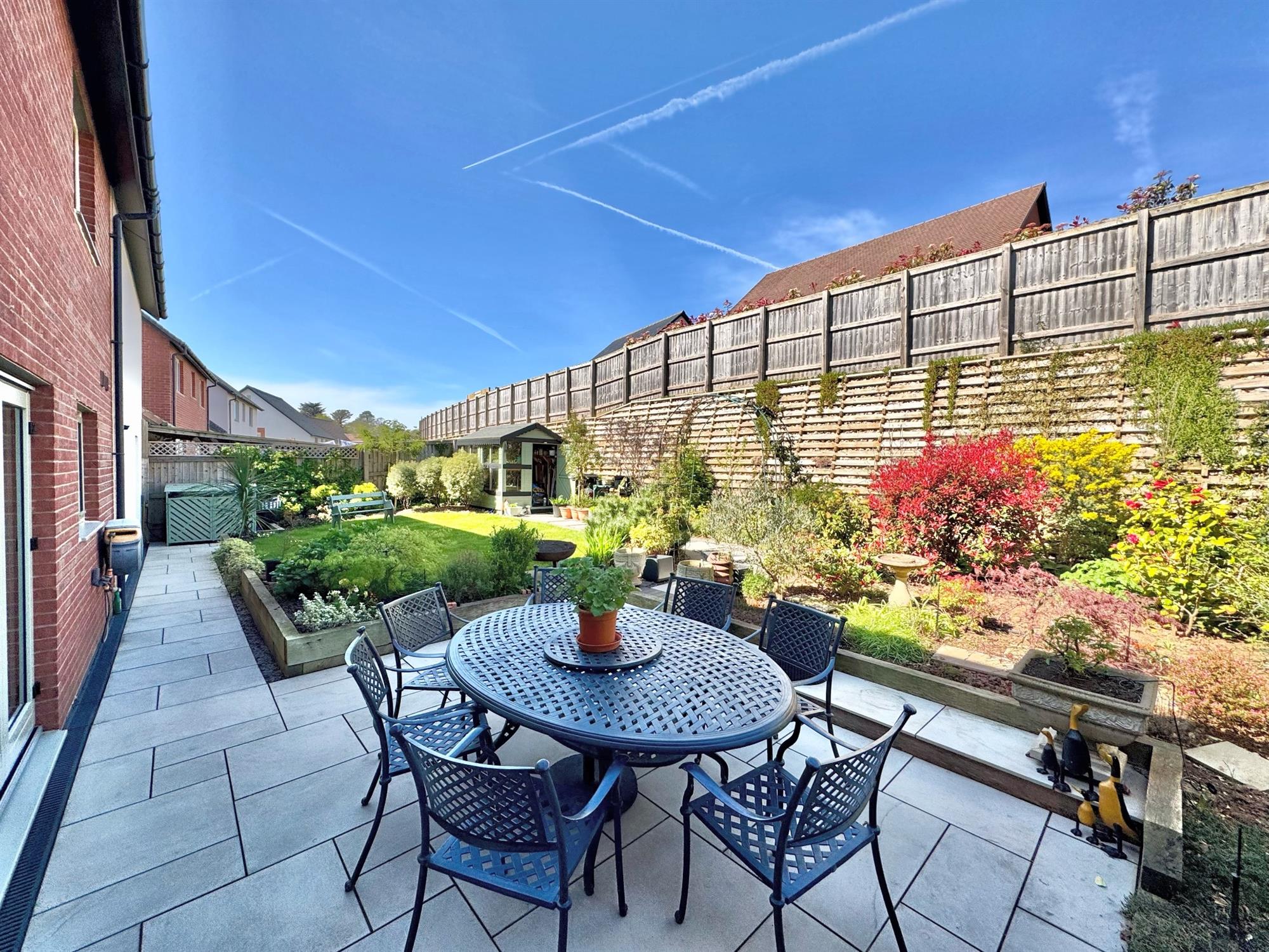 Externally, the property has been thoughtfully landscaped by the current owners to create attractive, low-maintenance outdoor spaces. The rear garden offers a large porcelain-paved patio, an area of lawn, and well-stocked borders, all enclosed to provide a good degree of privacy. To the front, there is a private driveway providing parking for two vehicles, leading to a substantial double garage with power and lighting with wall mounted battery from solar panels and door to the garden.
