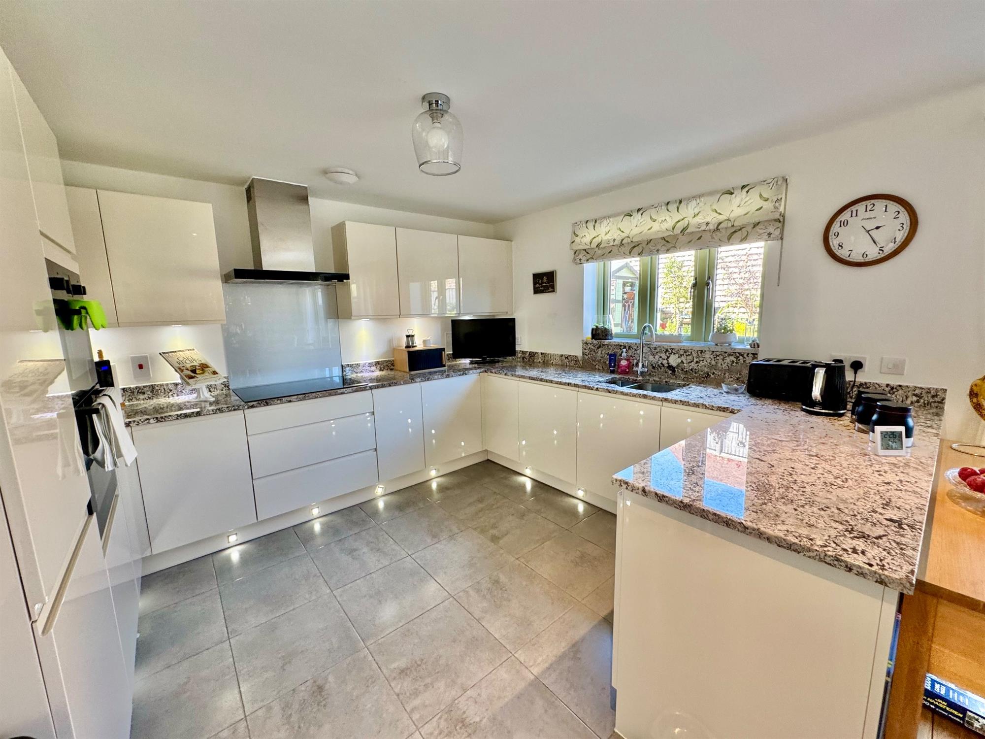 DESCRIPTION: Beautifully presented and occupying a prime position on a quiet road, this impressive five-bedroom detached home is the largest design of its type on the development, enjoying far-reaching views over open fields towards Foxholes and along the coastline towards Dawlish.Finished to a high standard throughout, the property offers spacious and versatile accommodation ideally suited to modern family living, with a particular highlight being the open-plan kitchen/family/dining room extending over 26 feet in length. This bright and sociable space features sleek gloss-fronted units, granite worktops, integrated appliances, and bi-fold doors opening directly onto the landscaped rear garden.