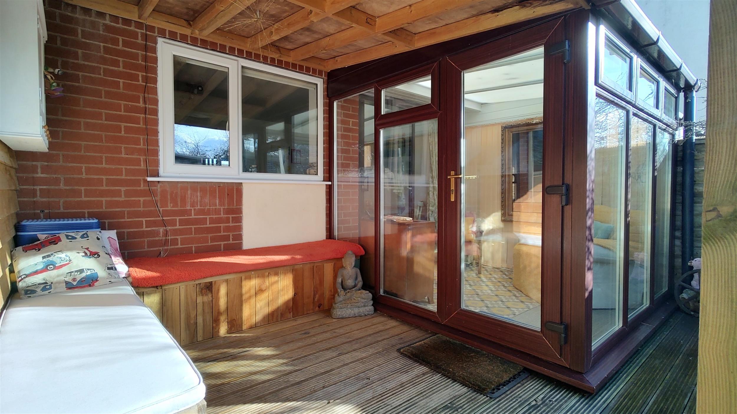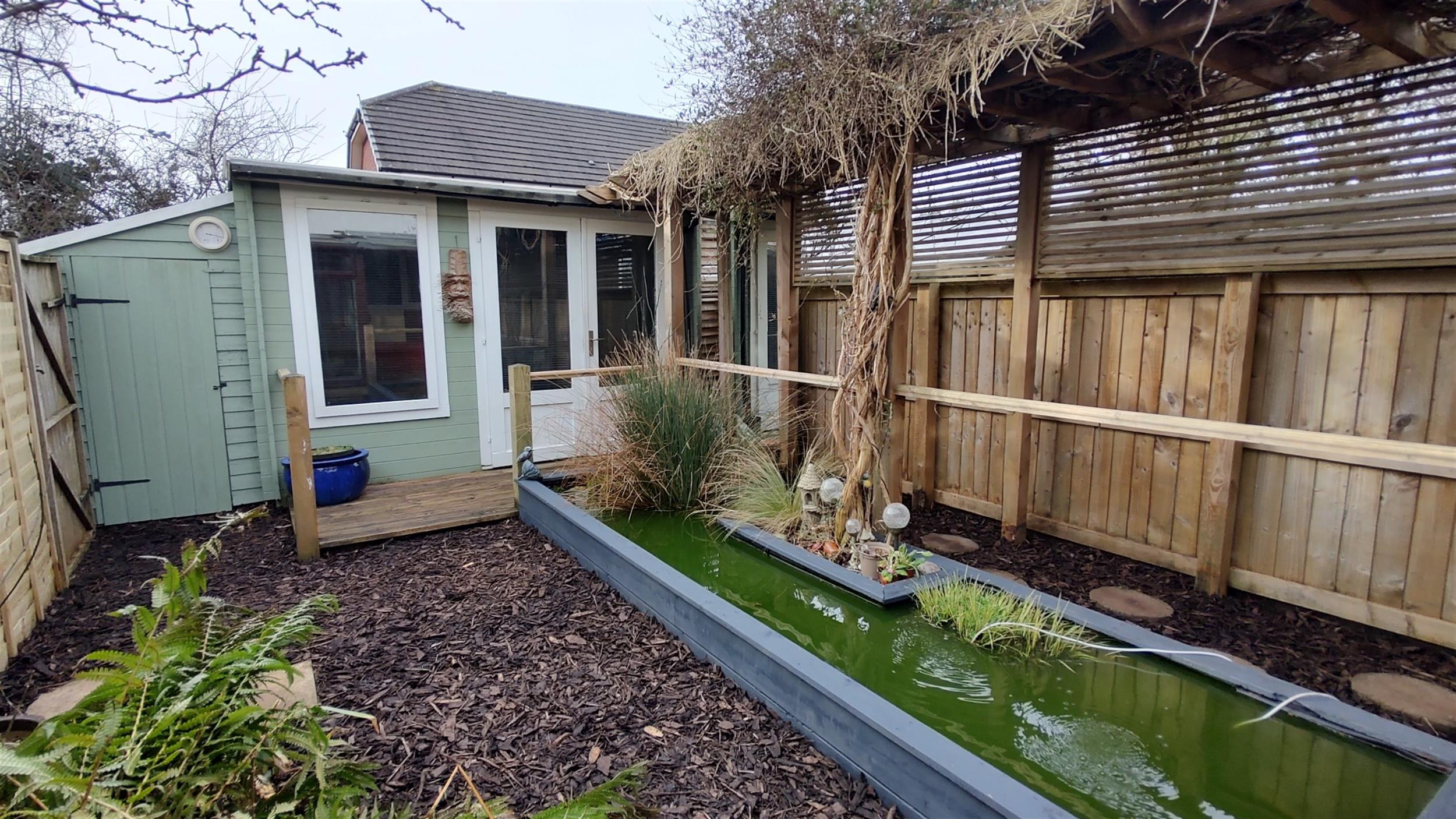 OutsideTo the front is a brick paved parking space, pathway leading to the property and bin store. To the rear is a covered built in seating area with storage, pond, shed (6ft x 4ft), pergola and summerhouse (3.28m x 2.26m). There is also rear pedestrian access and a second parking space nearby.