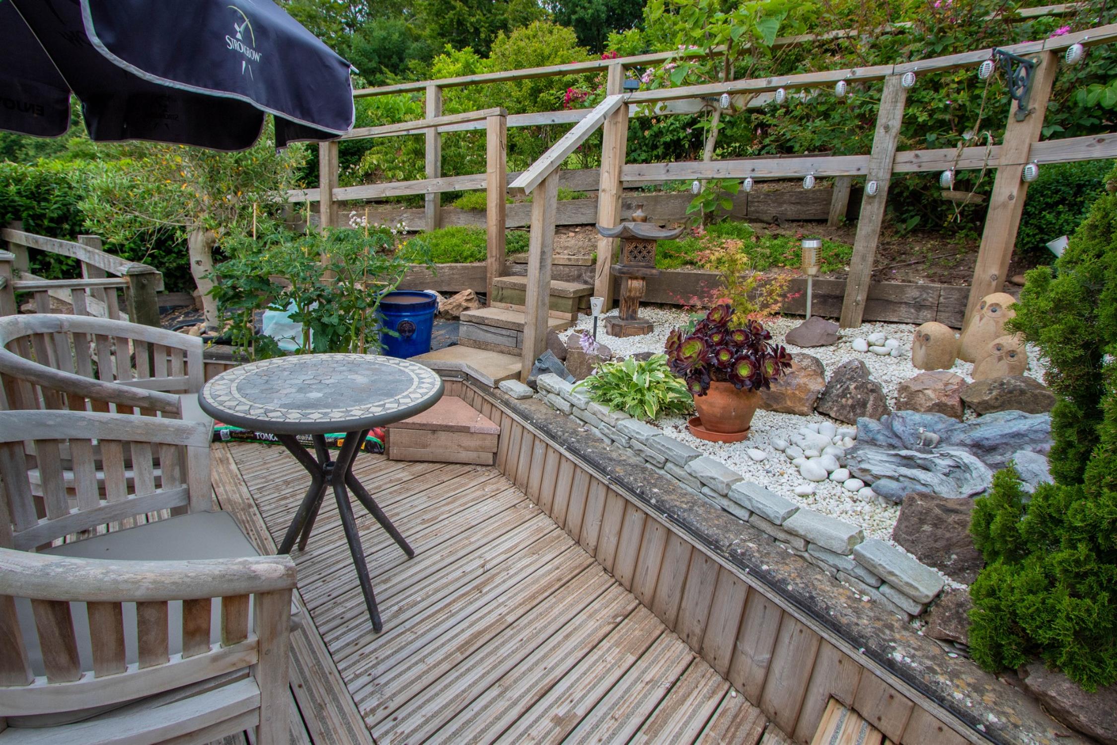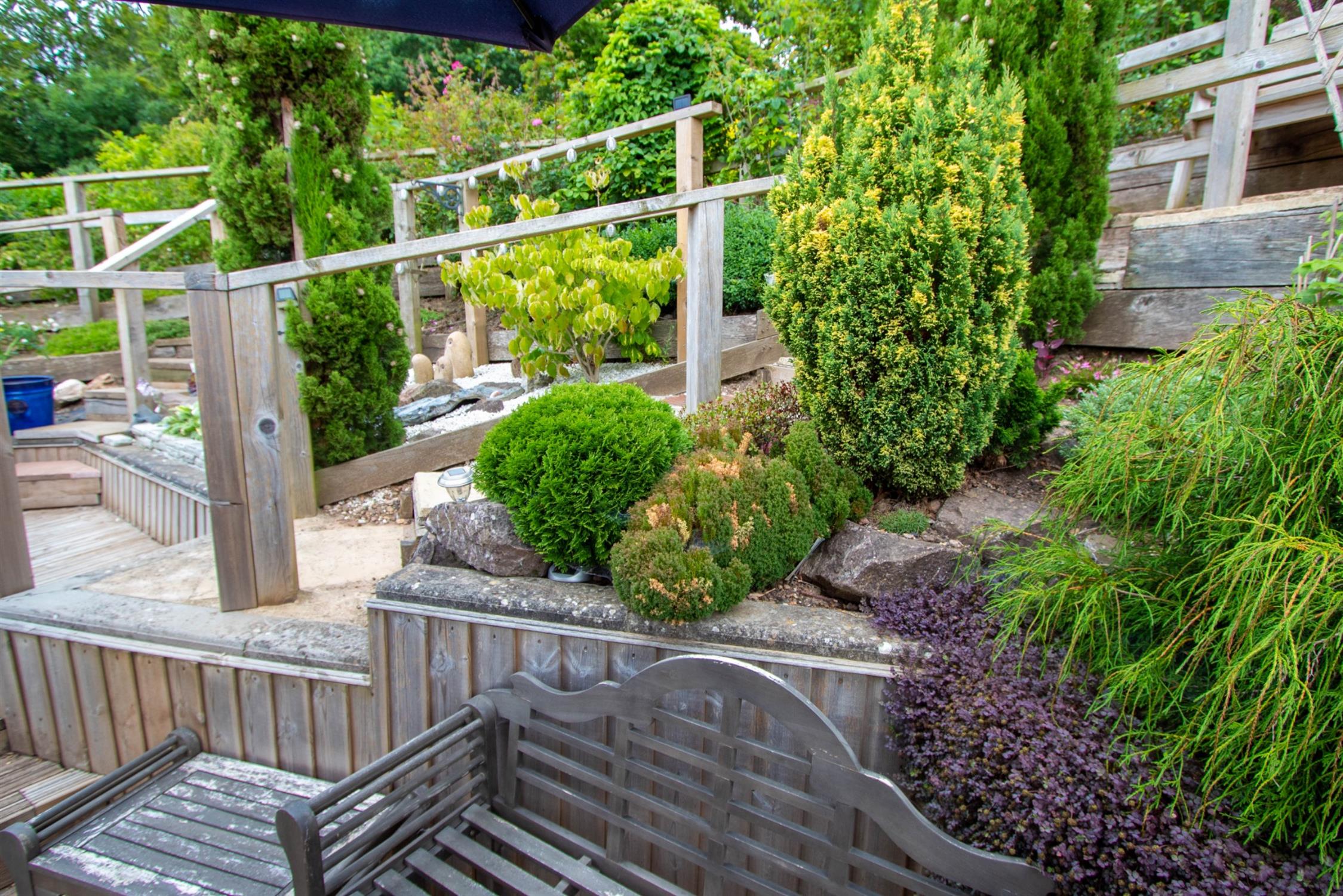 To the front of the property is a lawned garden with flowerbed, gravel driveway to side offering parking for two vehicles and leads to the detached garage with up and over door light and power. Paved pathway leading to the rear garden which has been beautifully landscaped, paved patio with timber steps leading to a timber decked patio, which leads to a further timber decked patio, ornamental pond and steps lead up to a further paved seating area offering absolutely stunning views over the park to the surrounding countryside, garden stocked with shrubs and gravel pathway giving rear pedestrian access.