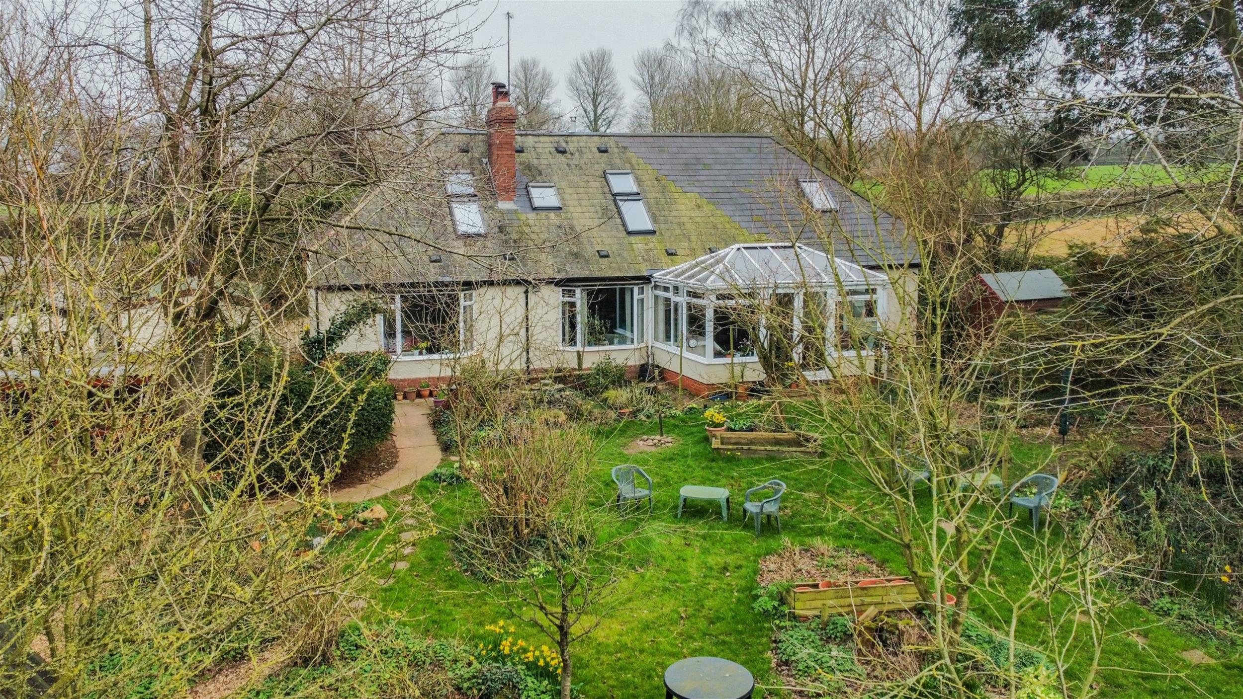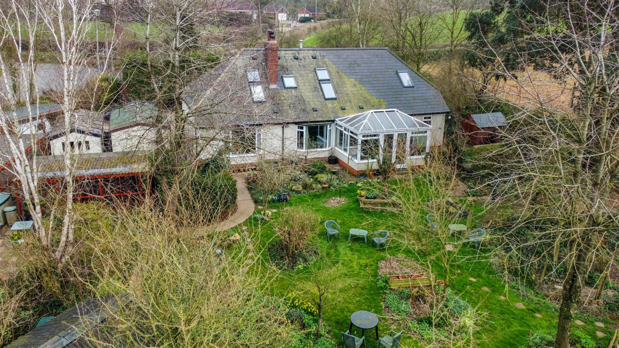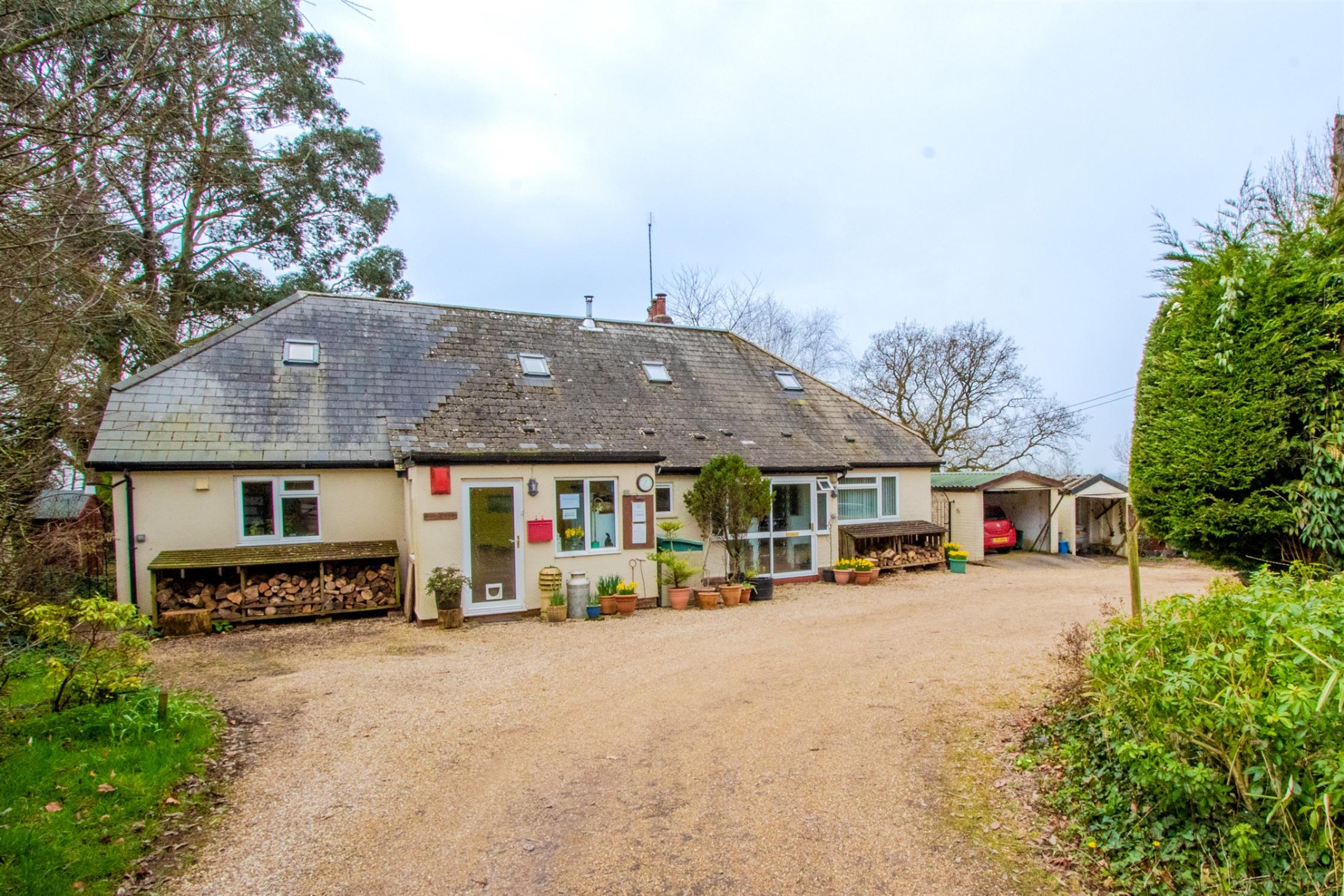 OutsideThe property is set within large, well-maintained gardens, accessed via a five-bar gate and a driveway that leads down to the house. It offers ample parking, two detached garages, and a caravan port. The front garden is mainly laid to lawn with a variety of shrubs, while side access leads to a generous rear garden.