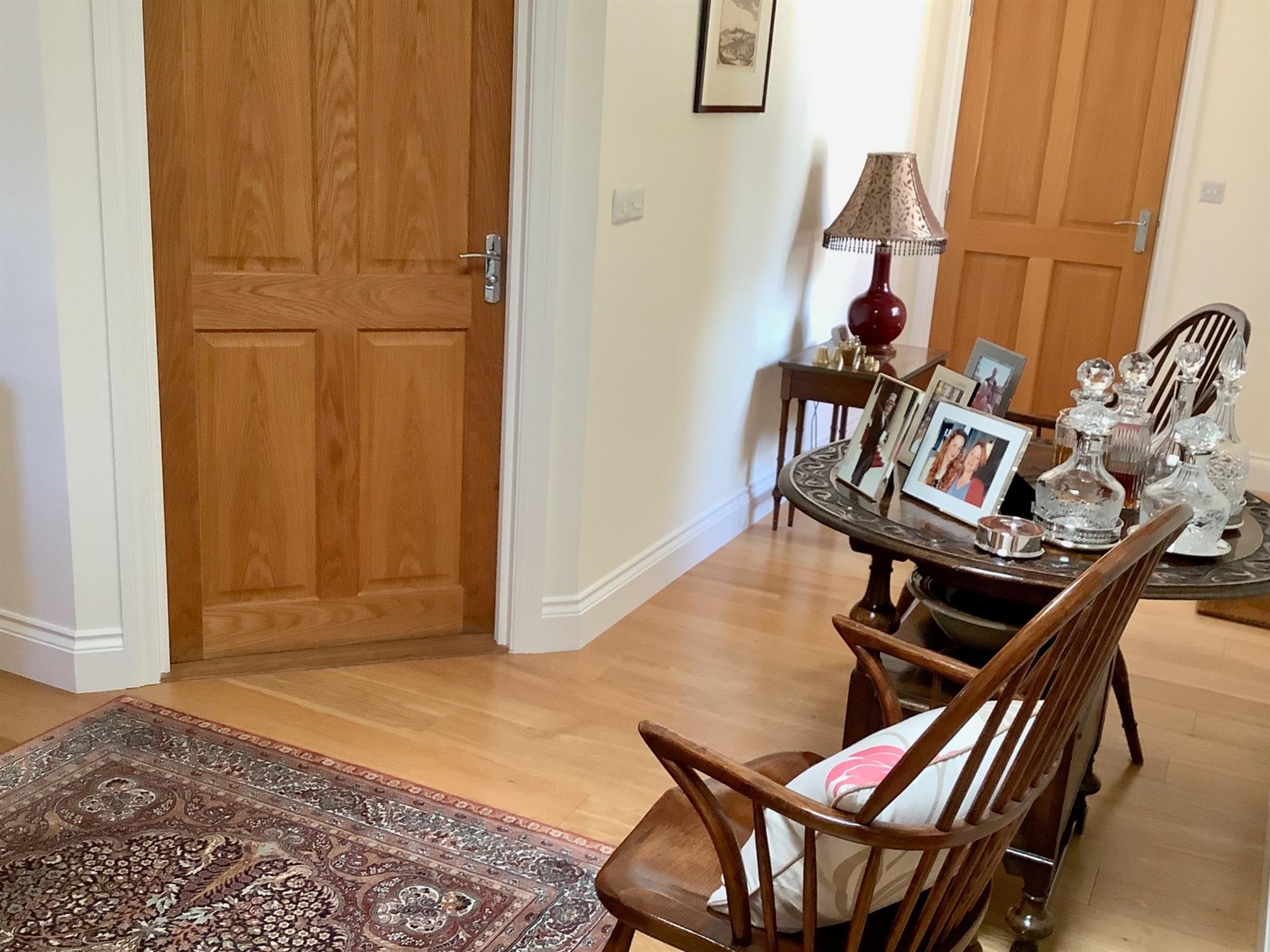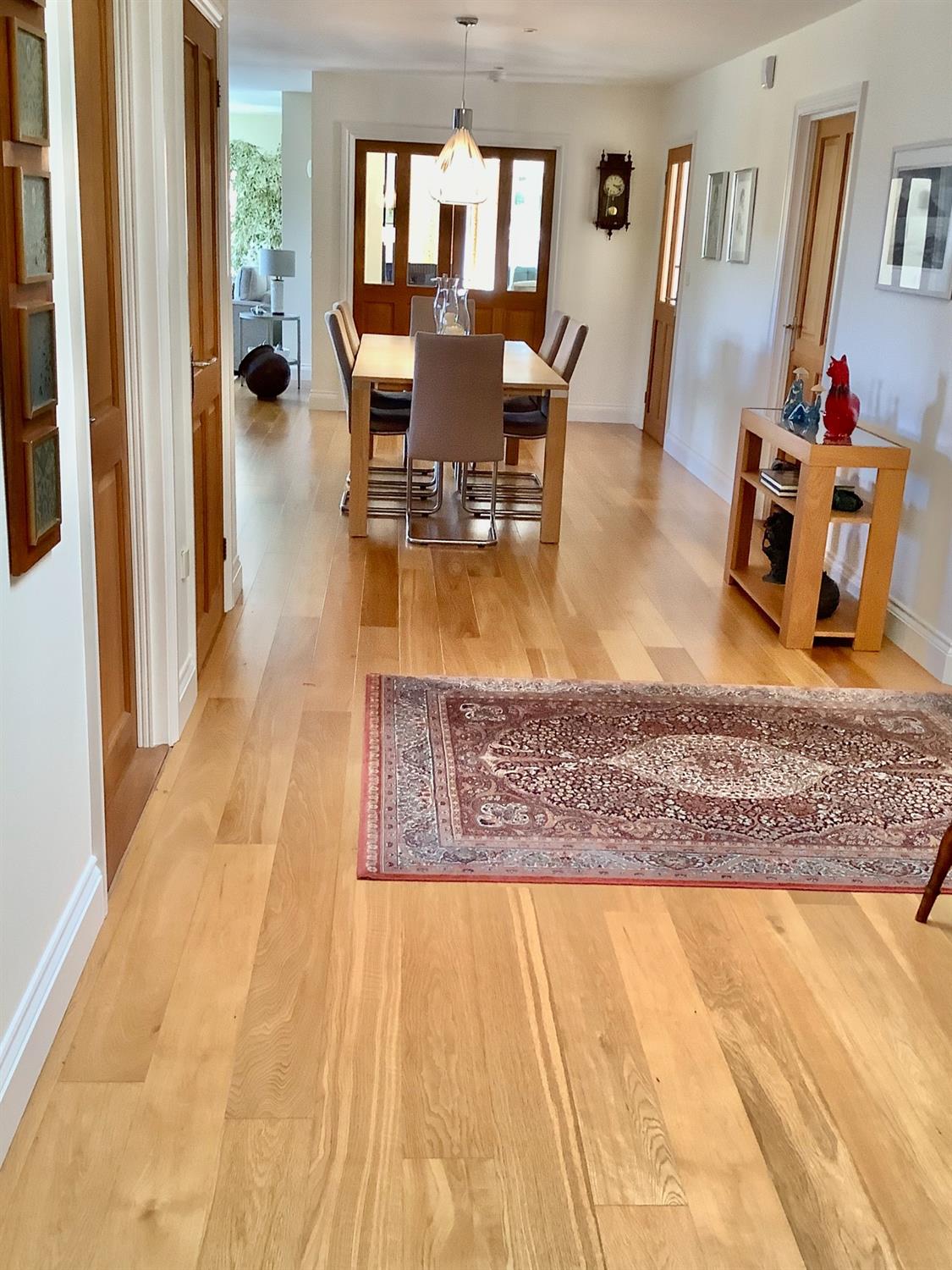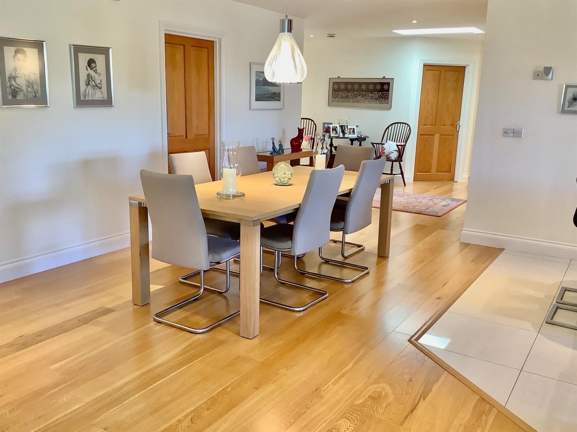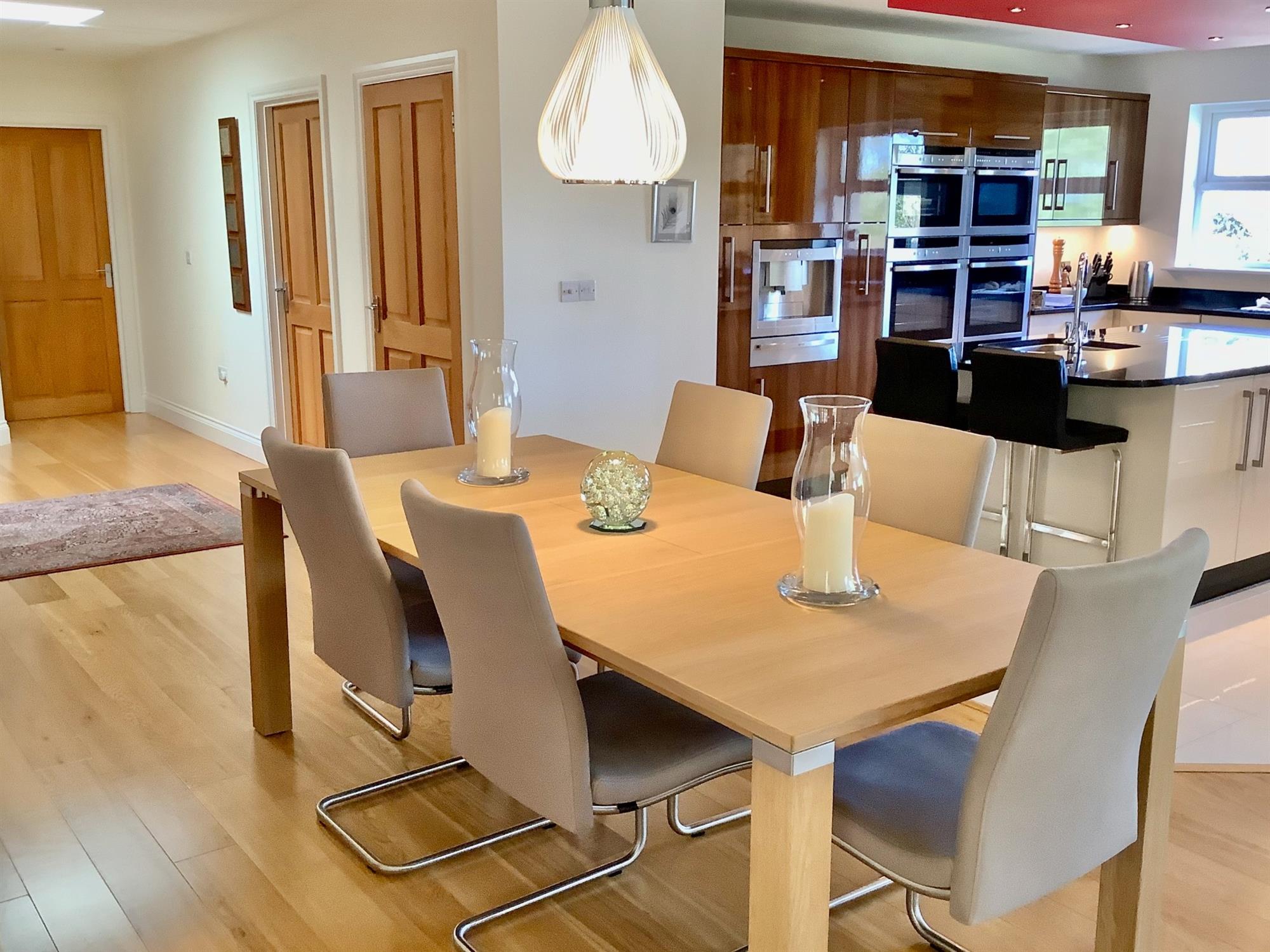 The very well-appointed accommodation comprises: an entrance lobby with doors onto a stunning open-plan dining hall/kitchen and garden room, the dining hall with engineered oak flooring. The luxury kitchen has a range of wall and base units, granite worktop surfaces, a range of Neff appliances to include, 2, self-cleaning, fan-assisted ovens, one combination microwave, one steam oven, coffee machine and warming drawer. There is also a 5-ring gas hob with extractor hood over, an integrated dishwasher, two double fridge/freezers, two pull-out larder units and a ceramic tiled floor. There is a lounge with gas fire and engineered oak floor and a garden room with engineered oak flooring with doors to the outside, offering a lovely outlook. There are 4 bedrooms; The master has a walk-in wardrobe and a range of built-in wardrobes and there is a luxury fully tiled ensuite. The guest bedroom also has an ensuite with tiled floors. The family bathroom has a freestanding limestone quartz bath and basin with vanity unit below. The utility room has granite worktops and gives access to the study and the double garage.