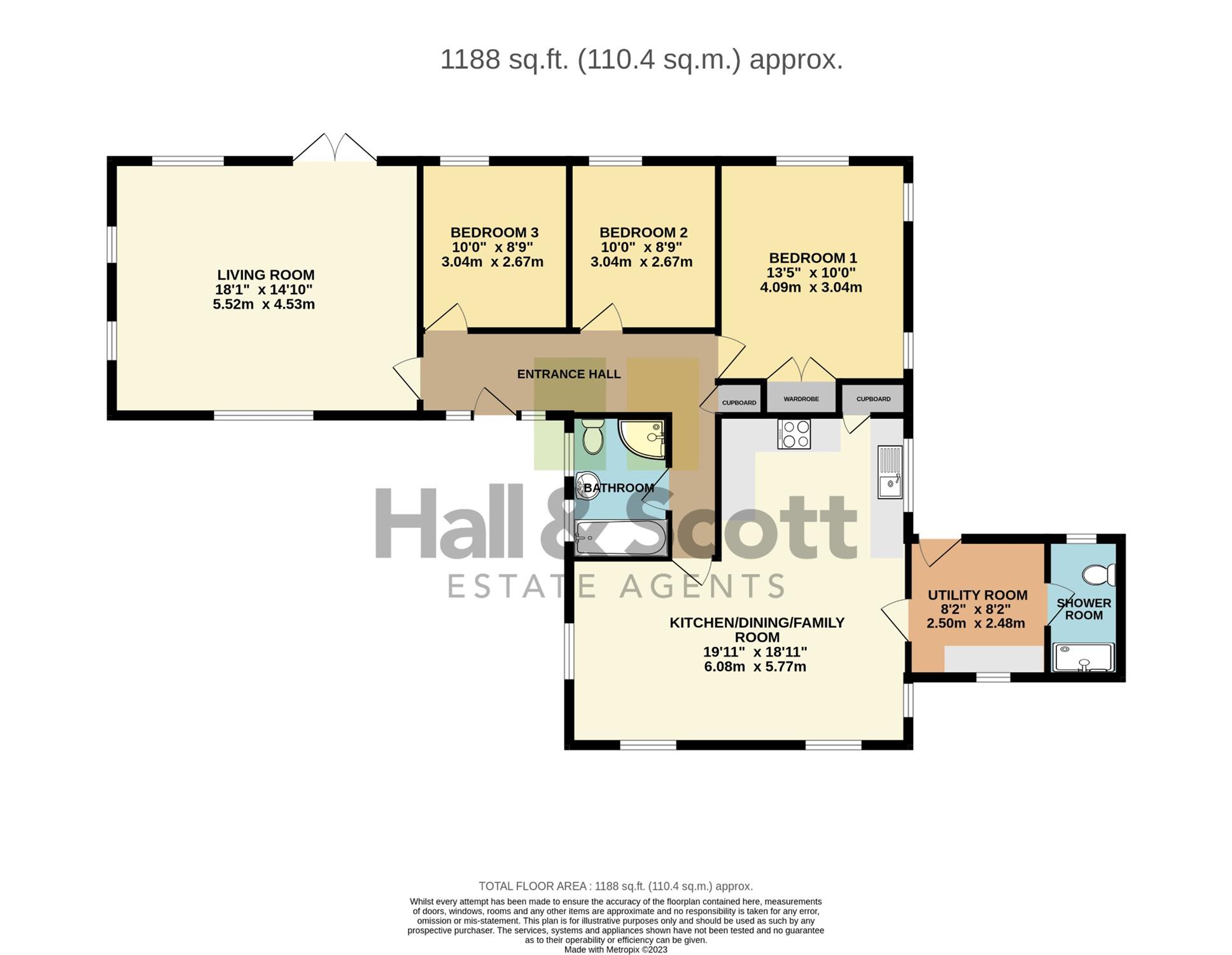 The accommodation comprises: entrance hallway, triple aspect living room, large kitchen/dining/family room with a range of wall and base units and worktop surfaces, utility room, shower room, three bedrooms; the main bedroom with built-in wardrobes and bathroom.