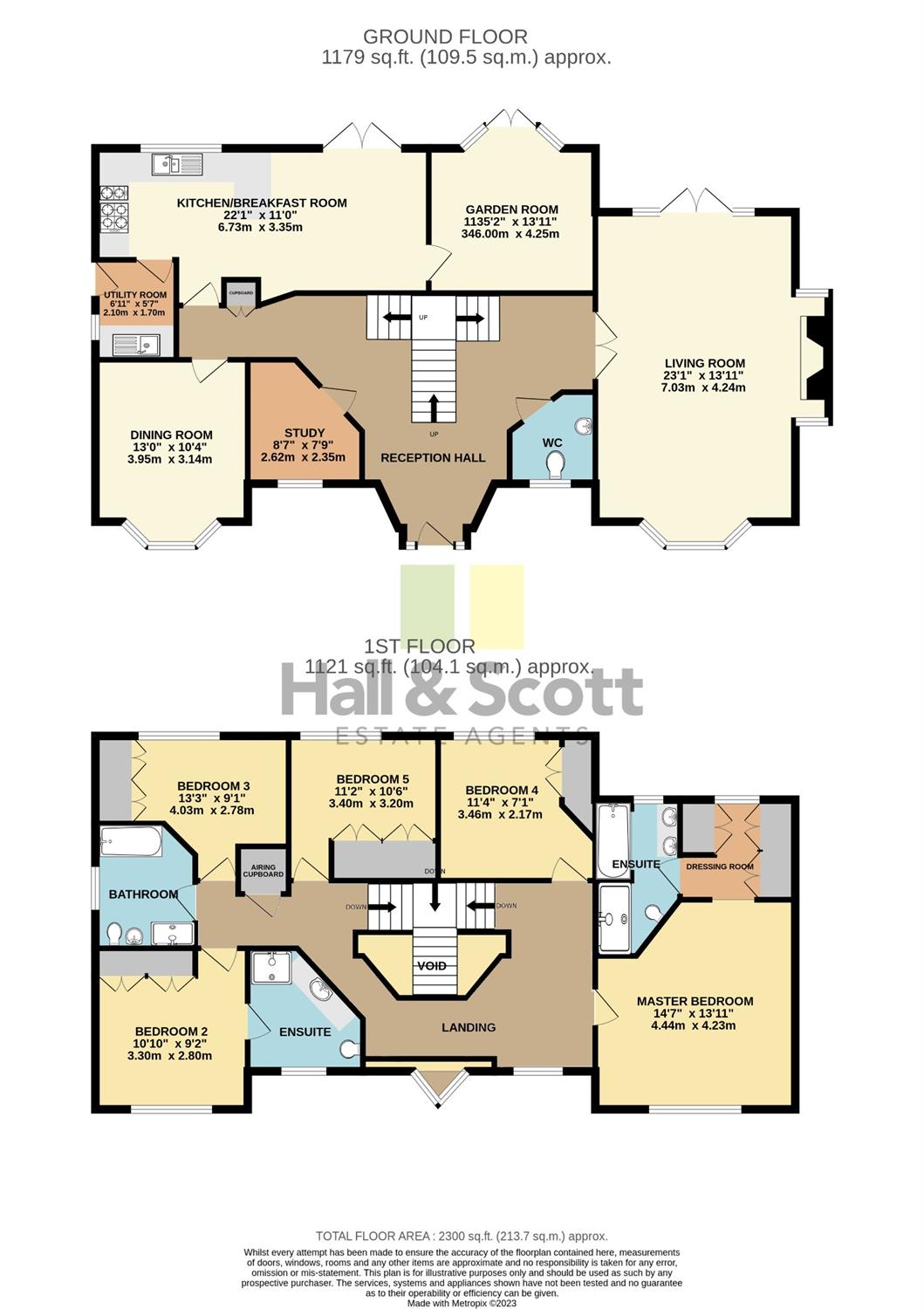 On the first floor, there are five bedrooms; the master bedroom with a dressing room and ensuite bathroom with bath and shower, guest bedroom, also with ensuite shower and three further bedrooms. All the bedrooms have built-in wardrobes and there is also a family bathroom suite, also with bath and shower. The property has gas central heating and double-glazed windows. No chain.