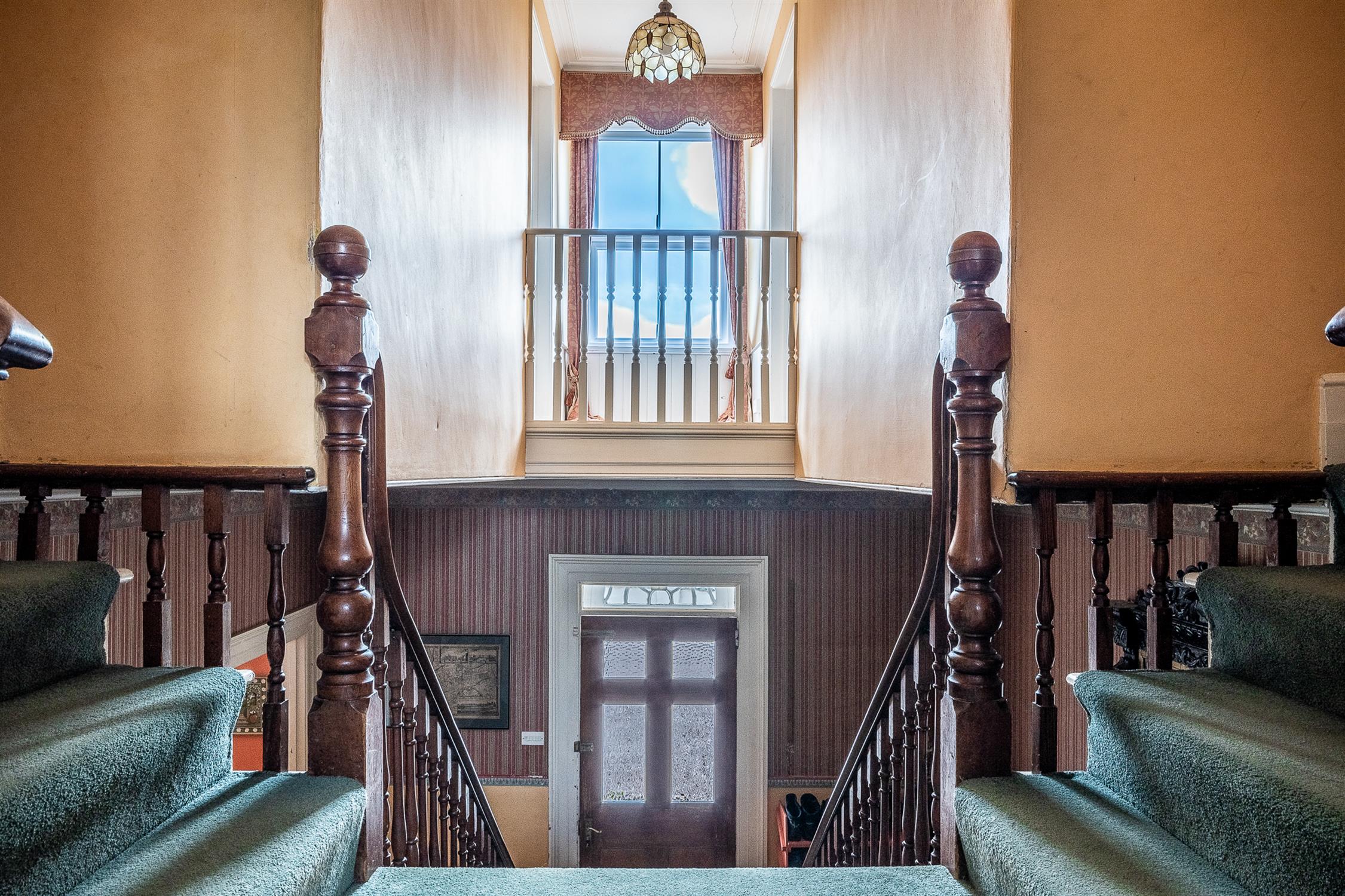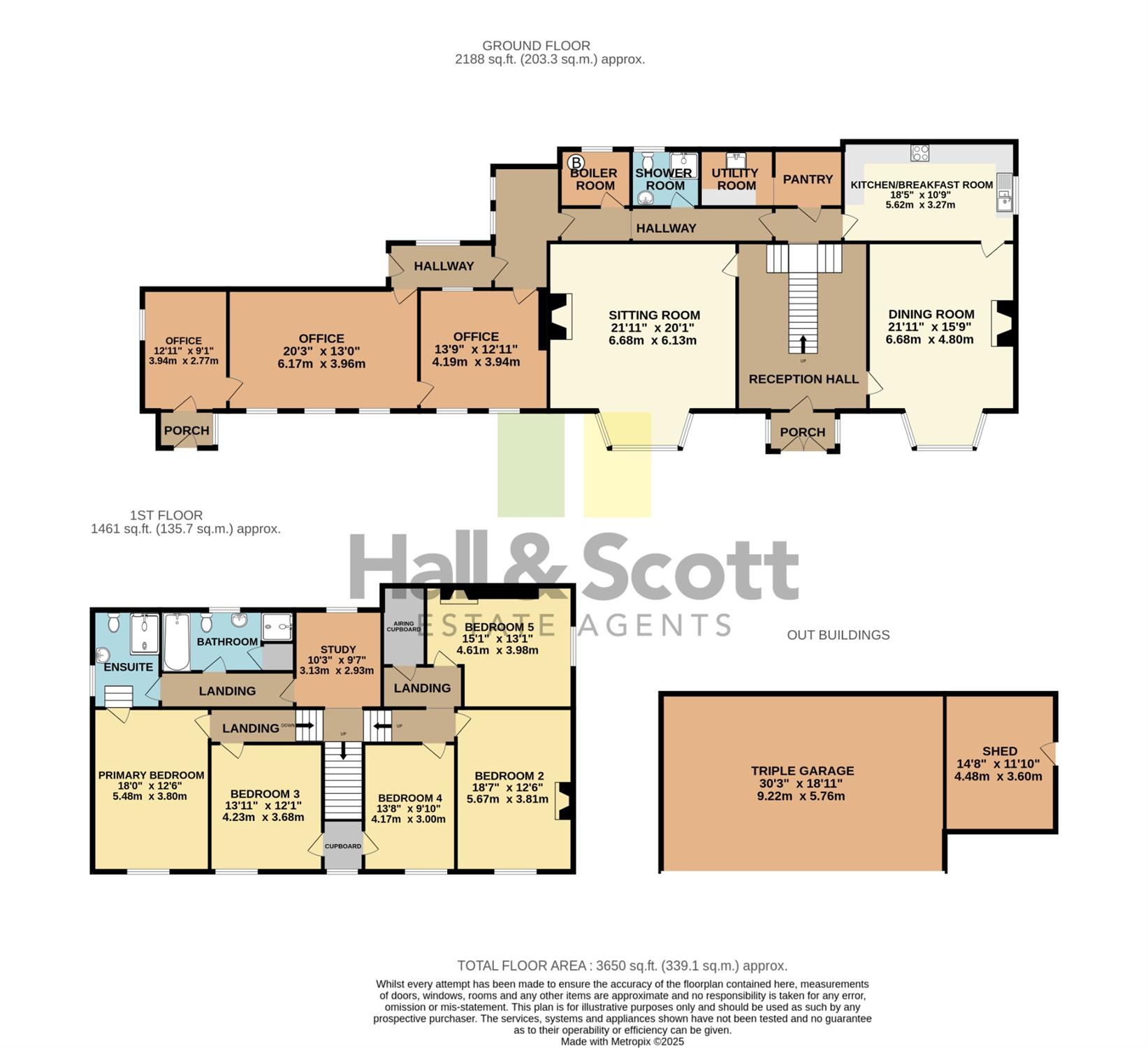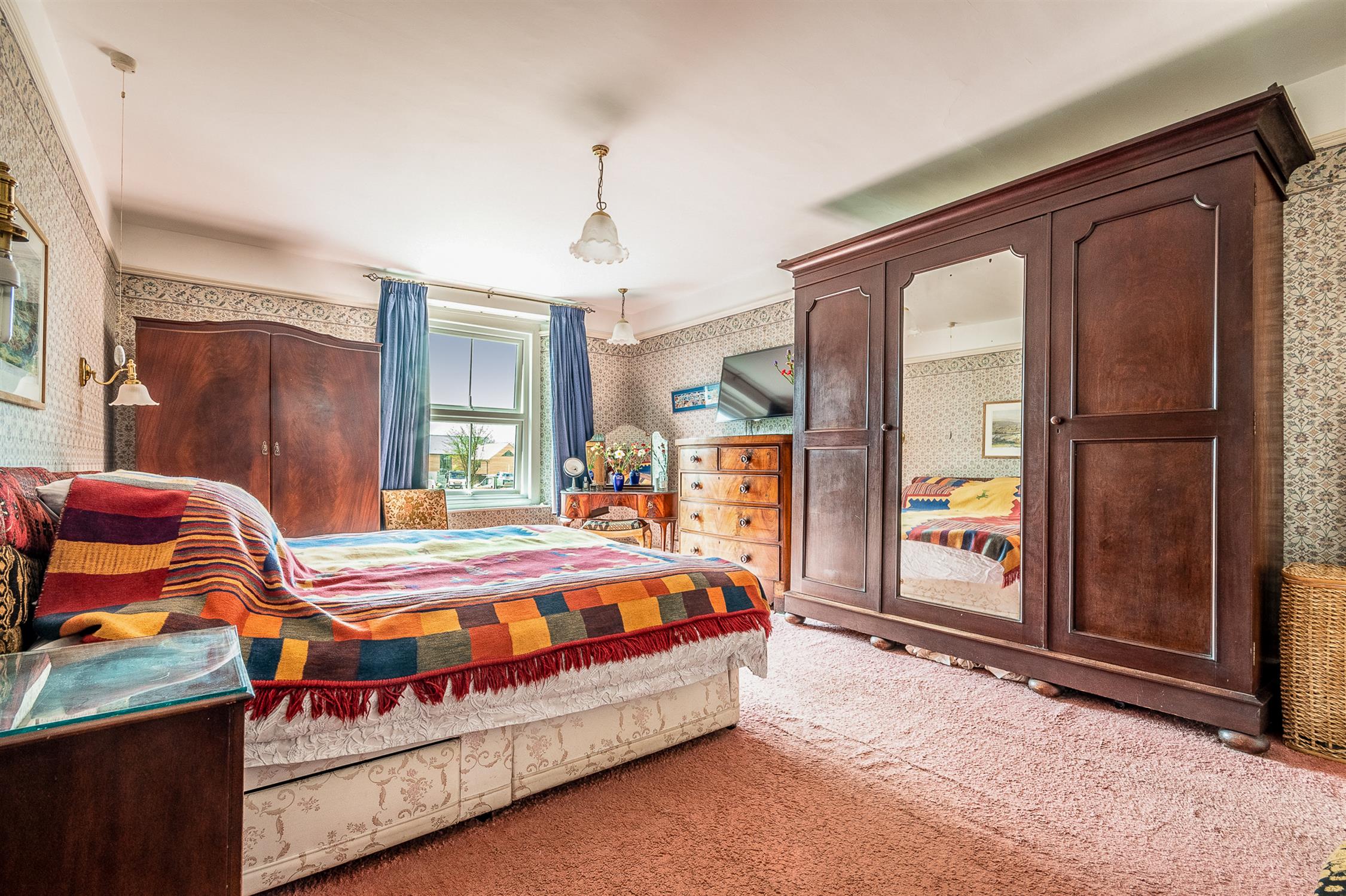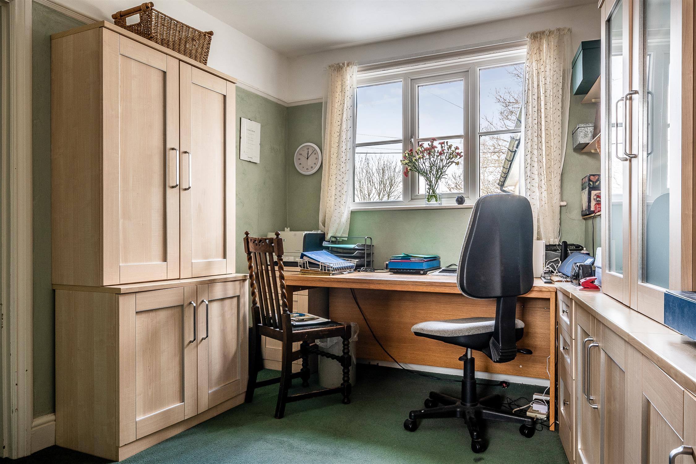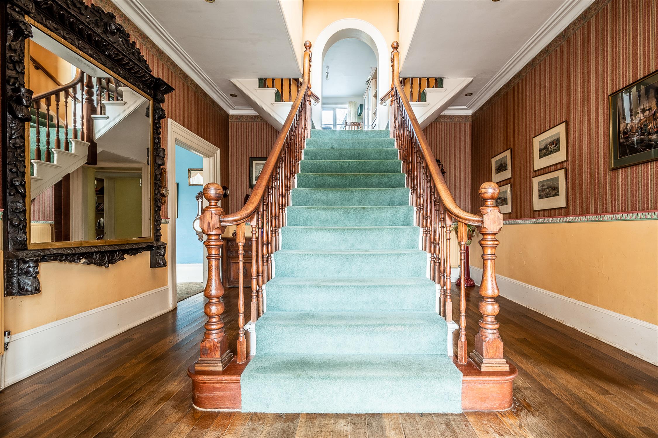 Stepping through the entrance vestibule, you are welcomed into a spacious reception hall, where a grand central staircase rises to the first floor. Two doors lead into the south-facing reception rooms, while an opening connects to the inner hall. Both the sitting room and dining room are bathed in natural light from elegant bay windows. The sitting room showcases a central ceiling rose and a charming fireplace with an open fire and decorative surround, while the dining room is distinguished by intricate ceiling cornicing and an open fireplace with a wooden surround. The kitchen/breakfast room, accessible from both the dining room and inner hall, is well-equipped with ample wall and base storage, a double oven, hob, and designated space for a dishwasher and fridge-freezer. From the inner hall, access is provided to the service rooms, which include a shower room with sink and WC, utility area, boiler room and a pantry, offering further storage and space for laundry appliances. From here, a door leads into the rear hall, offering access to the home office, storage rooms and rear garden.