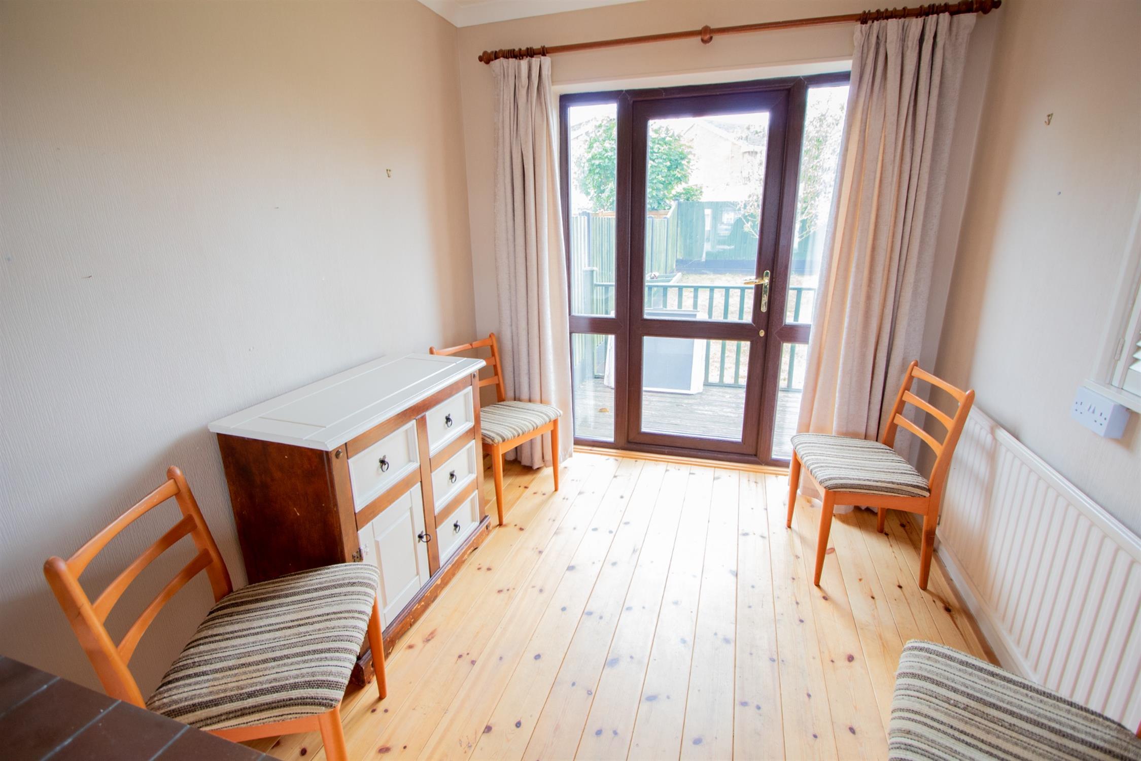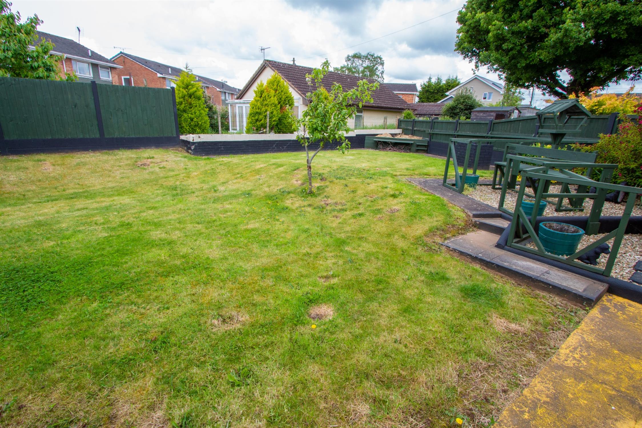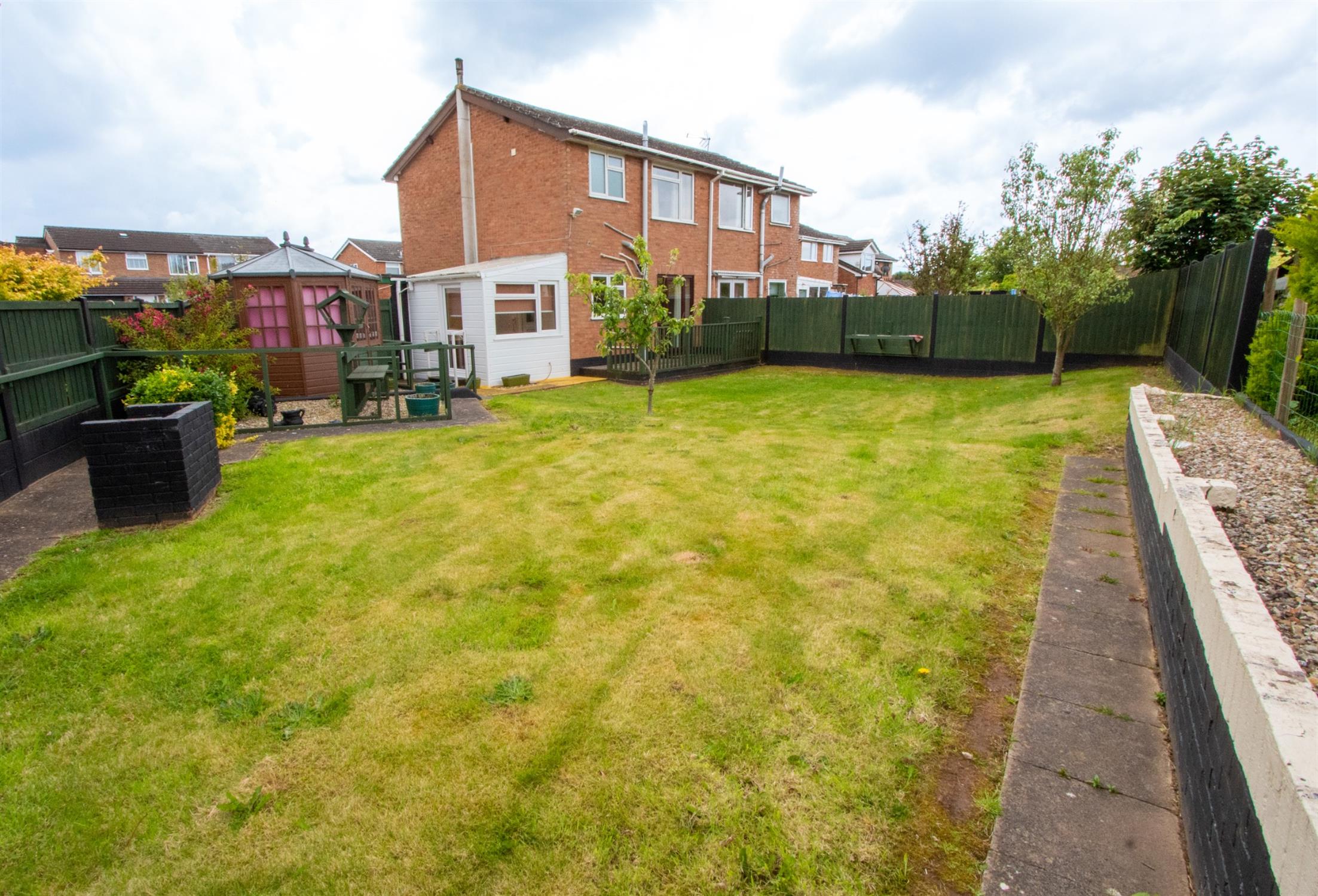 To the front of the property, is a driveway offering parking and which leads to the former garage, currently divided into 2 areas which could be easily reinstated as a garage with the removal of the stud wall. The front which is accessed via an up and over door and the rear which is accessed from the conservatory. A side pedestrian access leads to the rear garden, which is of a good size and laid mainly to lawn with a raised timber decked patio and summerhouse.