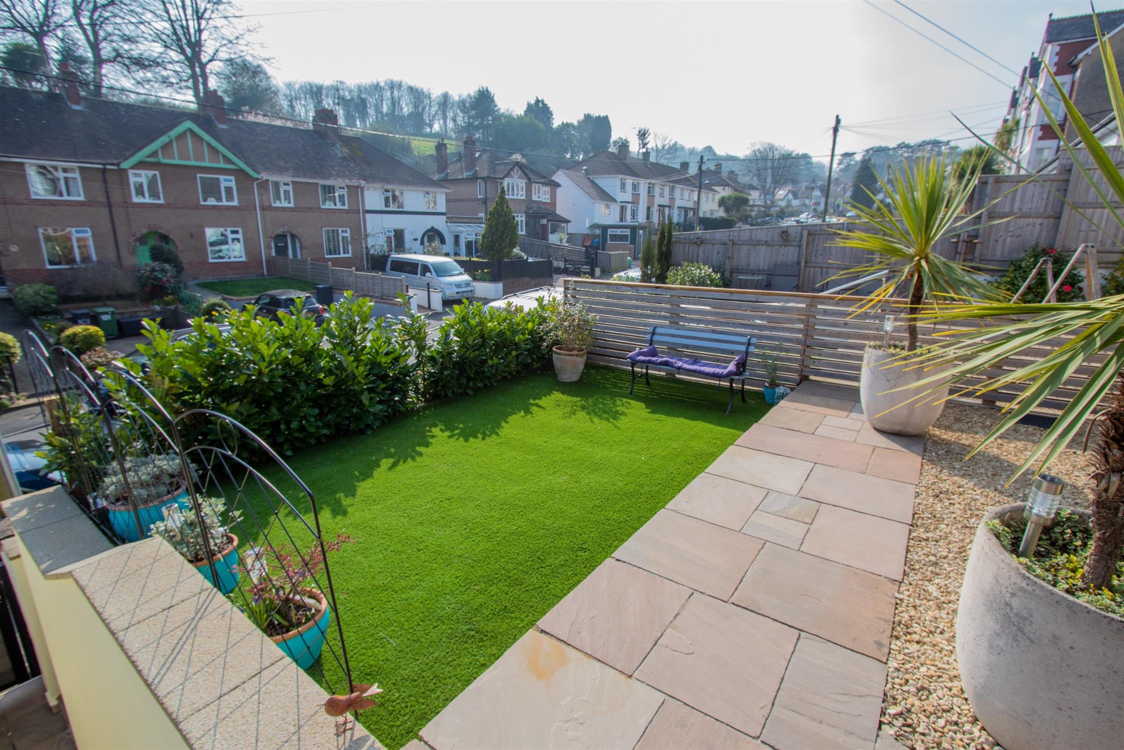 Outside Private staircase leading to the property with a road level bin store. Low maintenance gardens with Astro Turf level lawn and a large patio in Indian Sand Stone extending to the side of the property. Steps to a sun patio to the rear and two fitted sheds. Fantastic views over the Sidmouth Valley. Overlooking Winslade road is the Knapp Community Nature Reserve, consisting of a meadow, woodland, and an orchard and is accessed via the top of Winslade Road.