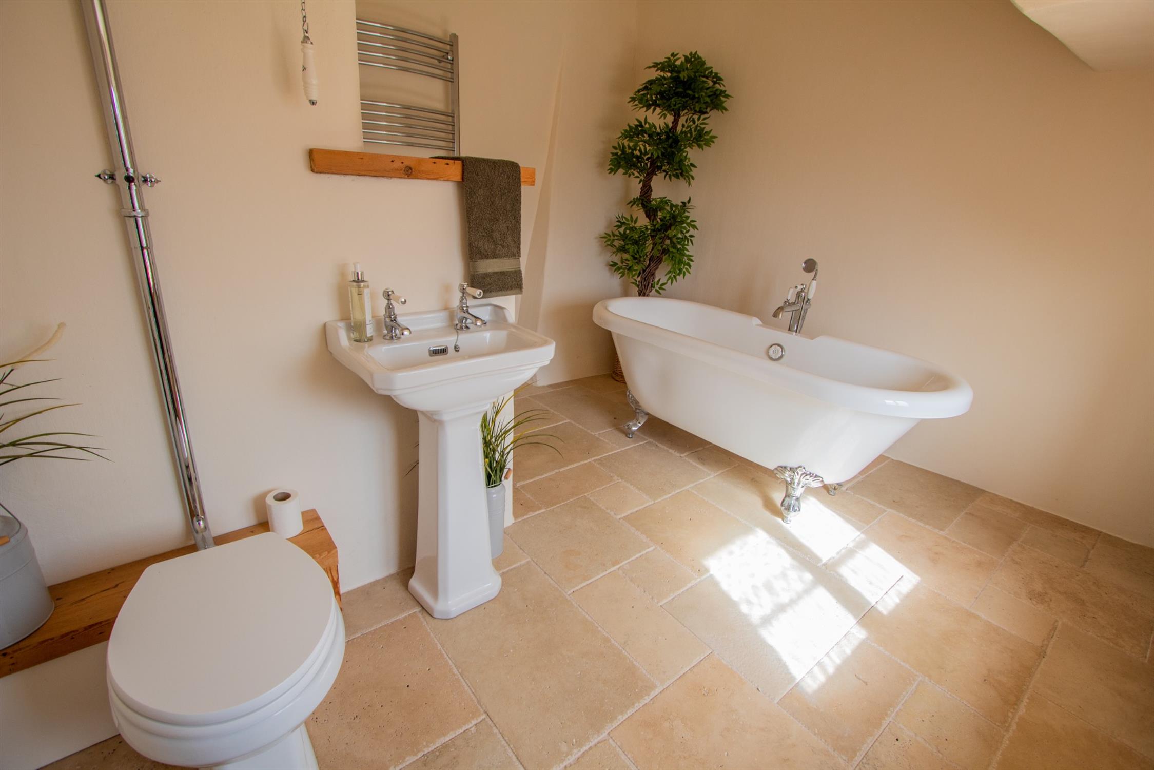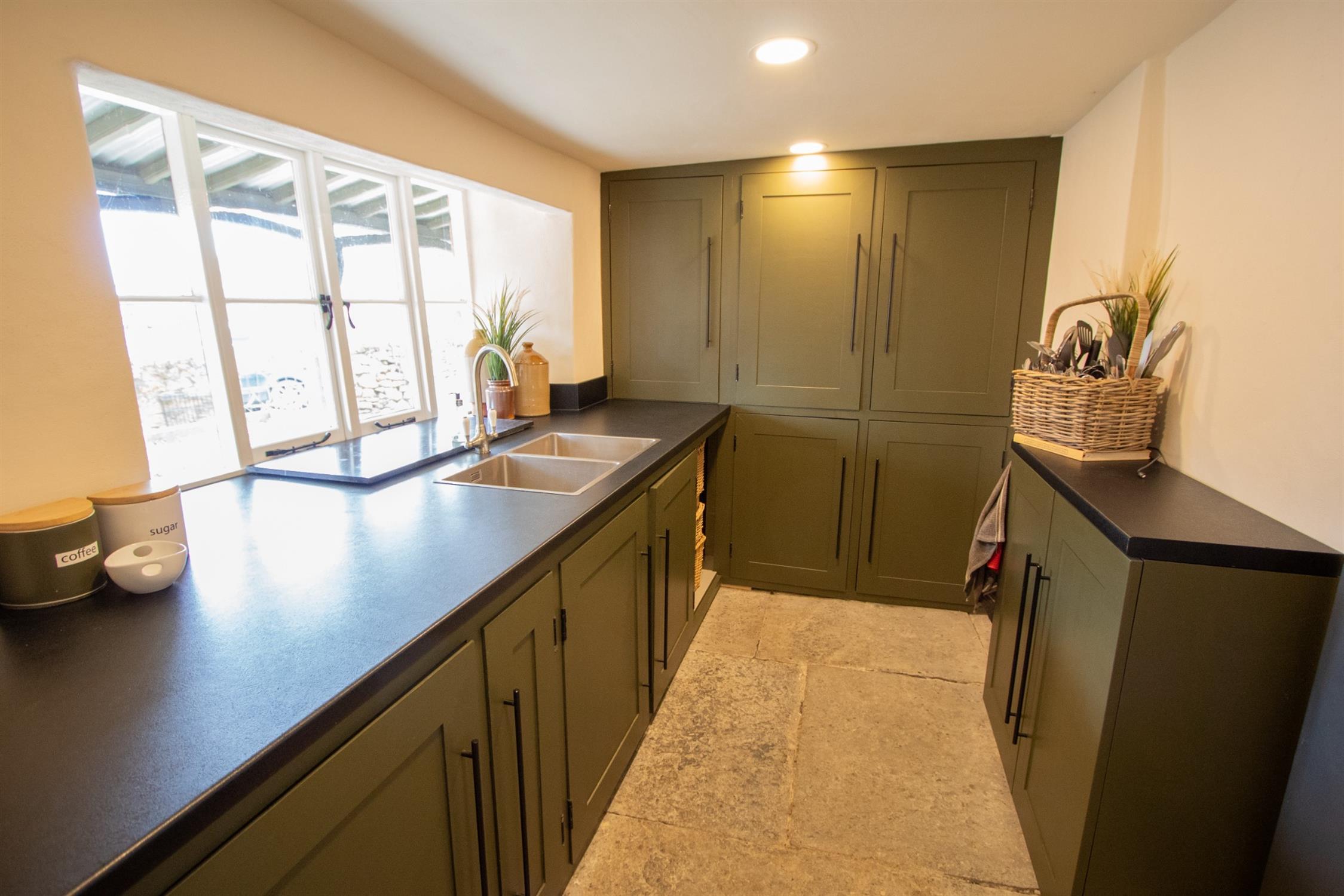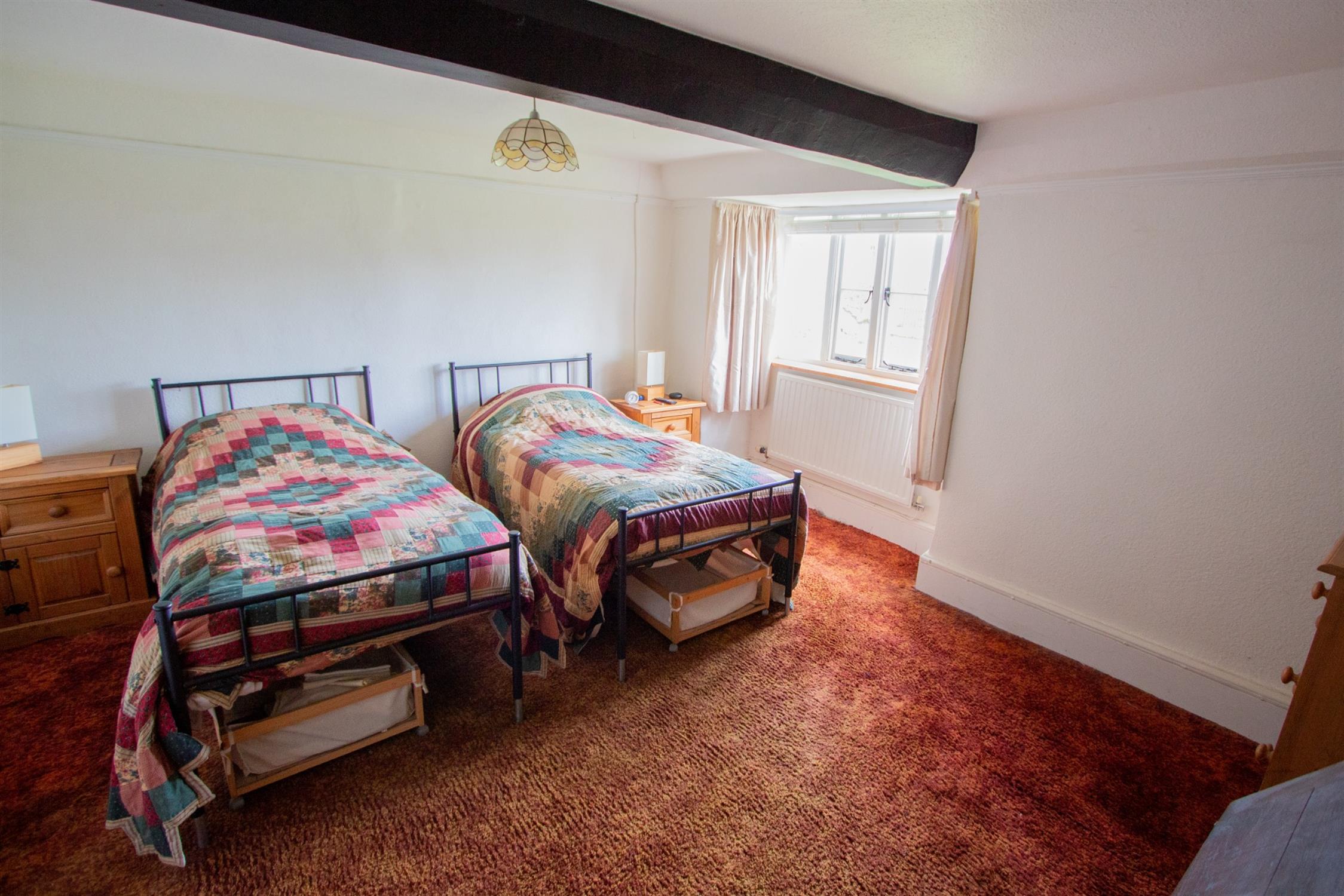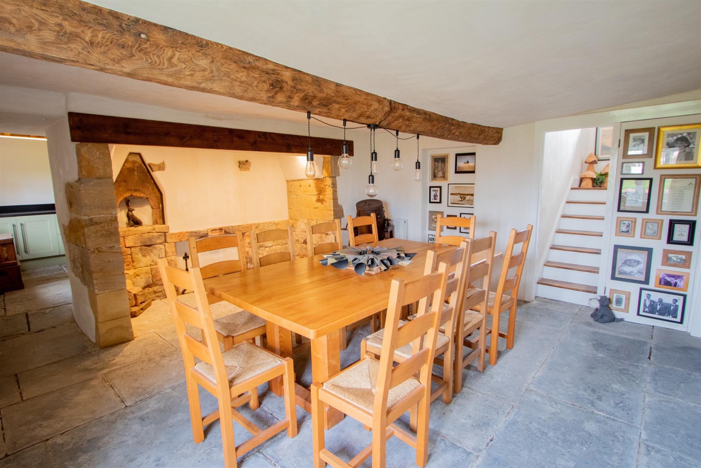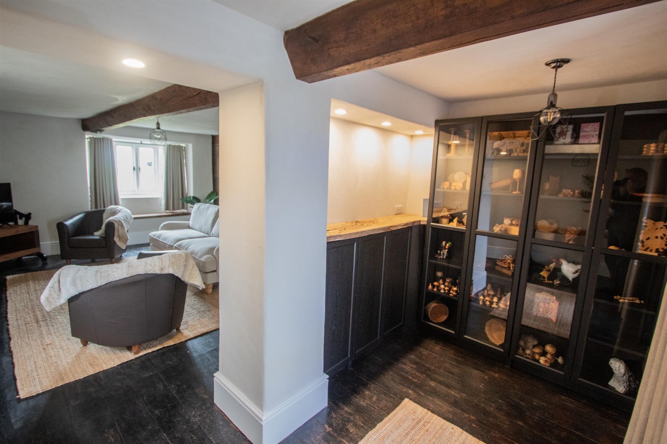 The fine cross-passage hallway leads to an inner hall which gives access to the principal ground floor rooms. At the western end of the house is a large dual aspect drawing room with a panelled wall and a fireplace, wooden flooring, a window seat and an exposed ceiling beam. This opens into a snug with wooden flooring, useful cupboards and a pair of stained glass doors into a south facing garden room. In addition to this room is a sitting room and a fabulous dining room with an enormous inglenook fireplace. This leads to an attractively fitted kitchen with a range cooker. Beyond this is a boot room, a utility room, and a wet room with under-floor heating. There is also a separate cloakroom off the inner hall. There are two separate staircases accessing the first floor where there are 4 bedrooms and a beautifully appointed bathroom with a freestanding clawfoot bath. The light and airy master bedroom enjoys a triple-aspect and exposed beams.