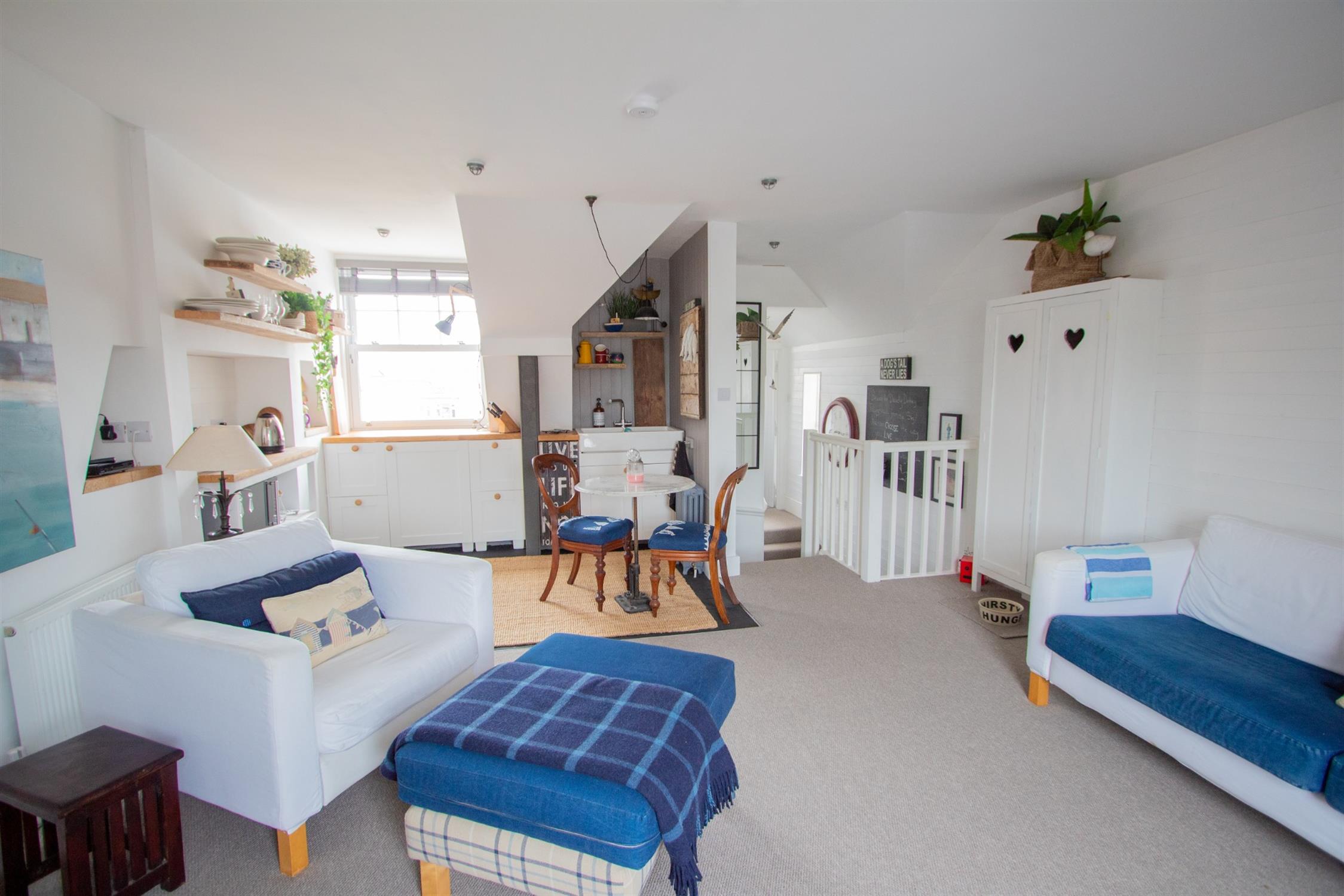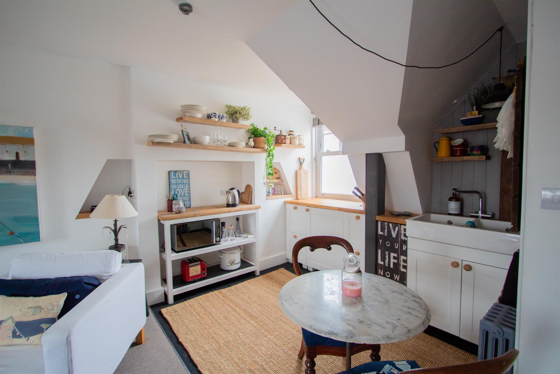 The property is accessed via a shared entrance with the two other flats. Stairs rise to the first floor where there is a private front door leading to the accommodation, which comprises; a dual-aspect sitting room and kitchen which is fitted with bespoke units, double butler's sink and integrated fridge/freezer with views over to Salcombe Hill. The double bedroom has fitted wardrobes and a sash window and contemporary family bathroom.