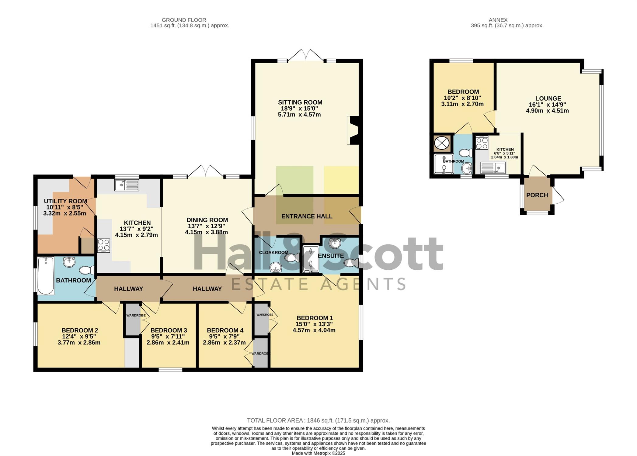 The separate detached annexe has a porch, a large lounge/dining room with adjoining kitchen, a double bedroom with fitted wardrobes, and an en-suite shower room.