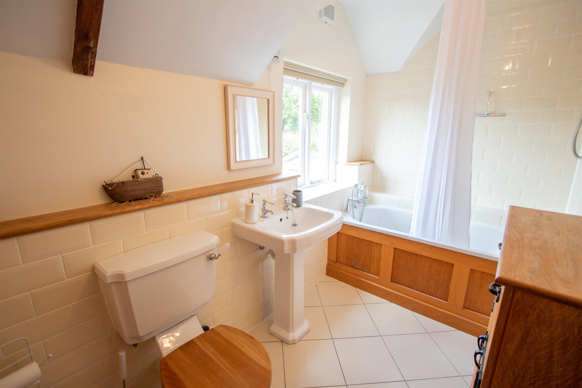 On the first floor, there are two bedrooms, with bedroom two enjoying views over the rear garden and the fields beyond, and a lovely bathroom suite also with a revealed beam.