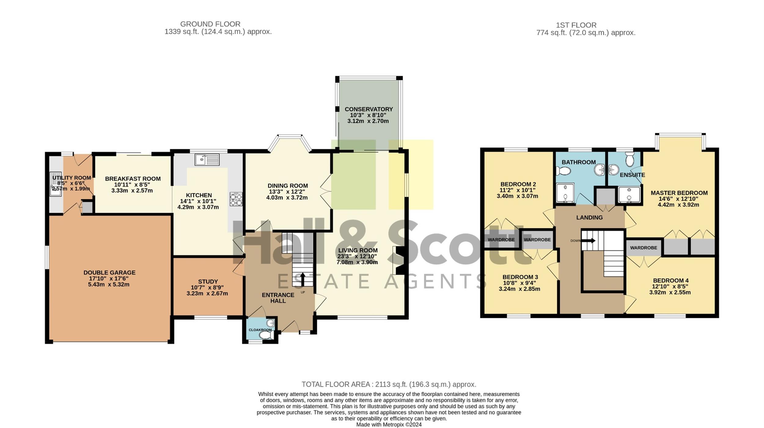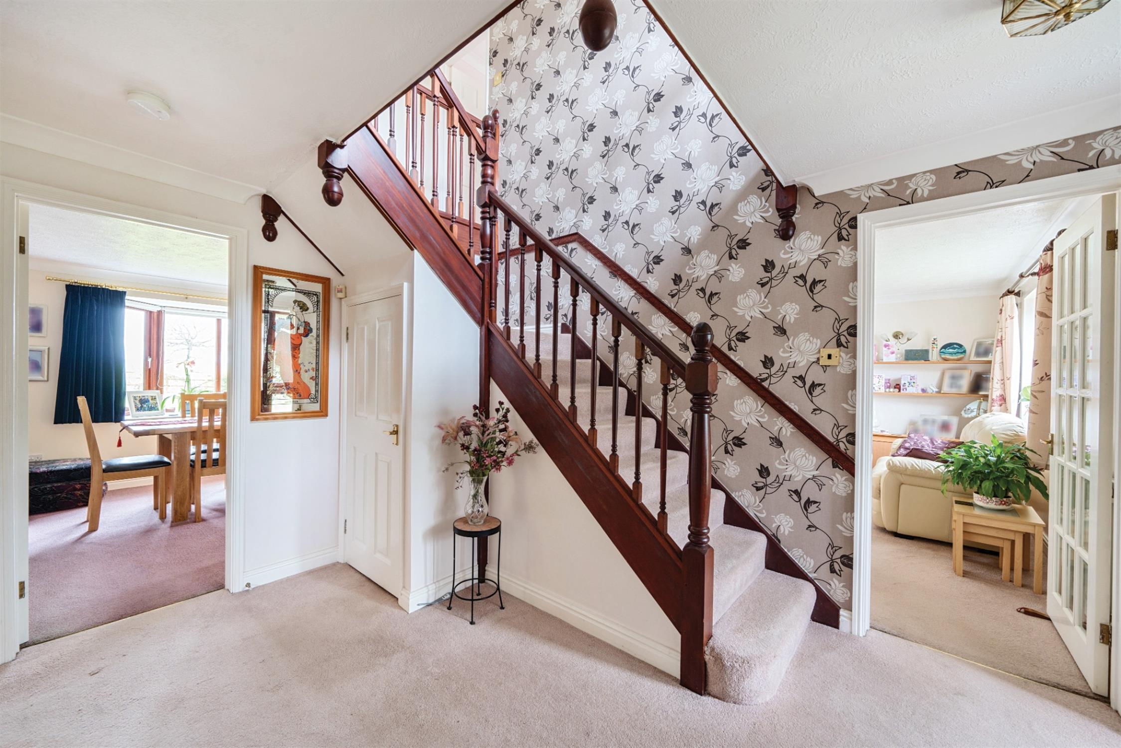 The accommodation is spacious and very well presented. Downstairs, it offers a light, bright hallway with a cloakroom and access to the dual-aspect living room with patio doors leading into the conservatory, and a wood-burning stove set in the fireplace. There is a separate dining room and study, ideal for working from home, a large fully fitted kitchen/breakfast room with induction hob, double oven and space for a dishwasher. From the breakfast room are patio doors leading to the garden. A door into the fitted utility room with space for a washing machine and tumble dryer. Doors lead into the double garage and out to the garden.