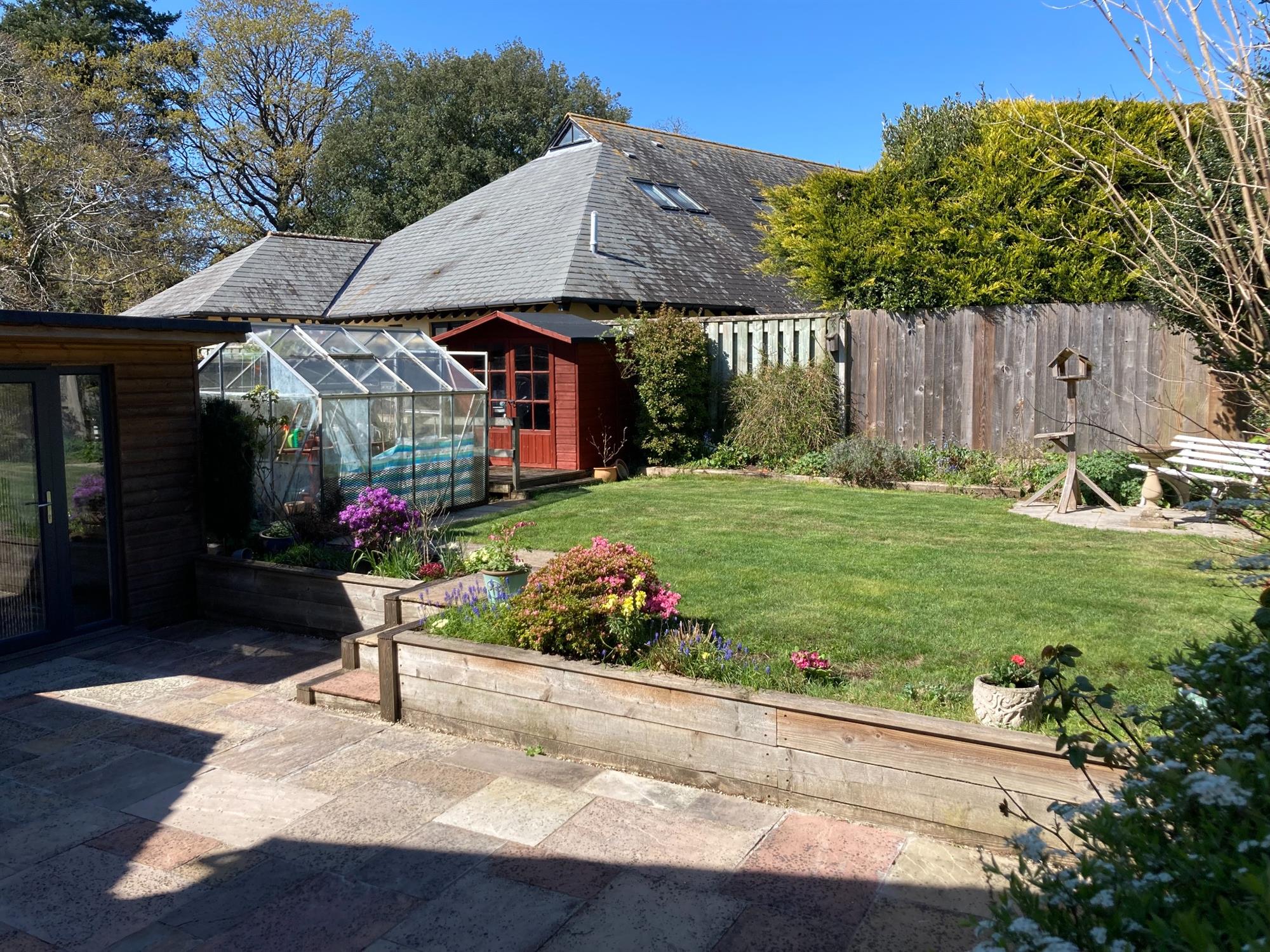 To the front of the property is a paved car hard standing and an independent long drive which offers further parking and leads to the garage (4.95m x 2.53m) which has an up-and-over door, light, power and personal door into the rear garden. There is a side pedestrian access which leads to the rear garden, which is attractively laid out with a large paved patio area, office (2.65m x 1.26m), steps up to a lawned garden, second patio, greenhouse and summerhouse with decking to the front.