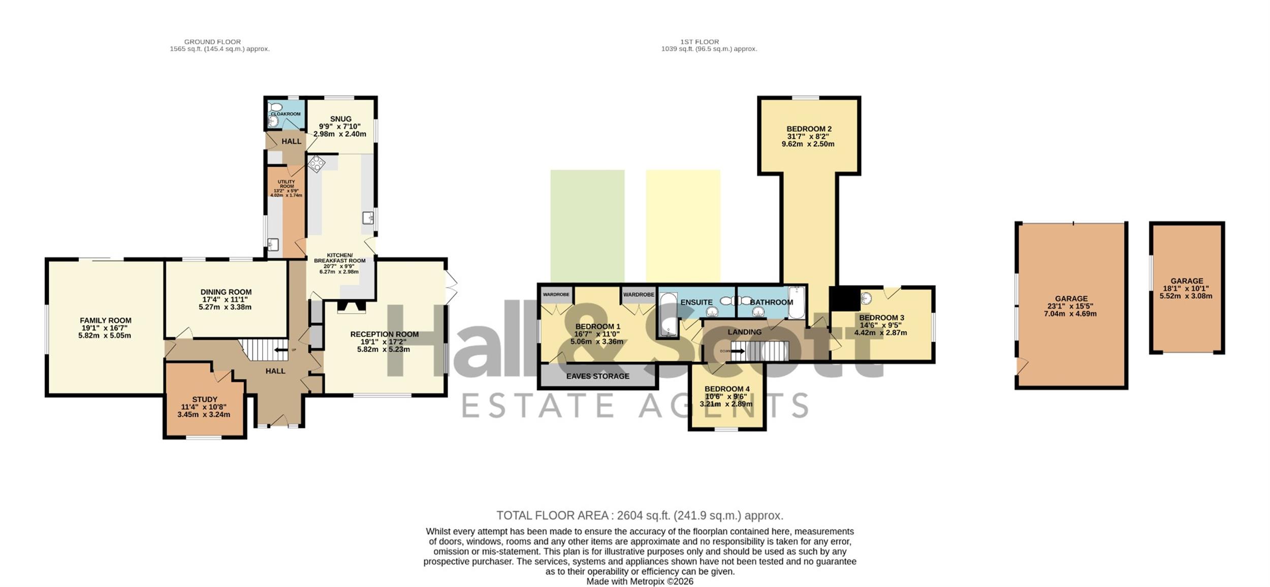 The ground floor accommodation comprises a spacious entrance hall, dual-aspect living room, kitchen/breakfast room, snug, family room, dining room, study, cloakroom and utility room. On the first floor are four bedrooms and two bathrooms. The flexible layout lends itself well to a variety of uses, including a potential granny annexe, home working, or generous family living.