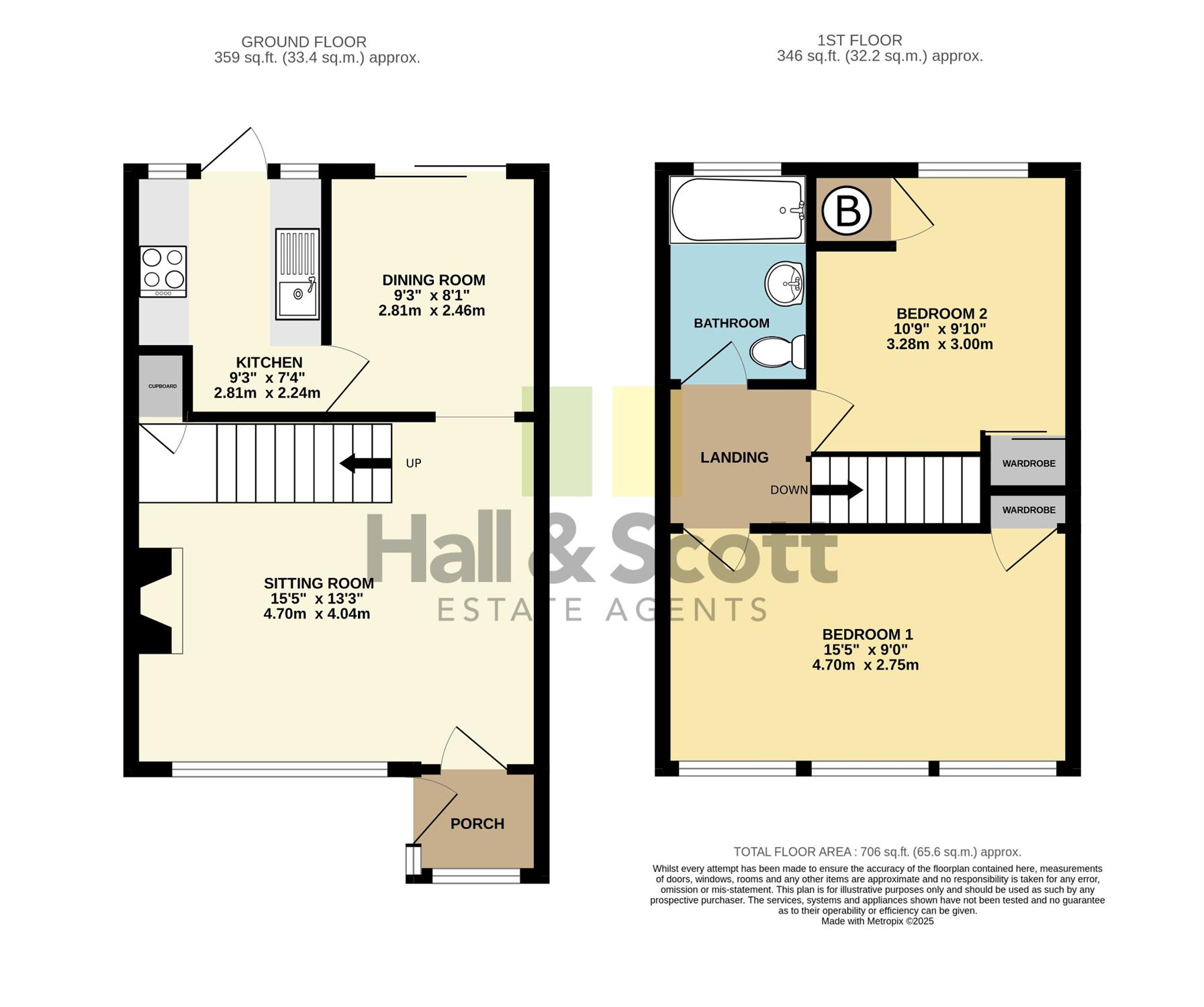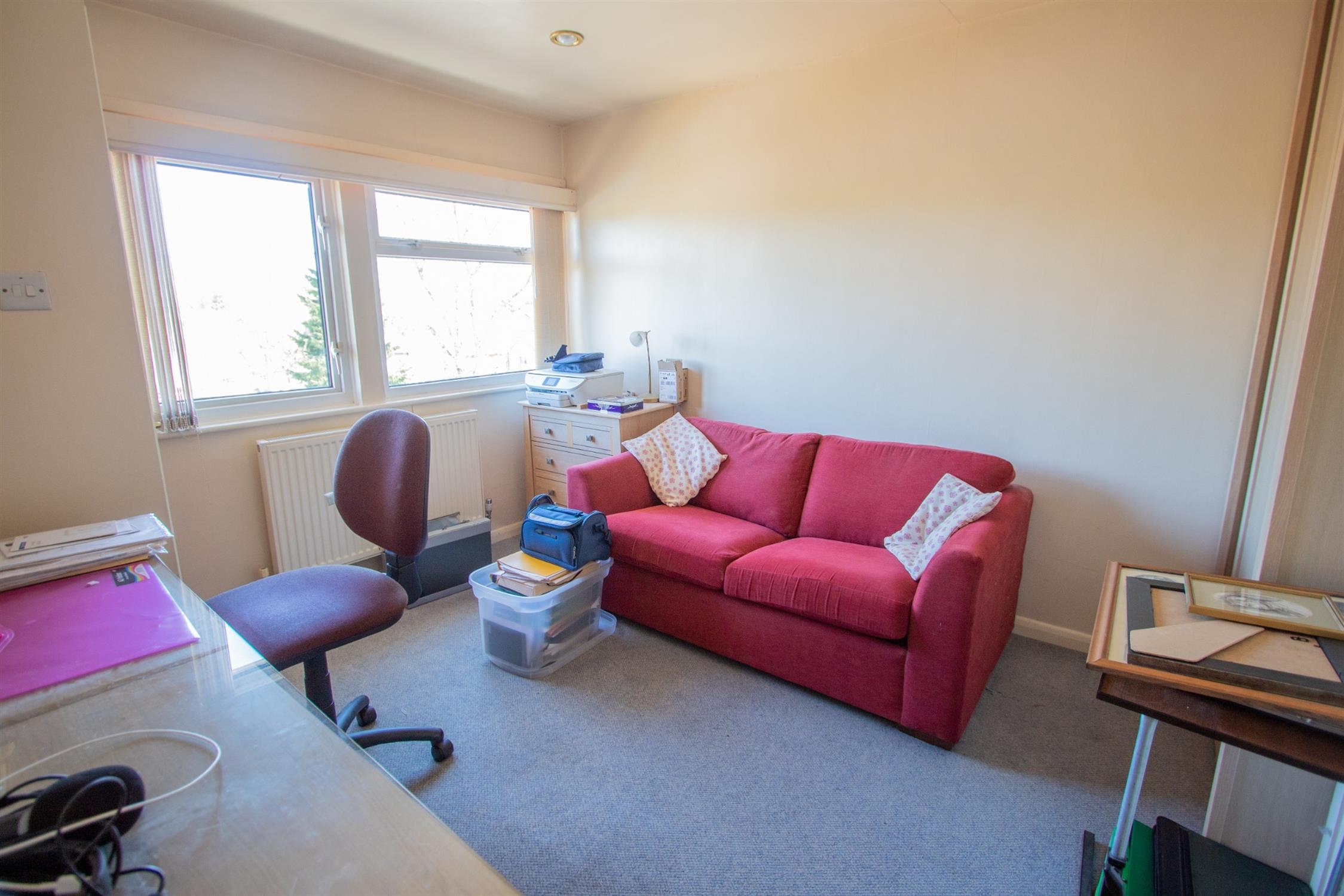 Upstairs, there are two double bedrooms. The main bedroom is a large, sunny room with fitted wardrobes and cupboard. The room has expansive windows that flood the space with light. The second bedroom enjoys far-reaching views over open countryside and has a fitted wardrobe and airing cupboard. A well-appointed family bathroom completes the first floor.