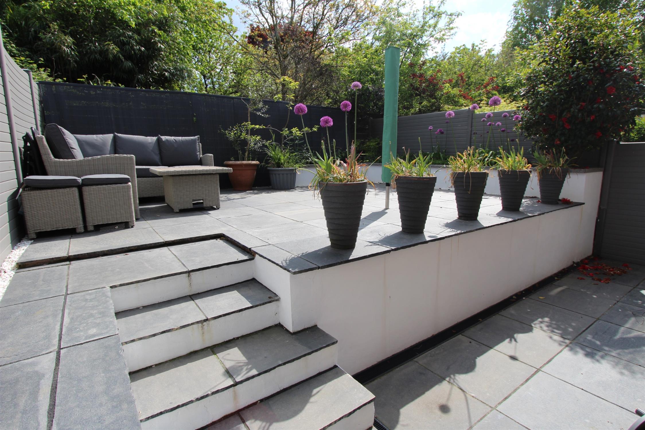 The front garden has two gravelled areas and well-stocked borders, side pedestrian access leads to the rear garden. This is a lovely feature of the property and designed with ease of maintenance in mind. It is arranged on 2 levels, paved, with raised flowerbeds. There are also maintenance-free fences. Garage in block.