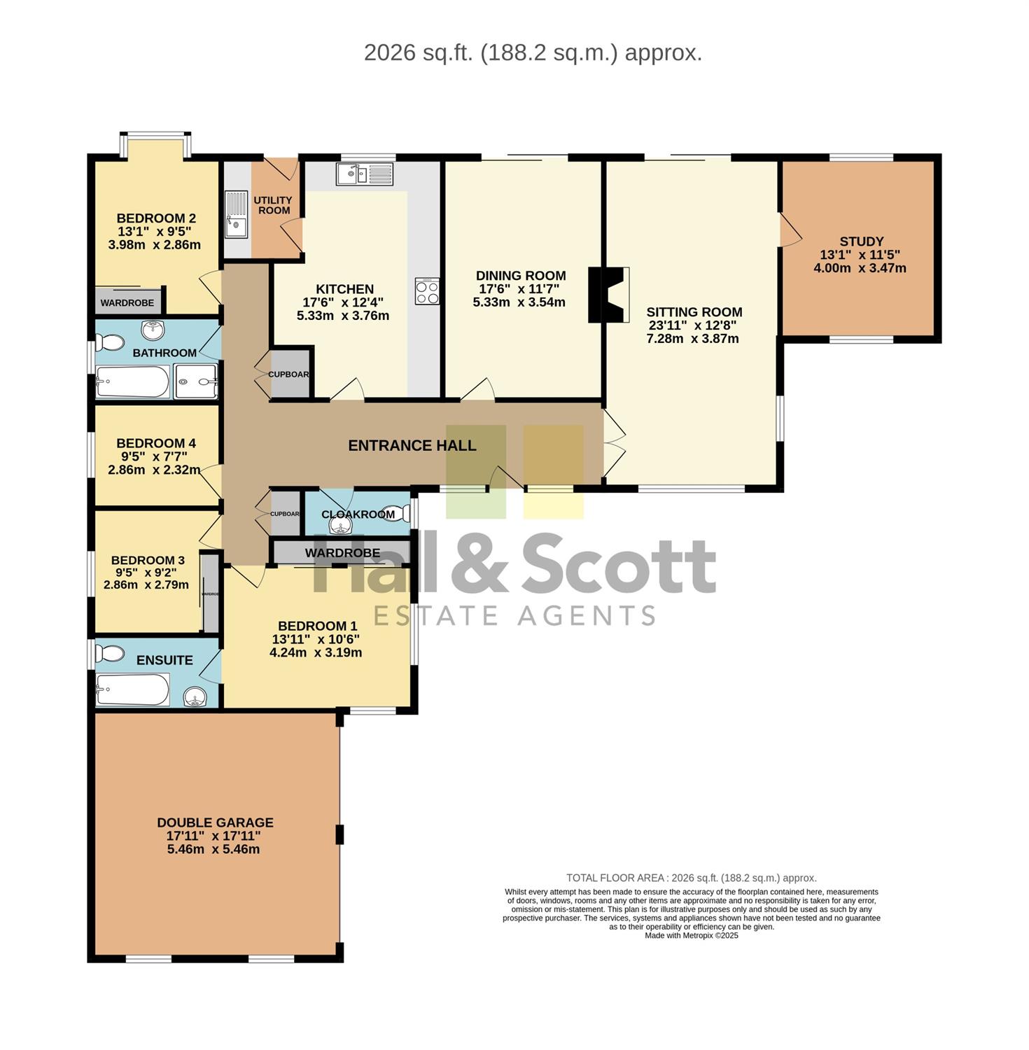 The accommodation comprises: a spacious entrance hallway with cloak cupboards, cloakroom, triple aspect sitting room, an ornamental brick fireplace with gas fire, French doors into the rear garden. From the sitting room there is a door into a dual-aspect study. There is a separate dining room also with French doors into the rear garden. The kitchen/breakfast room has a range of wall and base units, worktop surfaces, breakfast bar, built-in oven and hob with extractor over, an American-style fridge/freezer and leads through to the utility room which has tiled flooring and access into the rear garden. There are 4 bedrooms; The master has a range of built-in wardrobes and an en-suite bathroom with tiled flooring. Bedrooms 2 and 3 also have built-in wardrobes. Bedroom 4, which is currently used as a study, has built-in cupboards. There is a family shower room.