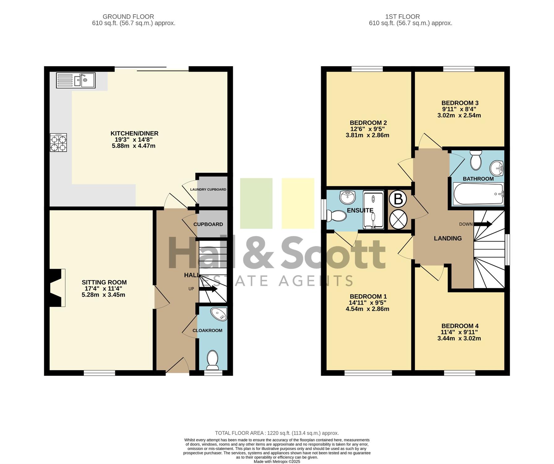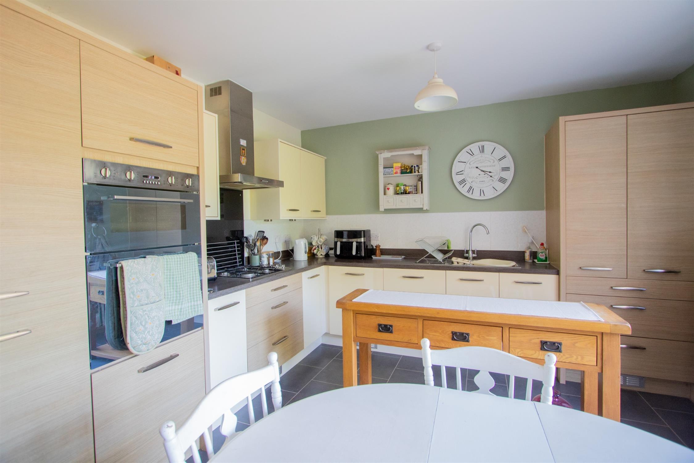 The property has been finished to a high standard, with quality fixtures and fittings throughout. The accommodation is light, airy, and thoughtfully laid out, featuring a generously sized living room, with feature fireplace, and an impressive kitchen/breakfast/family room, fully fitted with integrated appliances and French doors opening onto the rear garden — ideal for entertaining and everyday family life. A useful laundry cupboard provides a discreet space for both a washing machine and tumble dryer. A cloakroom makes up the ground floor.