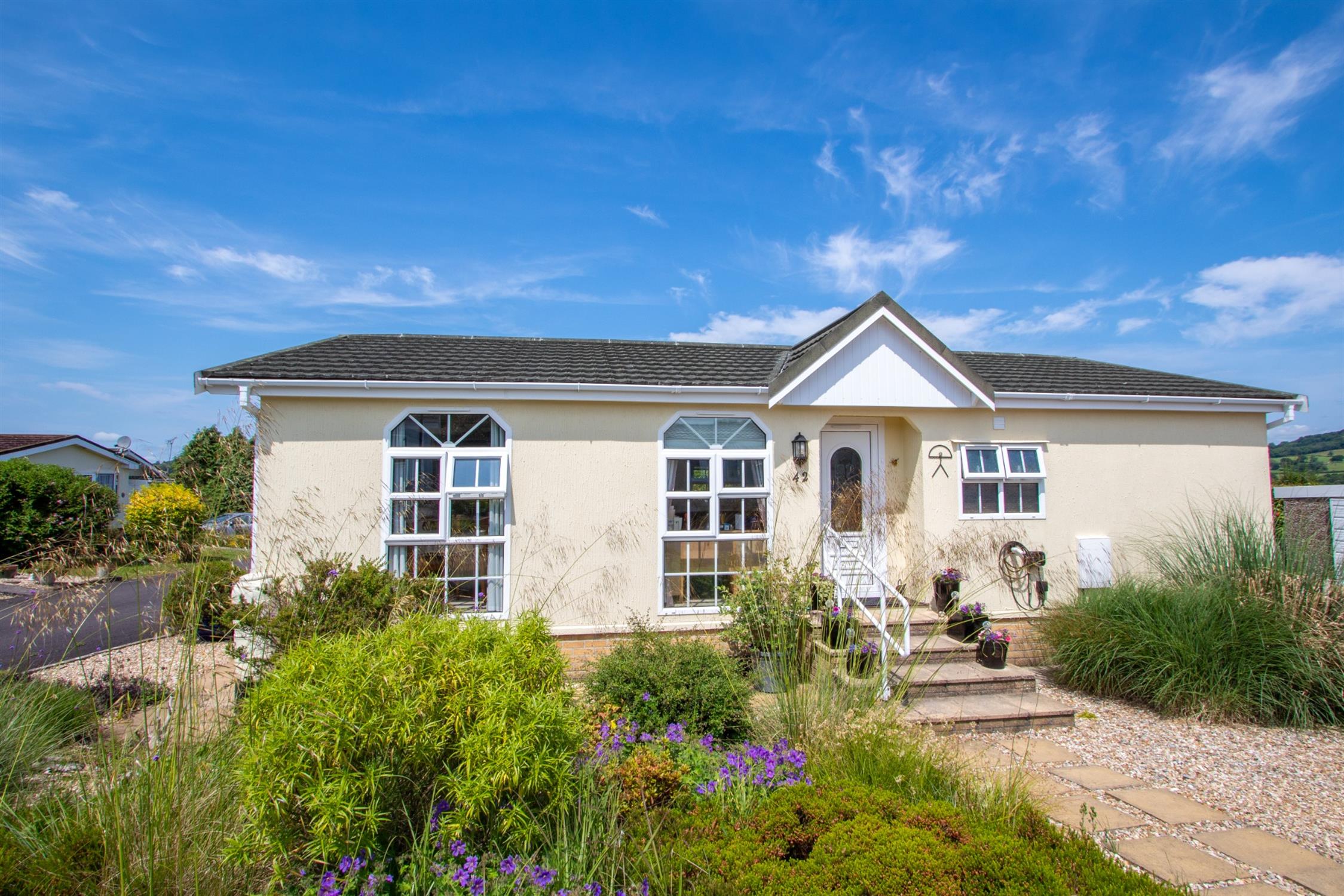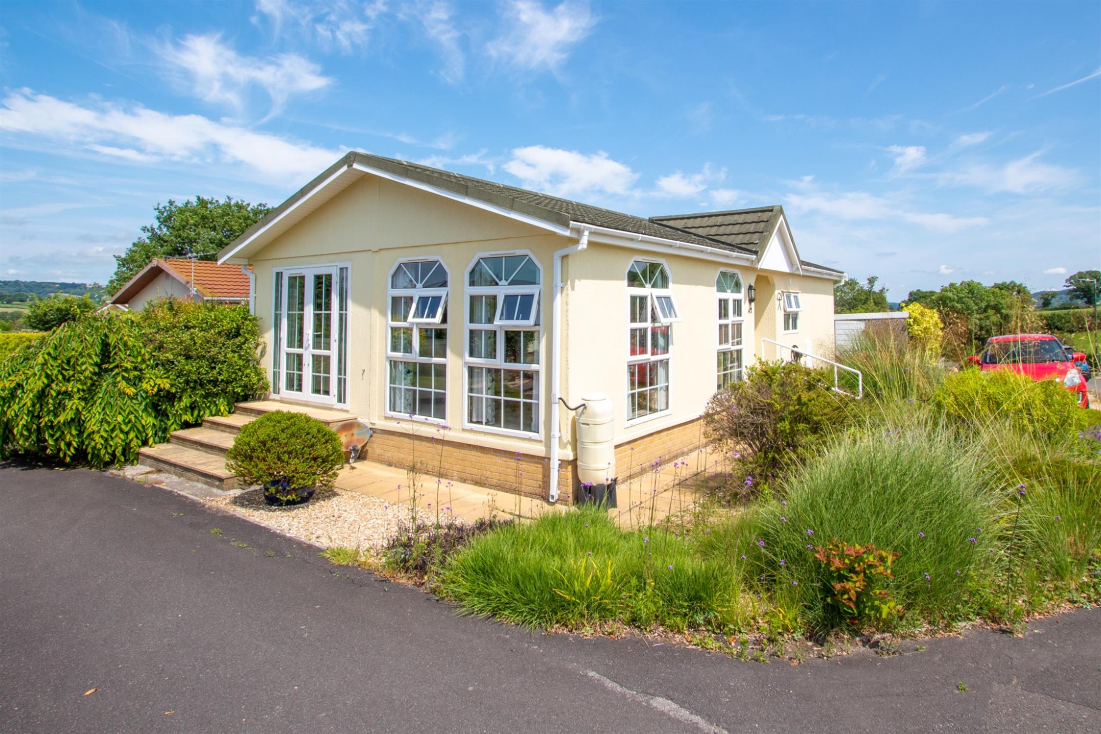 Delightfully presented, 38ft detached park home, which was the original 'Show Home' on a level plot, with parking. Very convenient for Honiton Town Centre. NO ONWARD CHAIN.