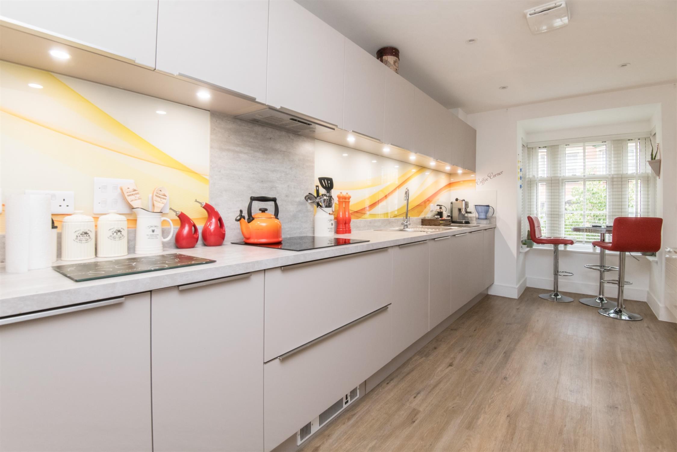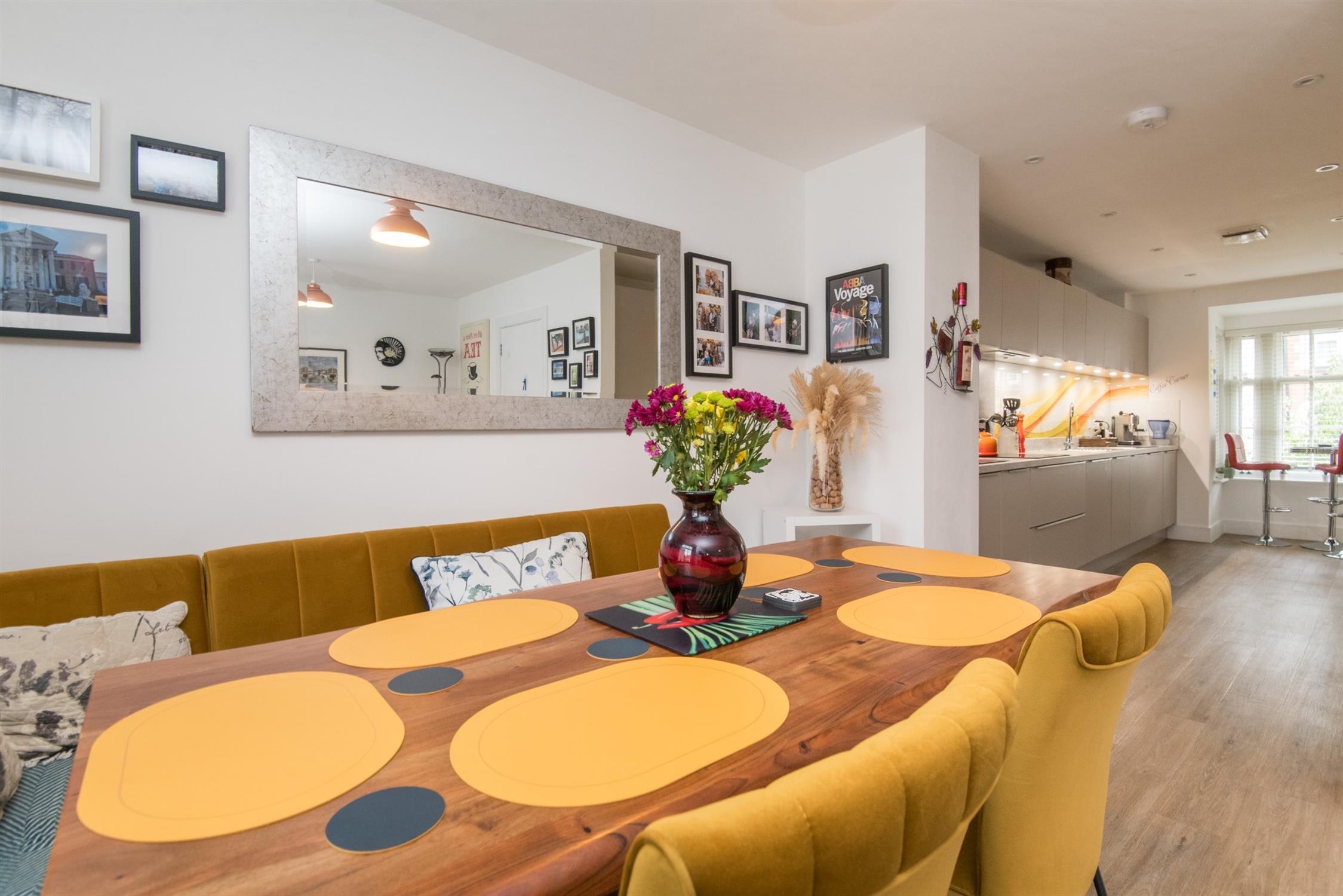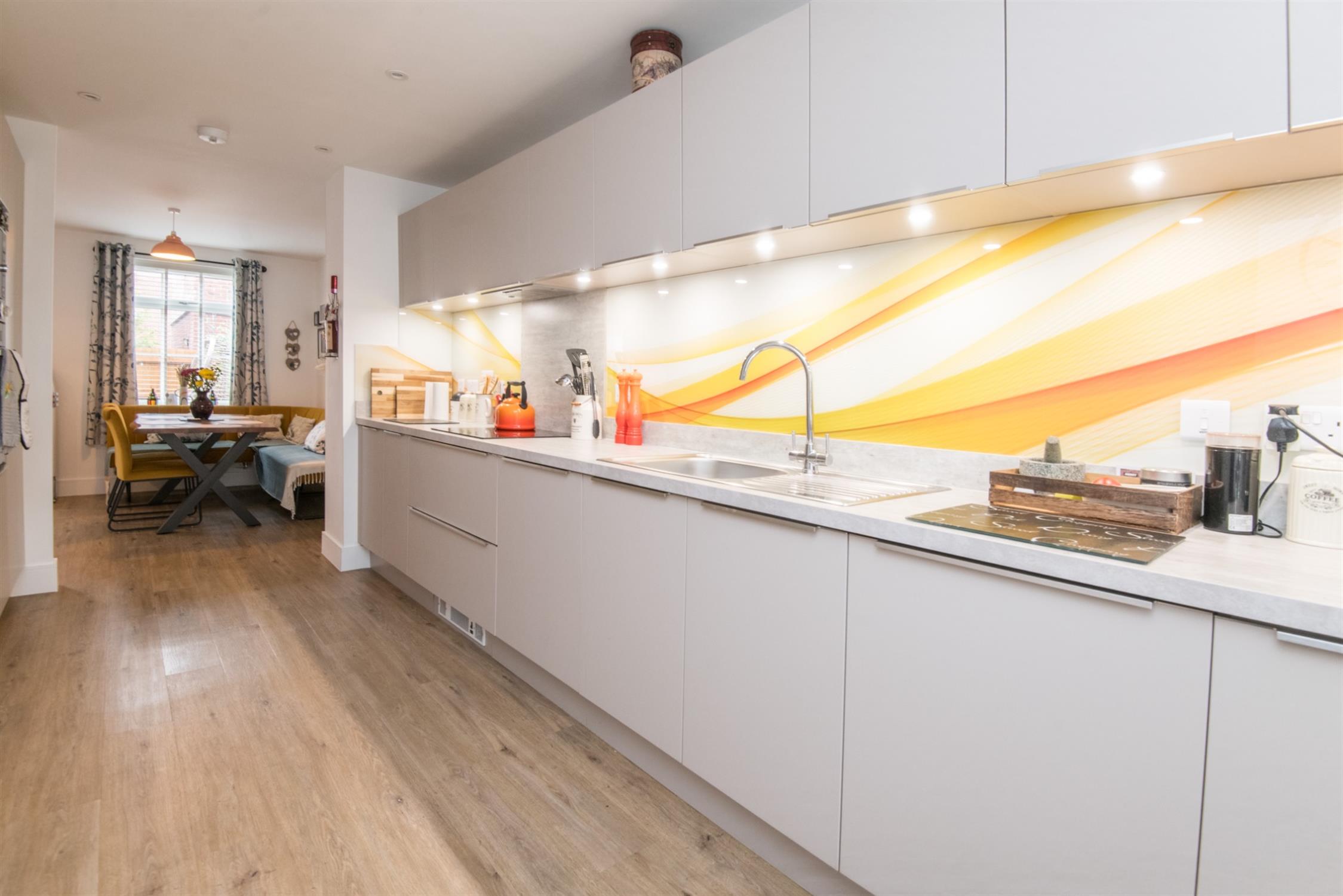 The accommodation comprises: entrance hallway with two built-in cupboards, cloakroom, kitchen/breakfast room with fitted wall and base units, integrated under-cabinet lighting, striking splashback, integrated dishwasher, integrated fridge/freezer, washing machine, built-in oven and hob with extractor hood over, built-in microwave and wine cooler, under unit lighting, the kitchen opens into the sitting/dining room, with double doors into the rear garden.