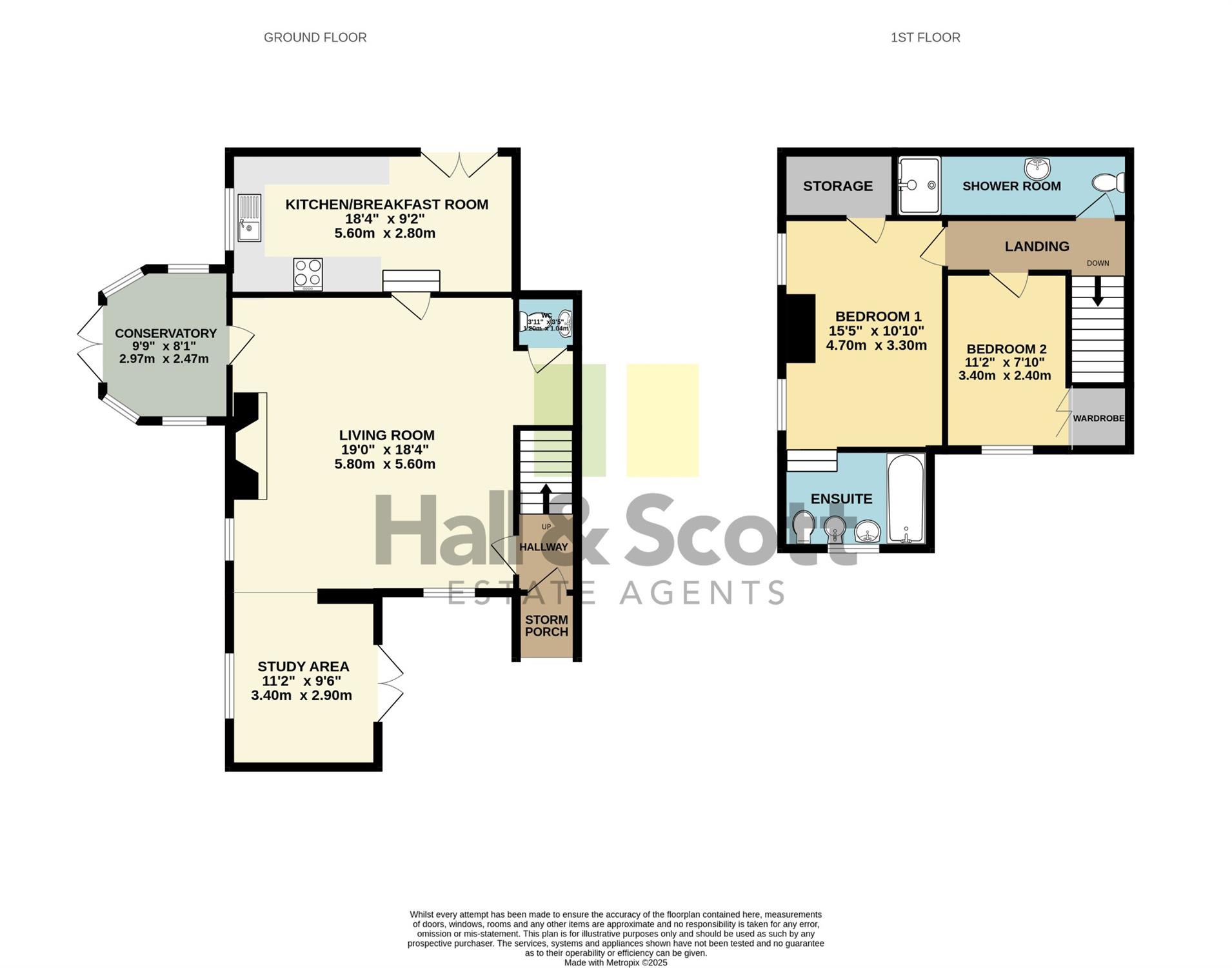 On the first floor there are 2 bedrooms, the master with an ensuite bathroom, and a separate shower room.