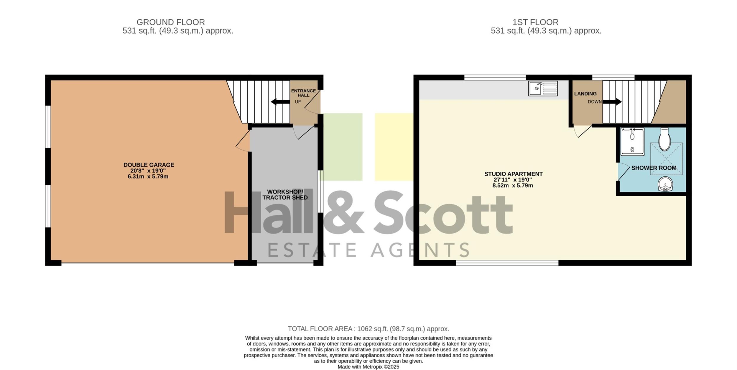 Double garage & workshop (26' 3" x 19') 8m x 5.79m. 2 electric roll-up doors, light and power. Internal door to the workshop/tractor shed, a further door to a lower hallway area with radiator, and a staircase with stained balustrades providing access to the studio apartment. There is also an outside door to the studio.