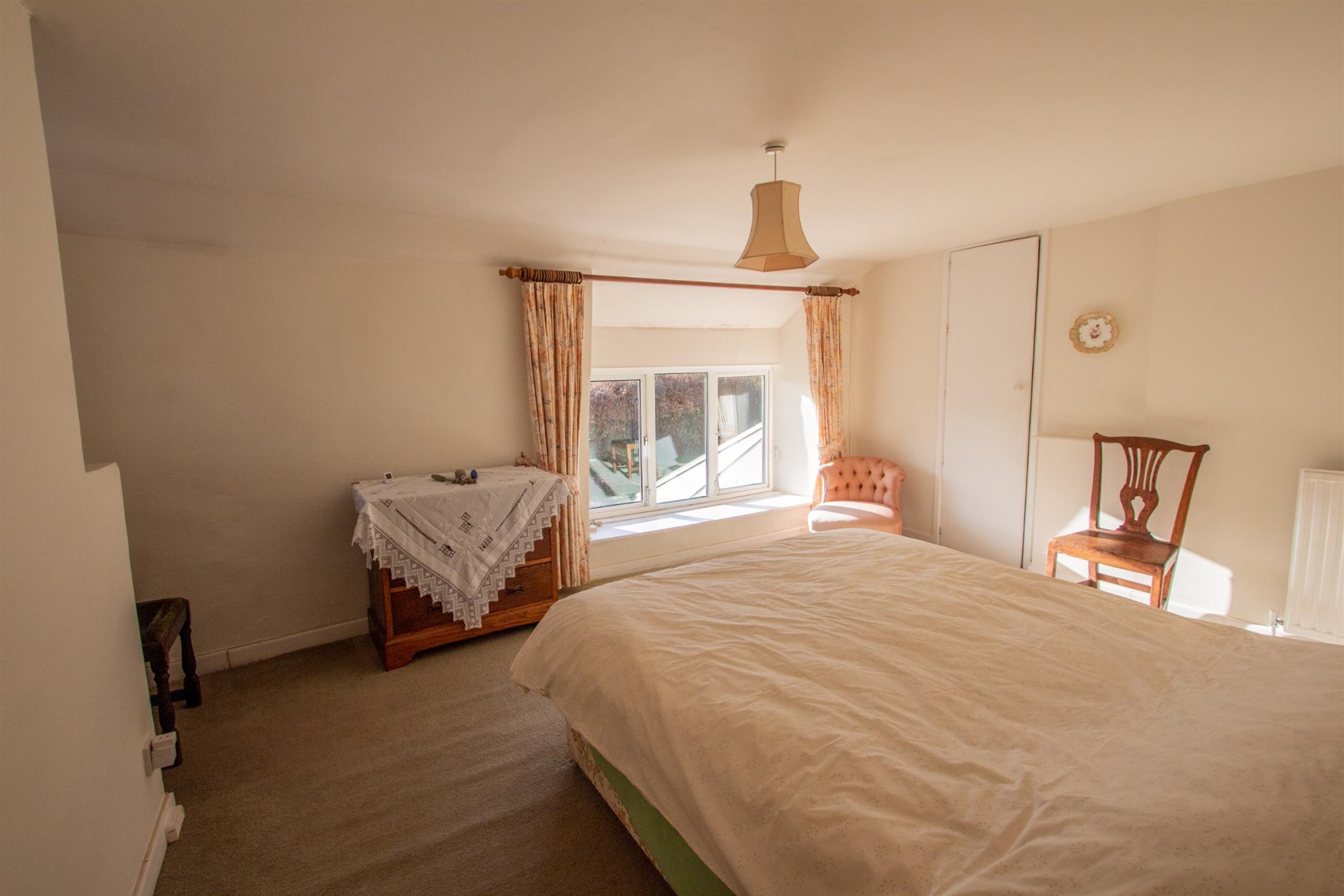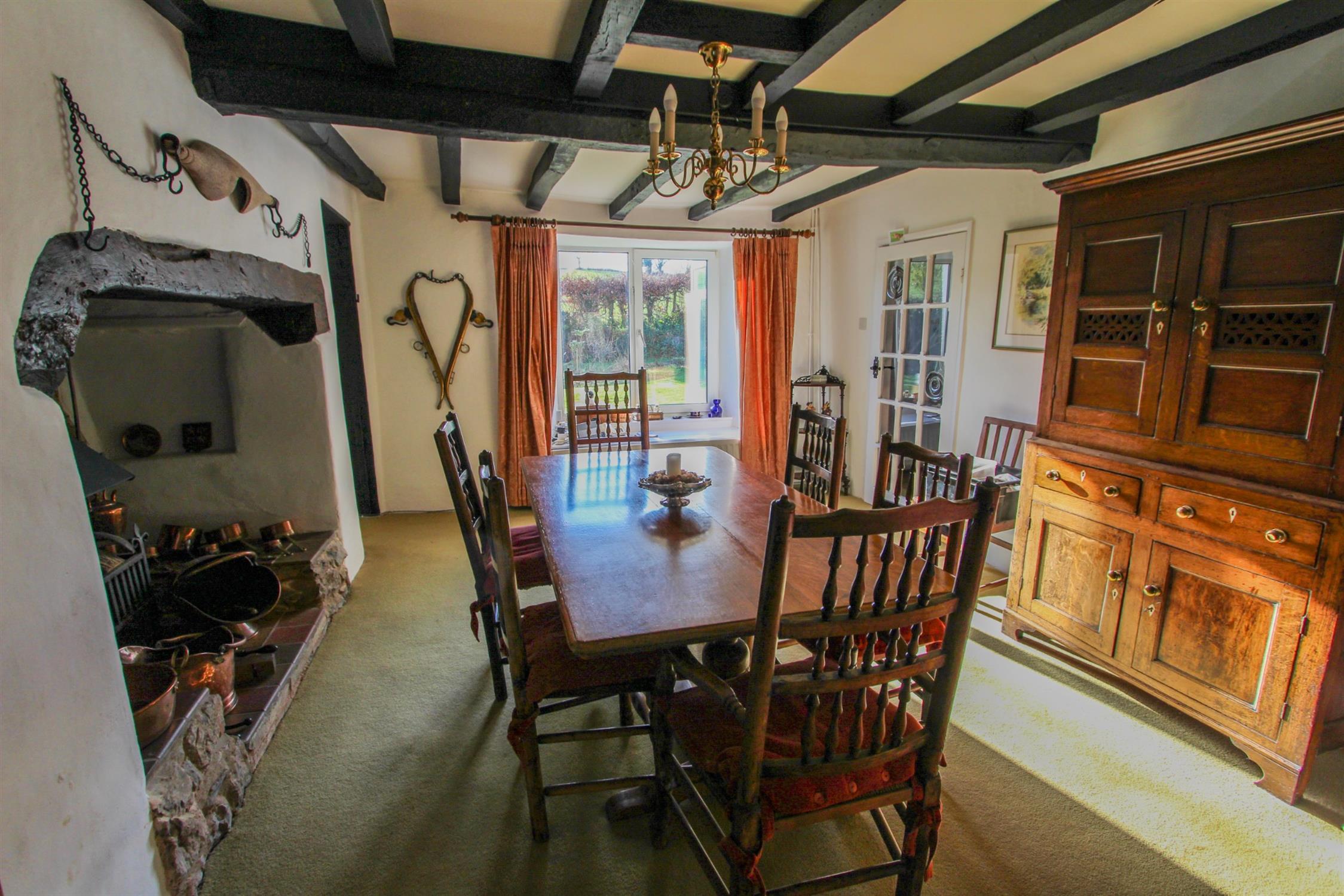 Upon entering, the timeless character of this Devon longhouse is immediately apparent. The hallway opens into an impressive and beautifully proportioned living room, rich in charm with an open fireplace and an abundance of exposed beams. Originally two separate rooms, this elegant space now benefits from large windows with window seats, perfectly positioned to overlook the south-facing front garden.