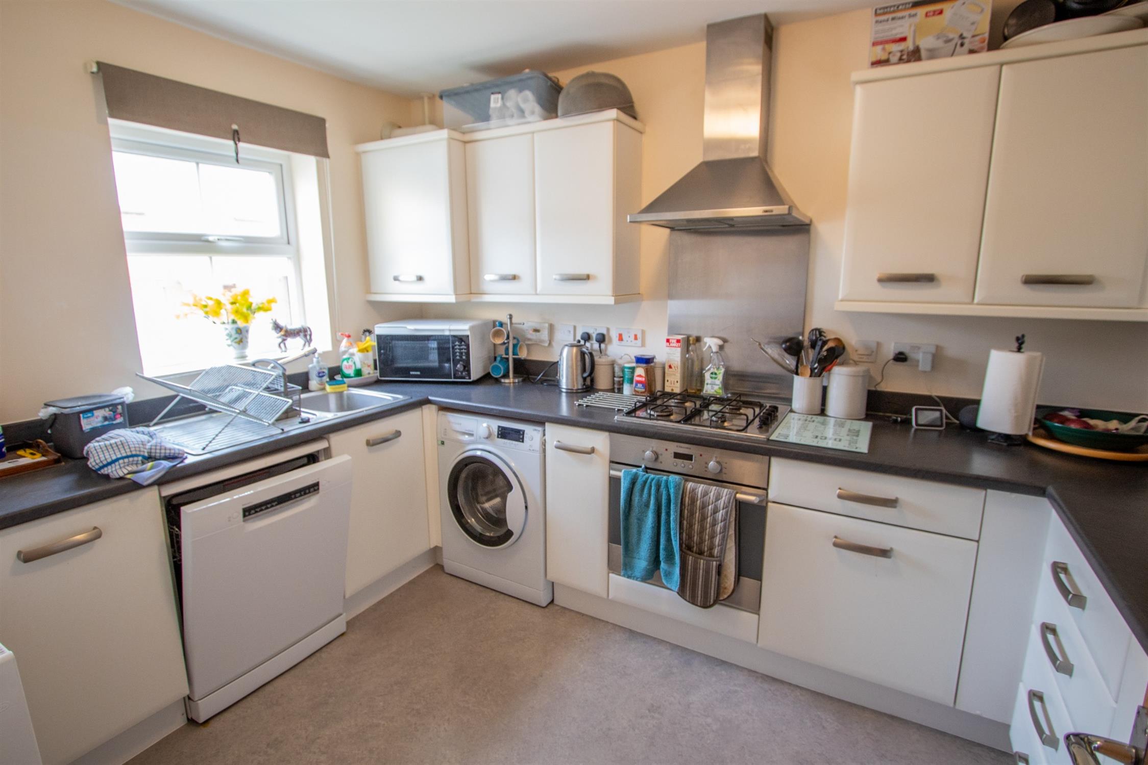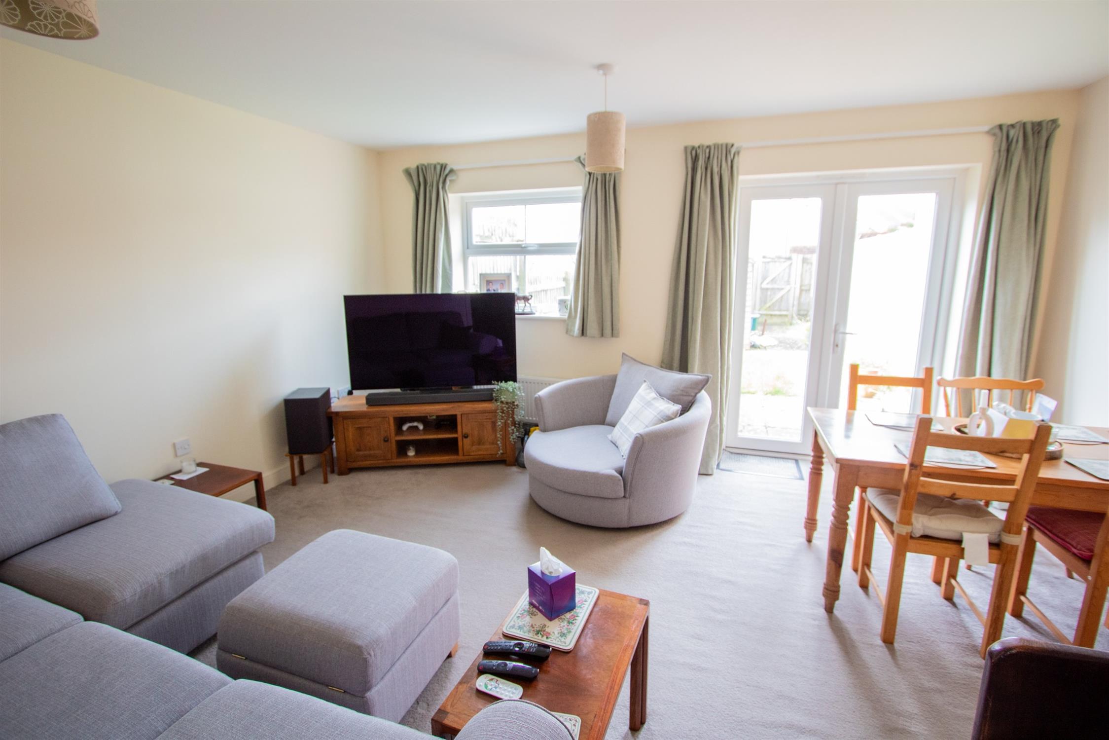 The house benefits from gas central heating and uPVC double glazing, and also from solar panels with a feed-in tariff. A spacious hallway with a downstairs WC leads to the comprehensively fitted kitchen/breakfast room, which features modern units in a white finish with roll-edged worktops and a stainless steel sink unit. Integrated appliances include an integrated oven, gas hob and extractor hood, and there is plumbing for a dishwasher and a washing machine and space for a large fridge freezer. A wall cupboard conceals the gas central heating boiler. The lounge/dining room has french doors to a sunny patio and the garden, and a large store cupboard. Upstairs there are three good-sized bedrooms and a family bathroom. The spacious master bedroom includes an ensuite shower room, built-in wardrobes, and a large built-in cupboard. There is also a built-in wardrobe in bedroom 2.