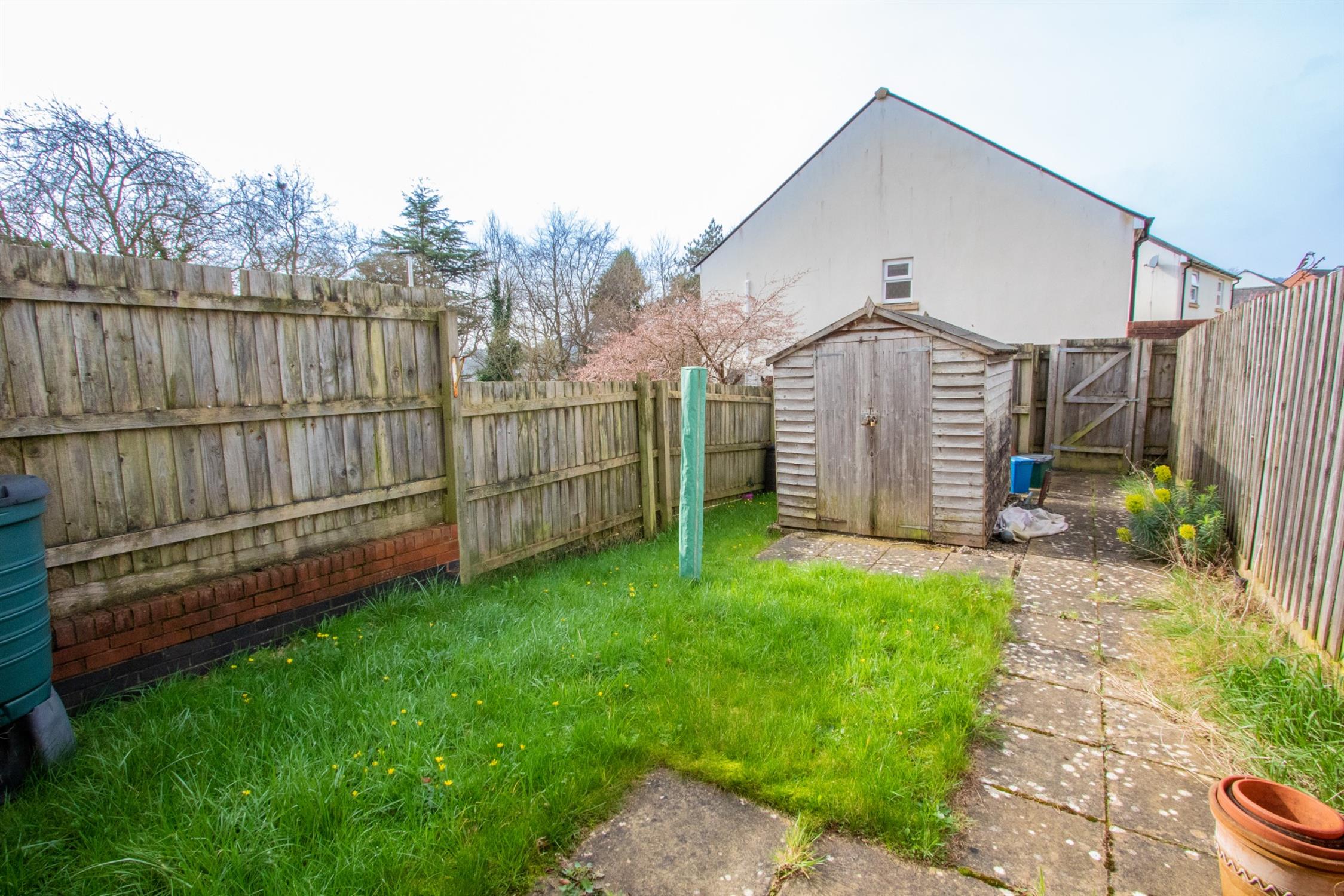 An enclosed garden with a level patio and lawn with a timber shed and outside lighting. Pedestrian access to 2 adjoining allocated parking spaces.