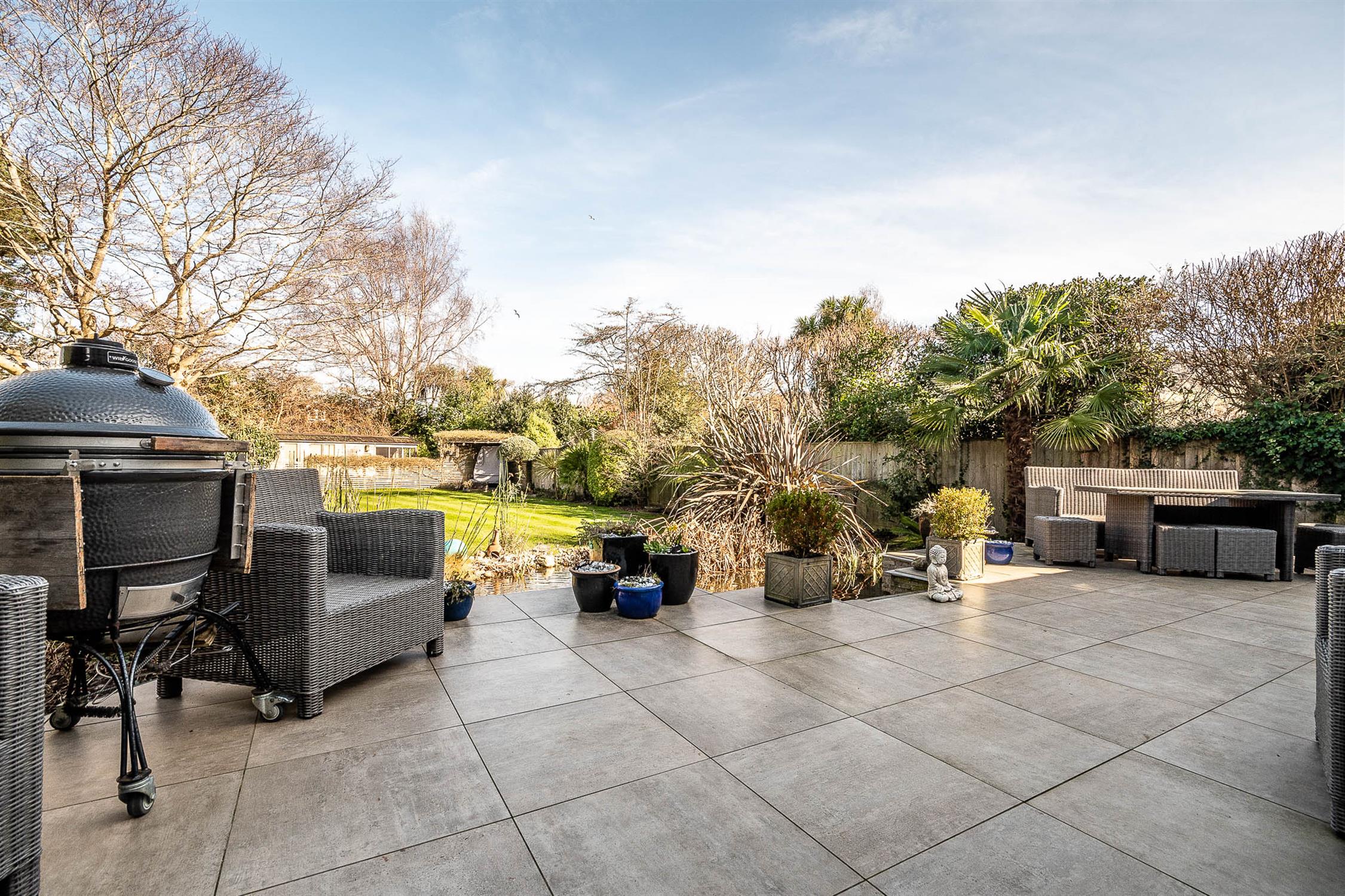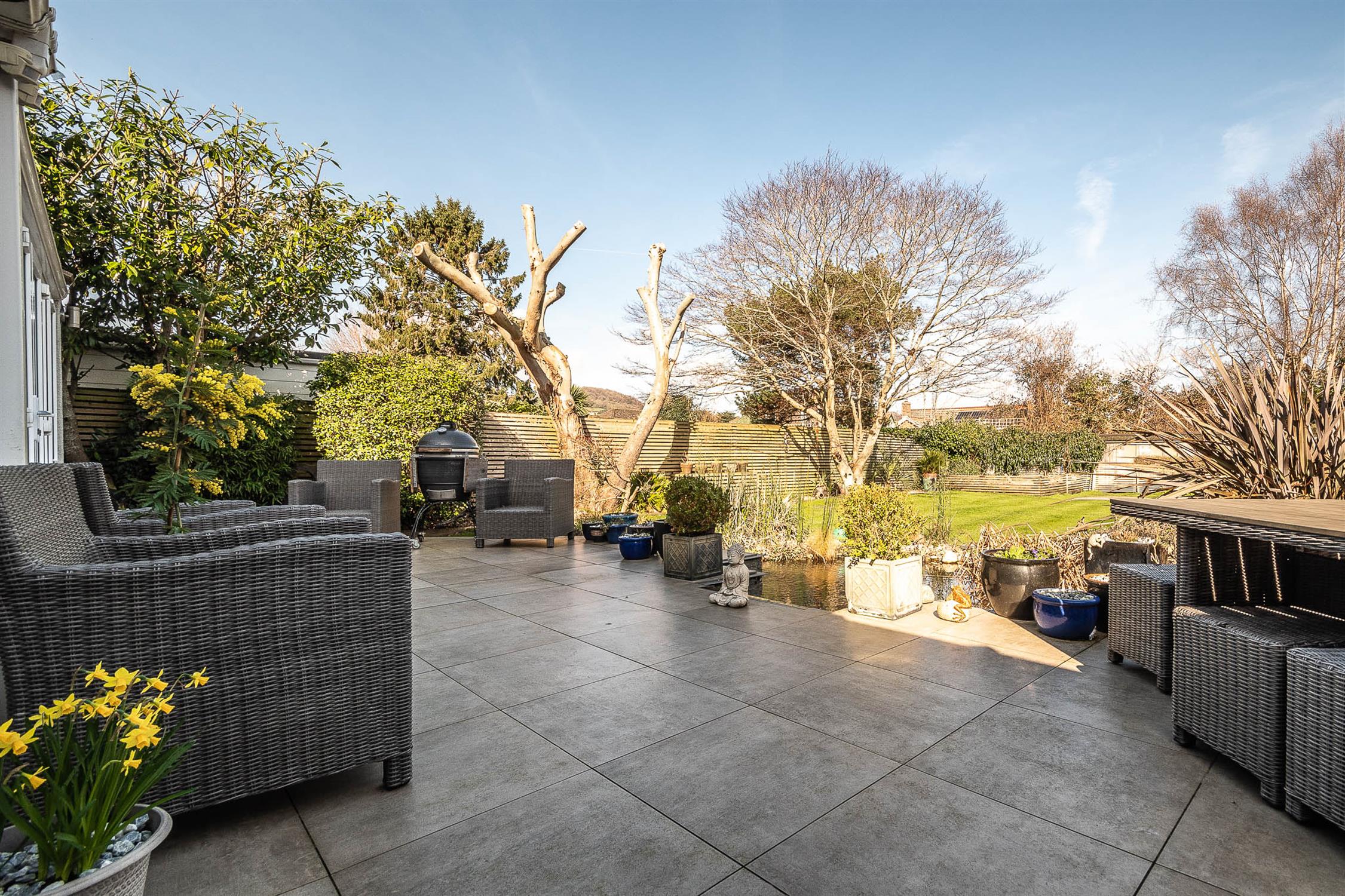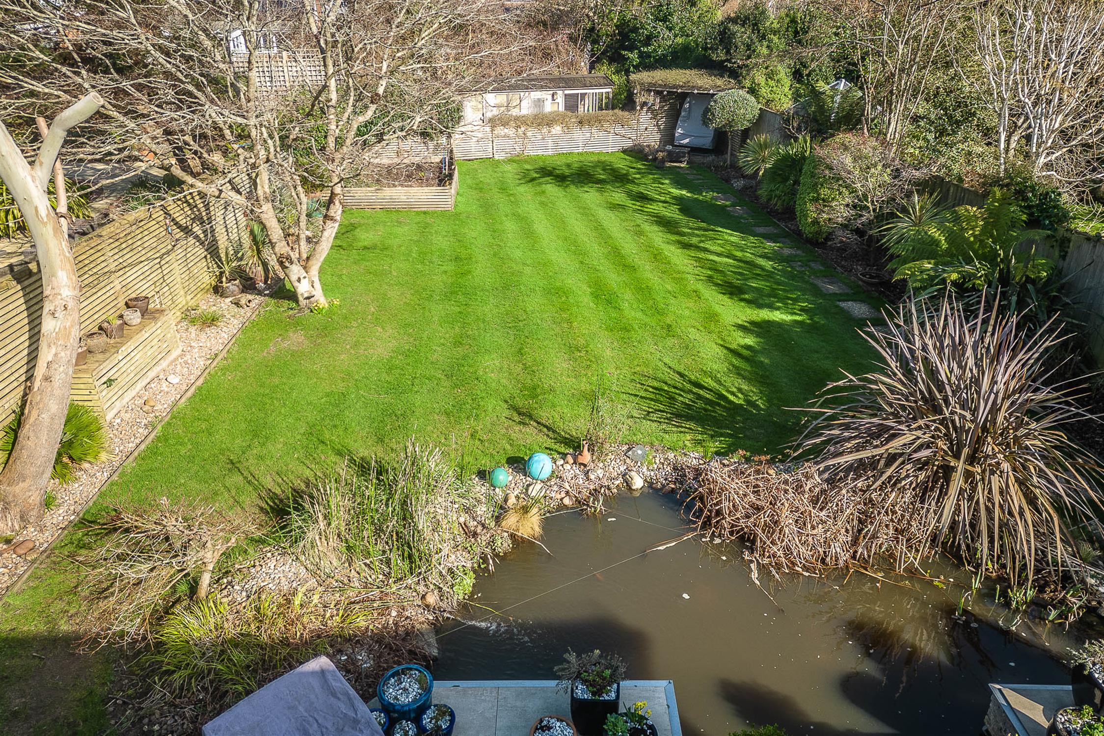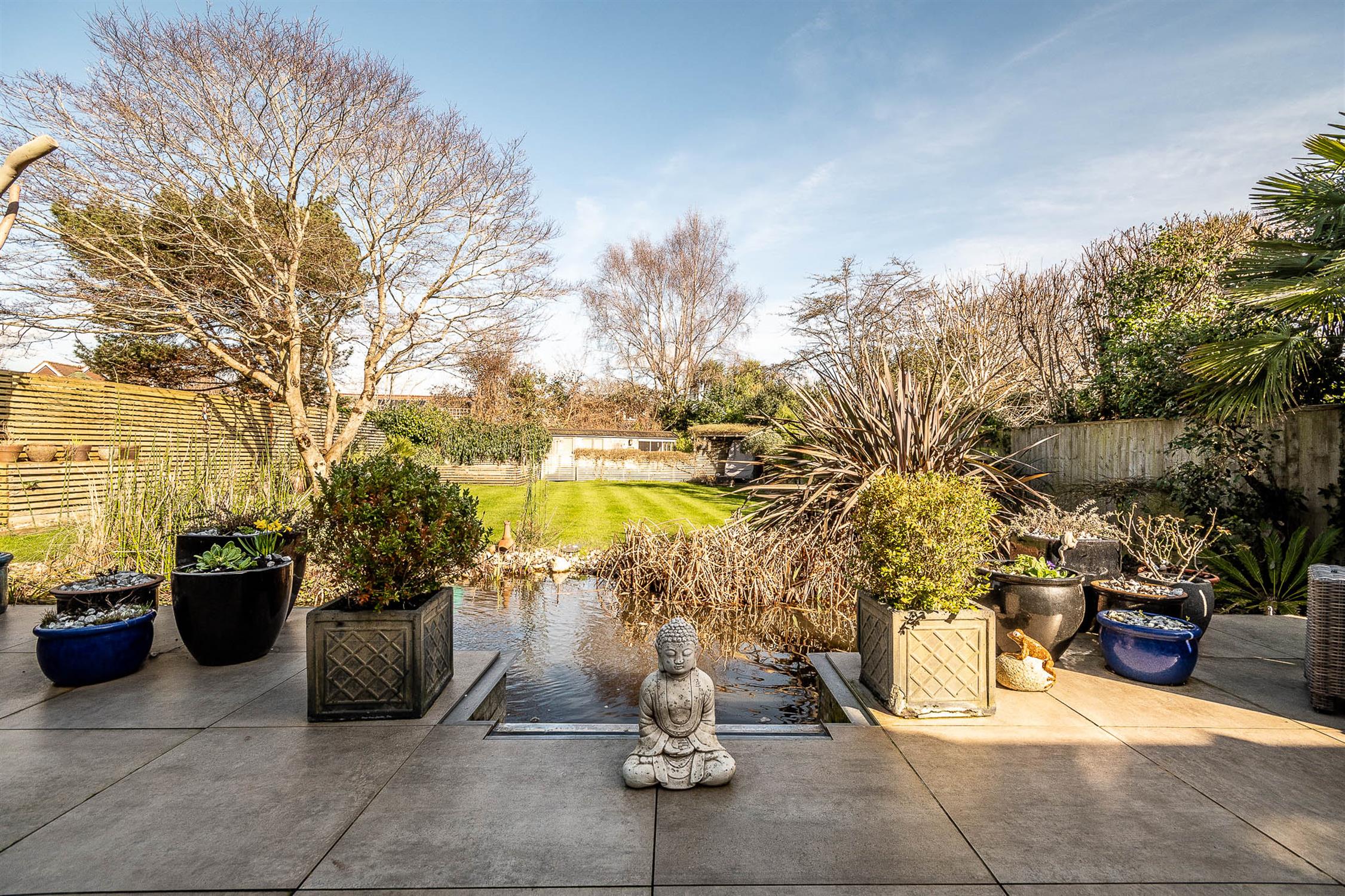 OutsideThe property benefits from a professionally landscaped garden, thoughtfully designed with lighting to create an inviting ambiance. A full-width ceramic-tiled patio overlooks a large pond with a striking blade-style waterfall, complete with integrated lighting. The garden has been styled with a Mediterranean influence, featuring palm trees, an olive tree, and a large acer, all enhanced by carefully positioned lighting. Two generously sized sheds and a dog run/kennel—easily convertible into an additional shed—provide practical storage, while the remainder of the garden is predominantly laid to lawn. Side gates provide convenient access on either side of the property.