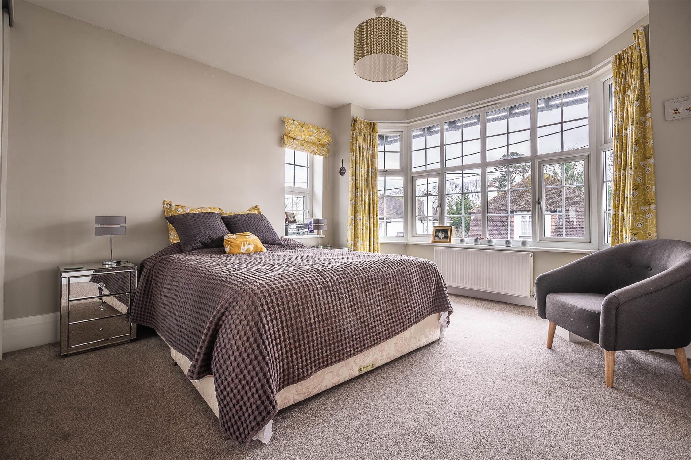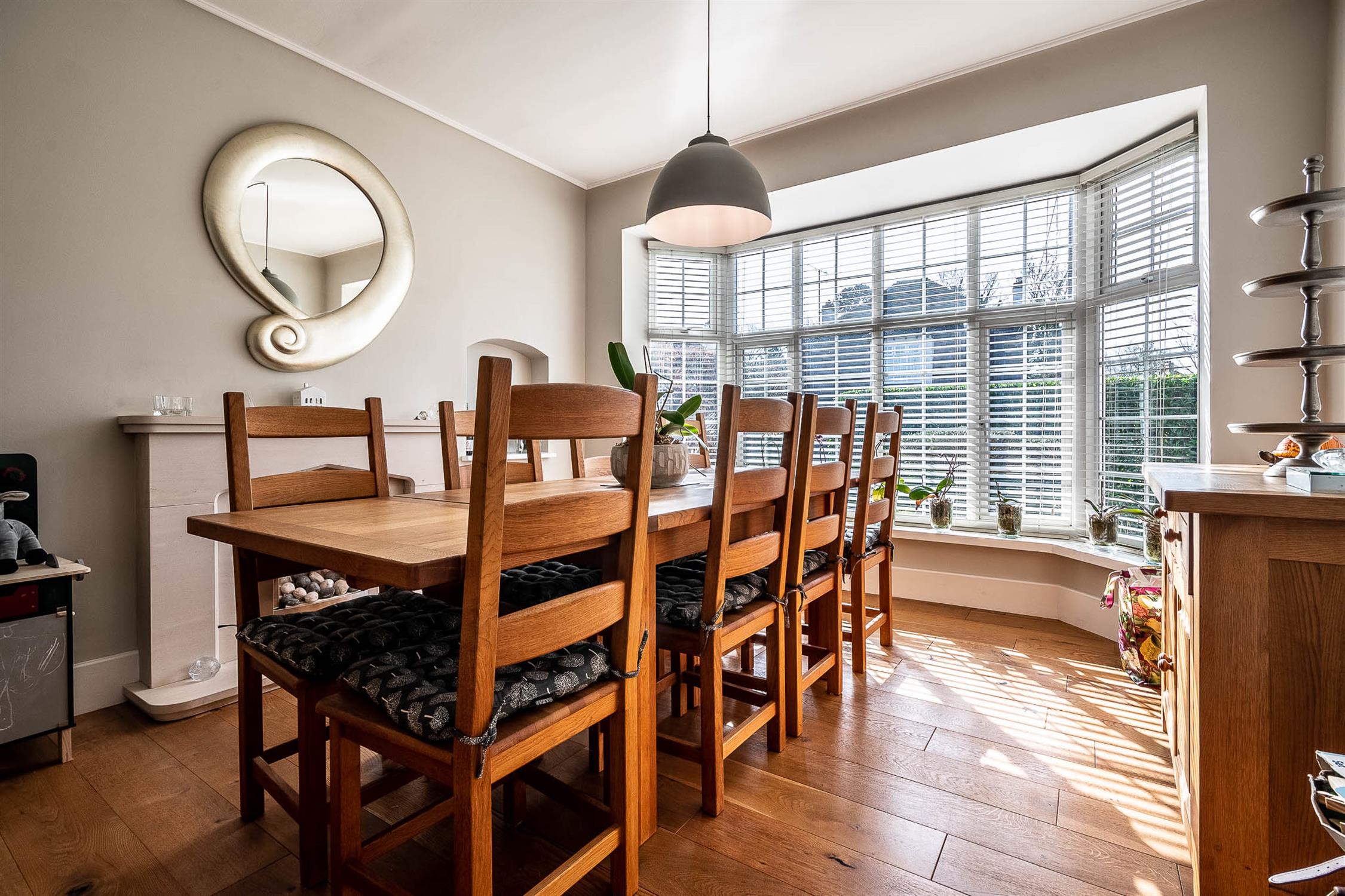 A versatile dining room, which could serve as a fifth bedroom, benefits from a bay window and feature fireplace. Completing the ground floor is a well-equipped utility room with modern units, built-in freezer, and plumbing for both a washing machine, tumble dryer, and a cloakroom.