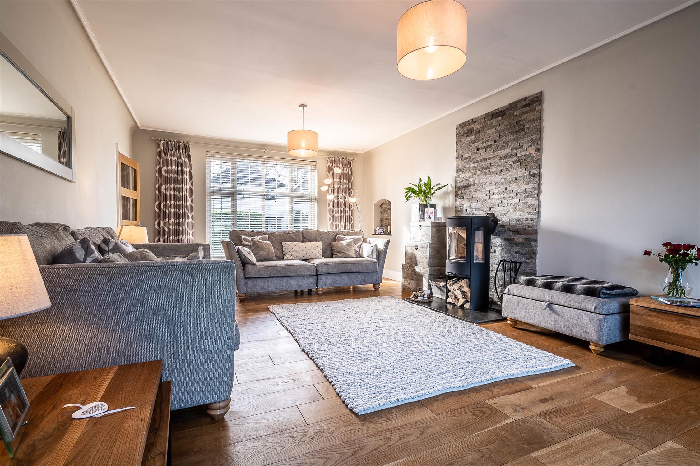 On the ground floor, a welcoming entrance hall with underfloor heating sets the tone. The generous sitting room boasts high ceilings, oak flooring, and a modern log burner with a Mandarin Stone backdrop, creating a stylish yet cosy living space.