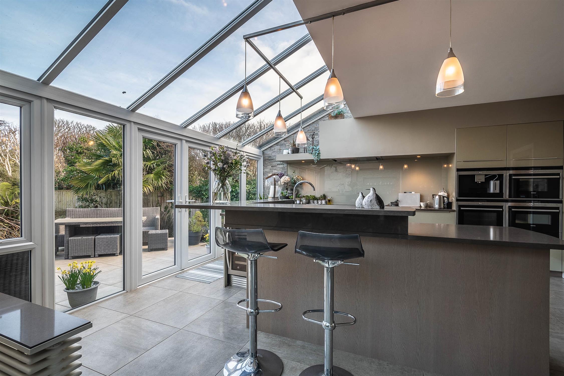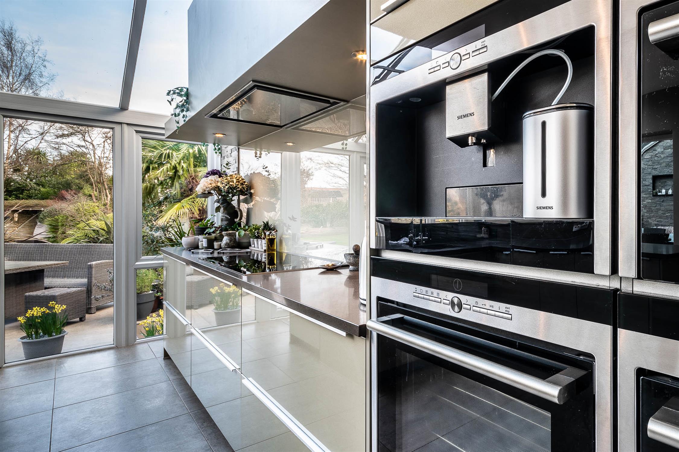The luxurious German-fitted kitchen/breakfast room is superbly appointed with a central island and breakfast bar, extensive drawer units, an induction hob with extractor, integrated fridge, coffee machine, steam combi oven, and two additional ovens (one incorporating a microwave). A striking glass vaulted ceiling floods the space with natural light. The adjoining family room features a Mandarin Stone accent wall with discreet lighting, ideal for both family living and entertaining.